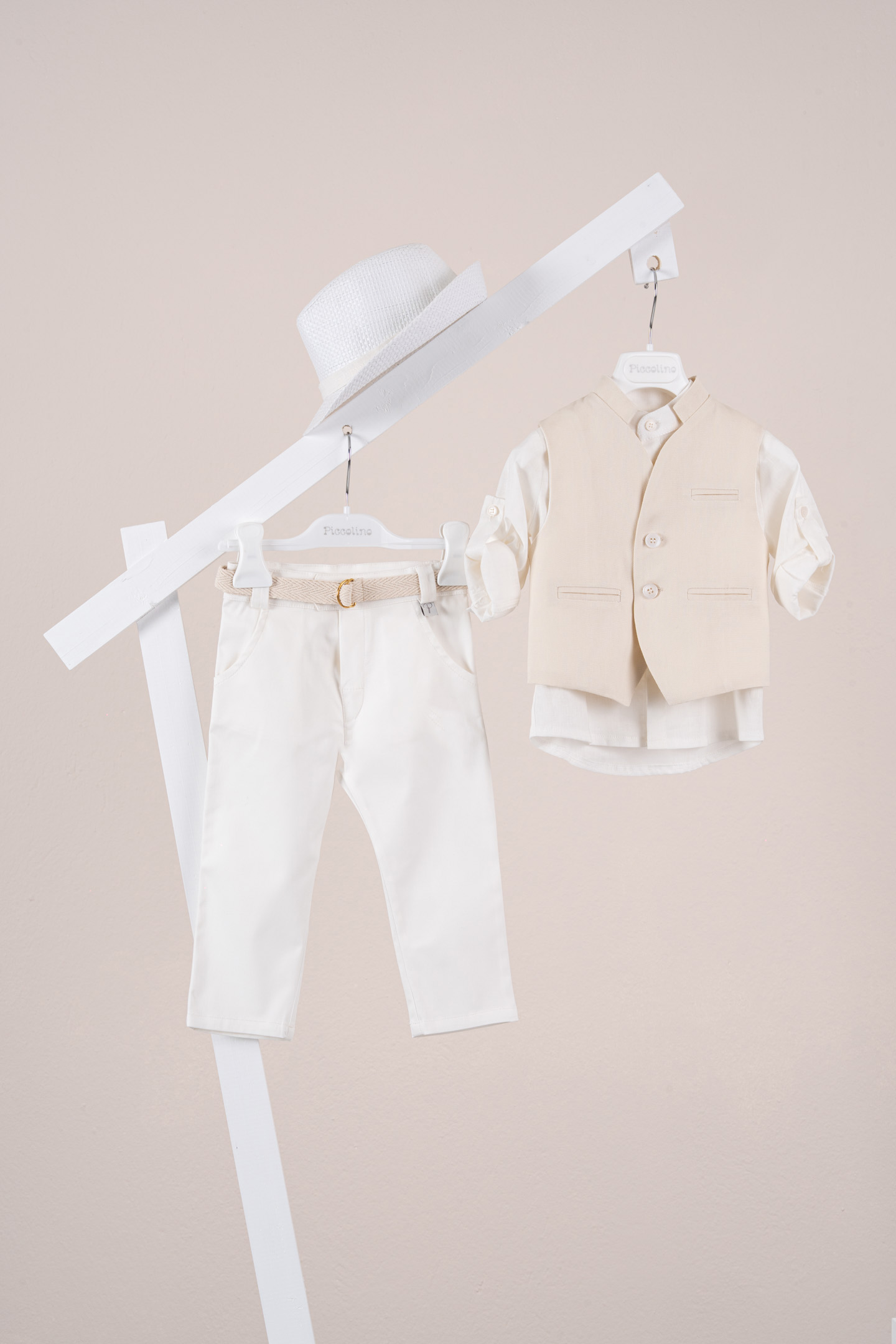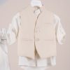 Βαπτιστικό κοστούμι Piccolino Adriano σε χρώμα Ivory. Περιλαμβάνει βαμβακερό καμπυλόγραμμο γιλέκο, πουκάμισο λινό με μάο γιακά, παντελόνι βαμβακερό σε χρώμα Ivory, ζώνη με double D δέσιμο και καπέλο με φάσα. Διαθέσιμο σε 4 μεγέθη 6-12, 12-18, 18-24, 24-36(εξτρά χρέωση)