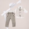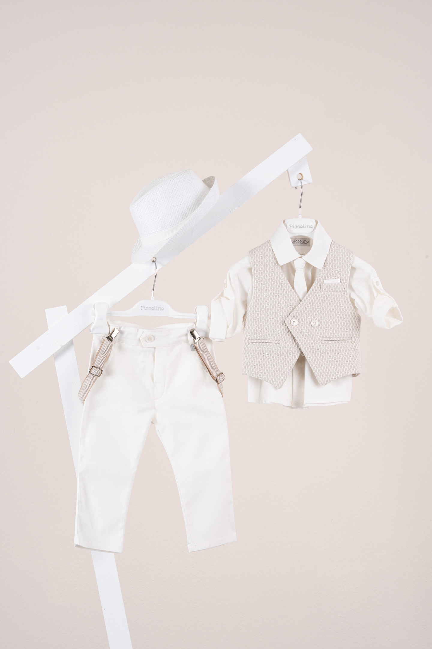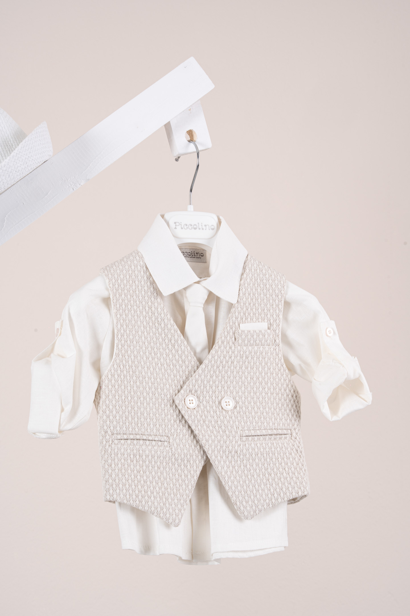 Βαπτιστικό κοστούμι Piccolino Andre-26 σε χρώμα Ivory. Περιλαμβάνει γιλέκο δίκουμπο σταυρωτό με μύτη, πουκάμισο λινό, παντελόνι βαμβακερό σε χρώμα Ivory, γραβάτα, τιράντες και καπέλο με φάσα. Διαθέσιμο σε 4 μεγέθη 6-12, 12-18, 18-24, 24-36(εξτρά χρέωση)