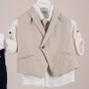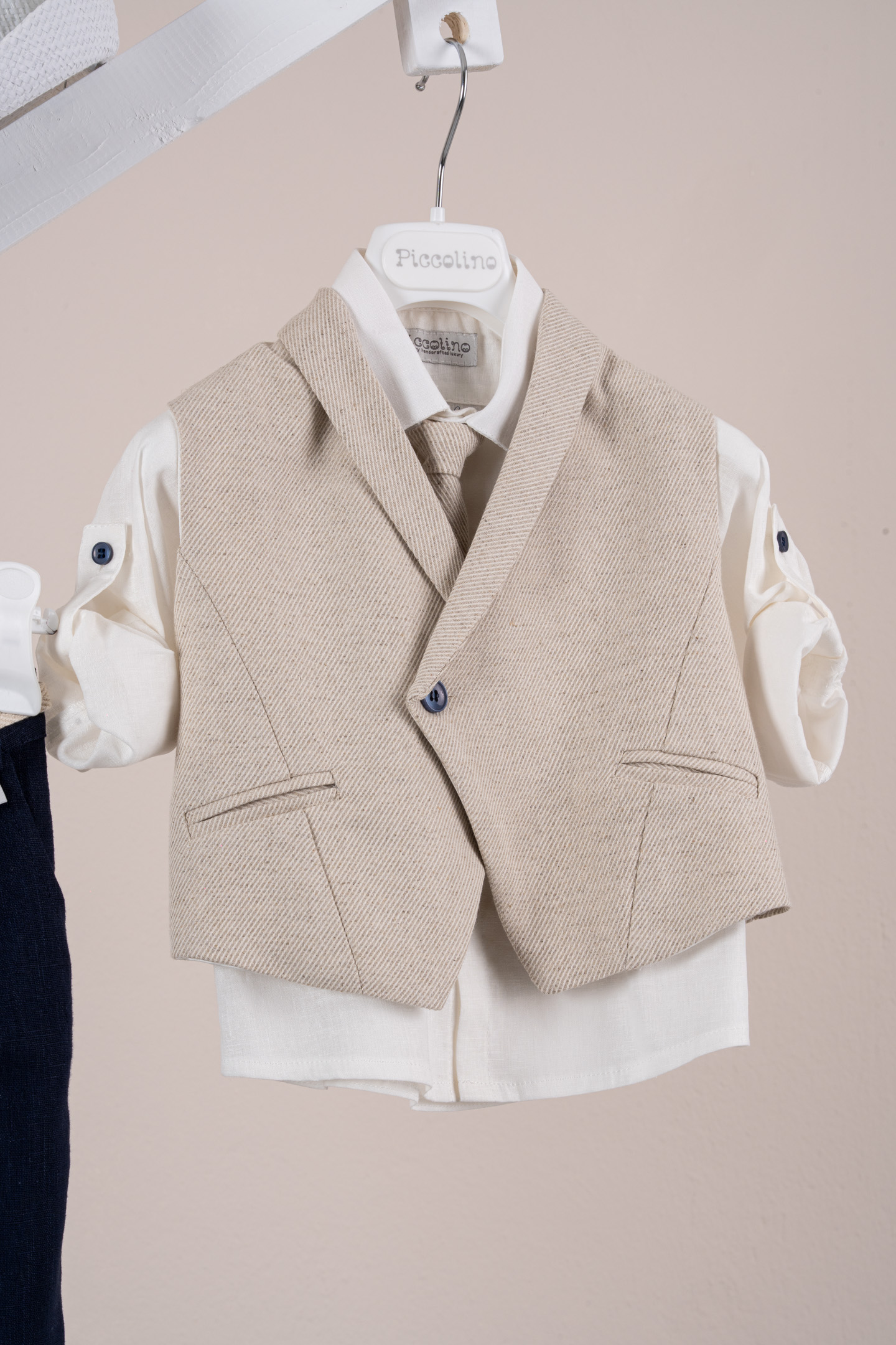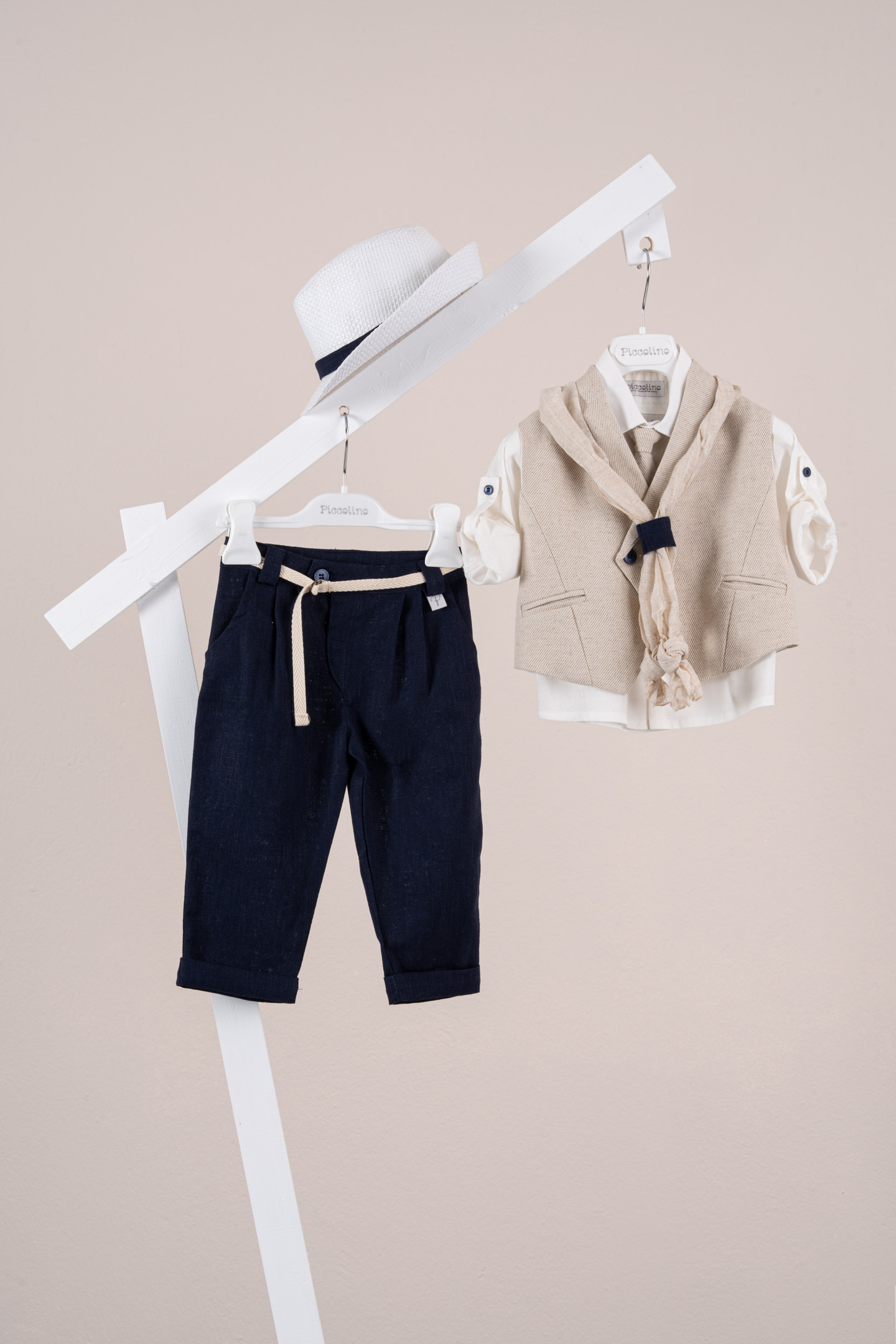 Βαπτιστικό κοστούμι Piccolino Enzo σε χρώμα Navy. Περιλαμβάνει γιλέκο σταυρωτό με μύτη μονόκουμπο, πουκάμισο λινό, παντελόνι λινό με πιέτες σε χρώμα Navy, γραβάτα, φουλάρι λινό με δέσιμο σε ίδια απόχρωση με το παντελόνι, ζωνάκι με double D δέσιμο και καπέλο με φάσα. Διαθέσιμο σε 4 μεγέθη 6-12, 12-18, 18-24, 24-36(εξτρά χρέωση)