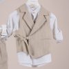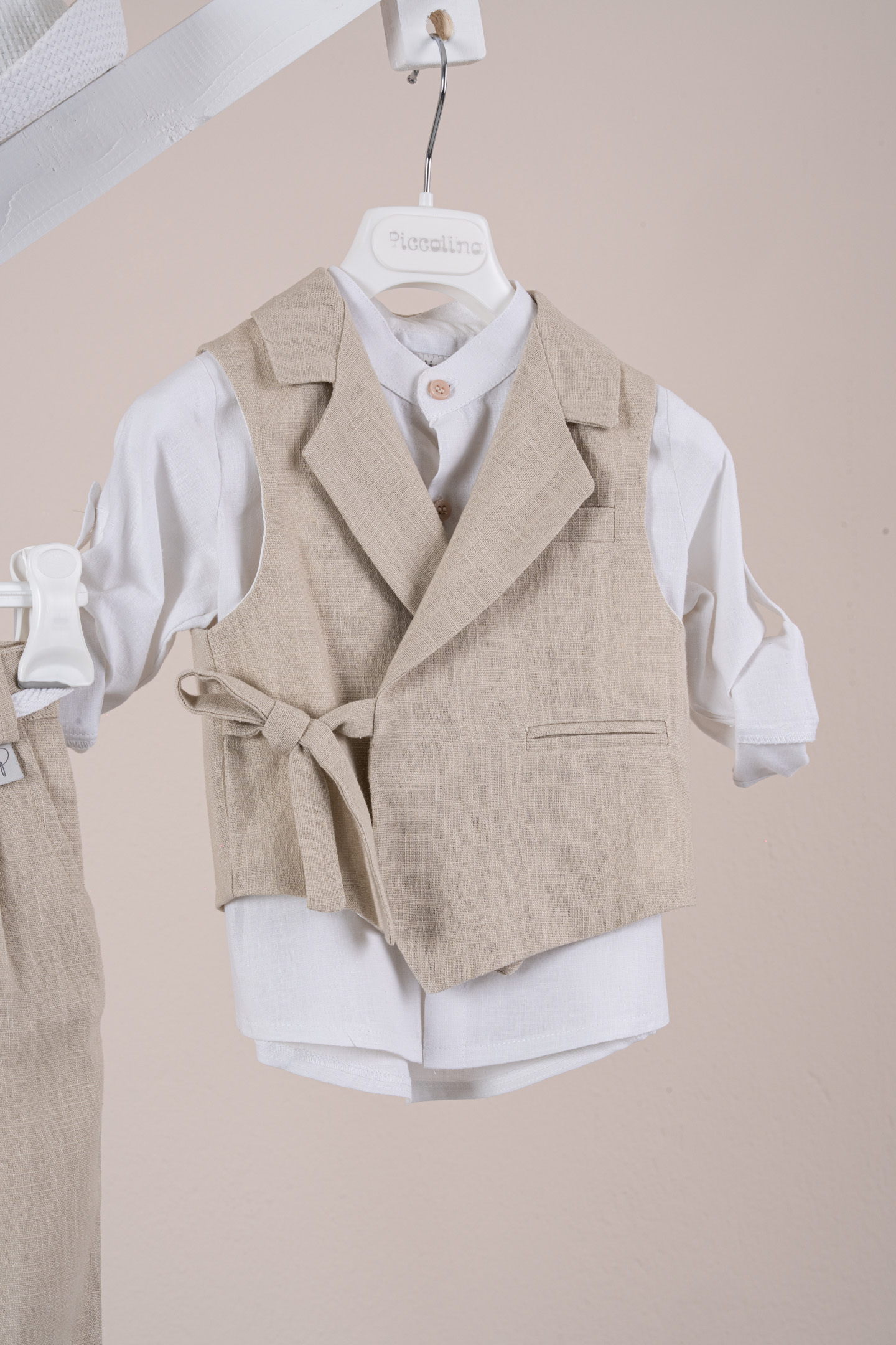 Βαπτιστικό κοστούμι Piccolino Fabio σε χρώμα Beige. Περιλαμβάνει λινό γιλέκο με δέσιμο στο πλάι, πουκάμισο λινό με μάο γιακά, παντελόνι λινό με πιέτες σε χρώμα Beige, ζωνάκι με double D δέσιμο και καπέλο με φάσα. Διαθέσιμο σε 4 μεγέθη 6-12, 12-18, 18-24, 24-36(εξτρά χρέωση)