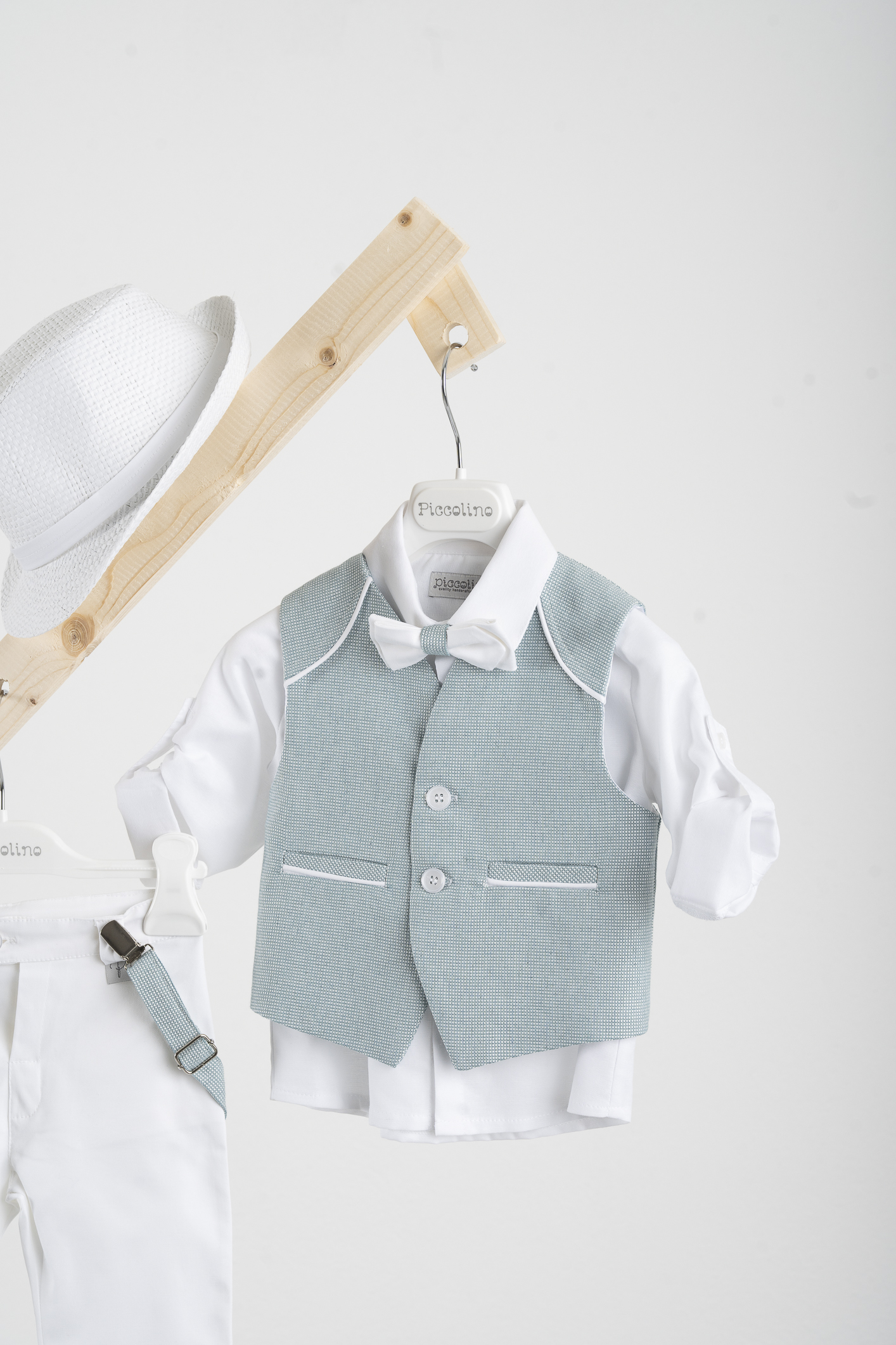 Βαπτιστικό κοστούμι Piccolino Francisco σε χρώμα Mint-White. Περιλαμβάνει δίχρωμο γιλέκο με διακοσμητικούς ωμίτες, πουκάμισο βαμβακερό λευκό, παντελόνι βαμβακερό σε χρώμα white, παπιγιόν με διχρωμία, ζώνη με double D δέσιμο και καπέλο με φάσα. Διαθέσιμο σε 4 μεγέθη 6-12, 12-18, 18-24, 24-36(εξτρά χρέωση)