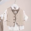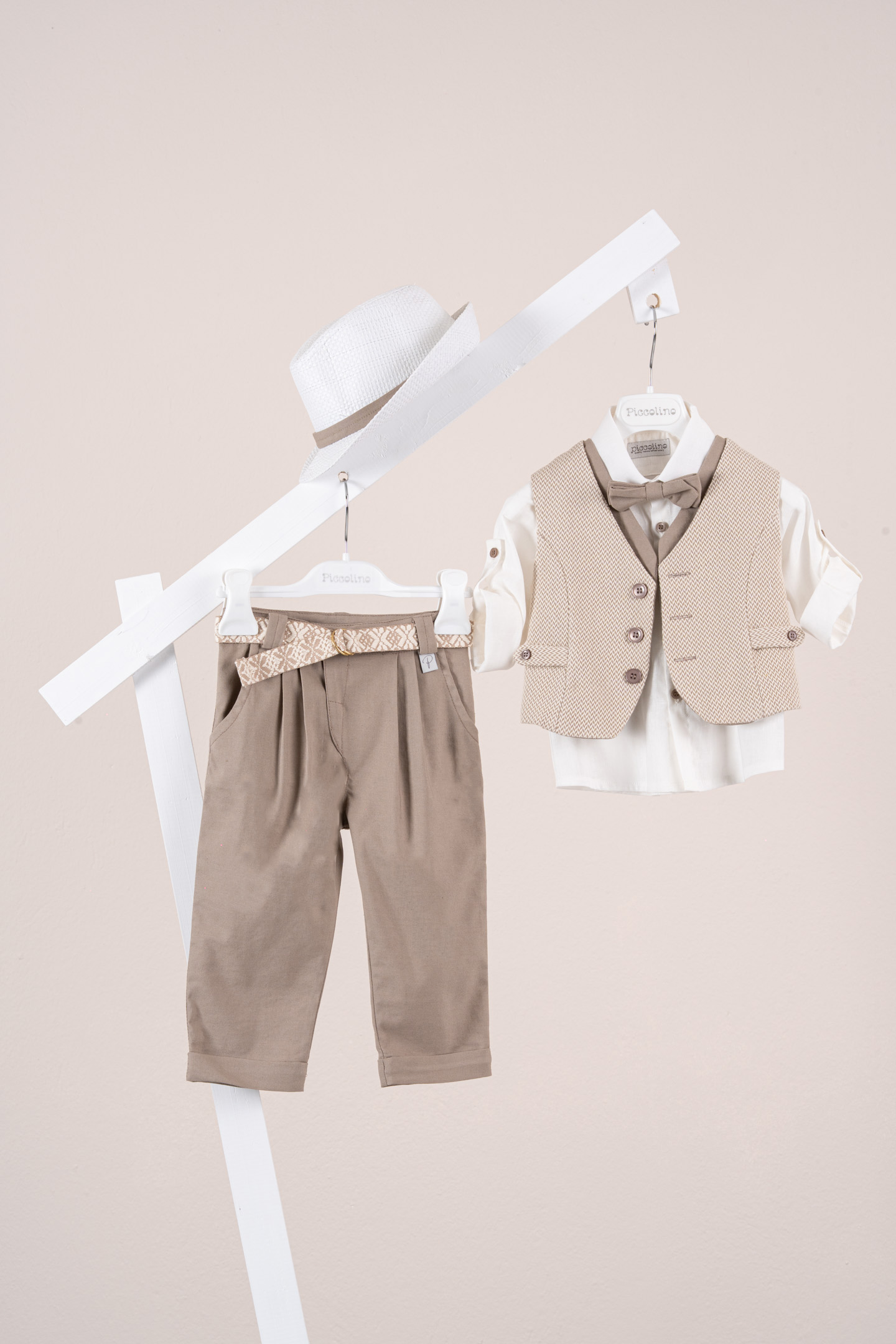 Βαπτιστικό κοστούμι Piccolino Giulio σε χρώμα Mocha. Περιλαμβάνει γιλέκο με διπλή μόστρα σε διχρωμία, πουκάμισο λινό, παντελόνι λινό με πιέτες σε χρώμα Mocha, παπιγιόν, ζώνη και καπέλο με φάσα. Διαθέσιμο σε 4 μεγέθη 6-12, 12-18, 18-24, 24-36(εξτρά χρέωση)