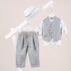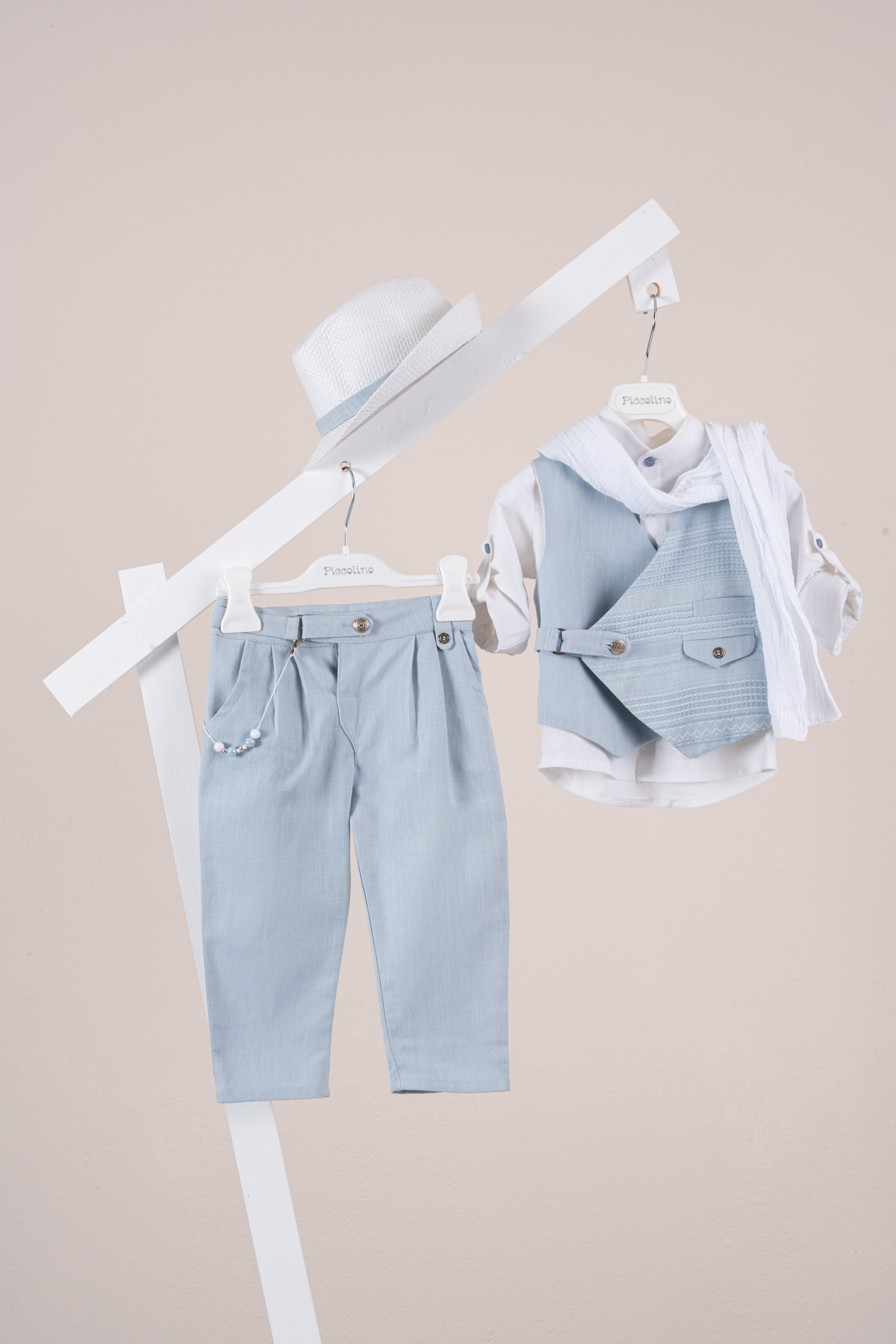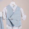Βαπτιστικό κοστούμι Piccolino Jose σε χρώμα Light Blue. Περιλαμβάνει σταυρωτό λινό γιλέκο με διακοσμητικά μεταλικά κουμπια και ιμάντα με D δέσιμο, πουκάμισο mao λινό, παντελόνι λινό με πιέτες και διακοσμητικό κρεμαστό με χάντρες σε χρώμα white, φουλάρι και καπέλο με φάσα. Διαθέσιμο σε 4 μεγέθη 6-12, 12-18, 18-24, 24-36(εξτρά χρέωση)