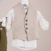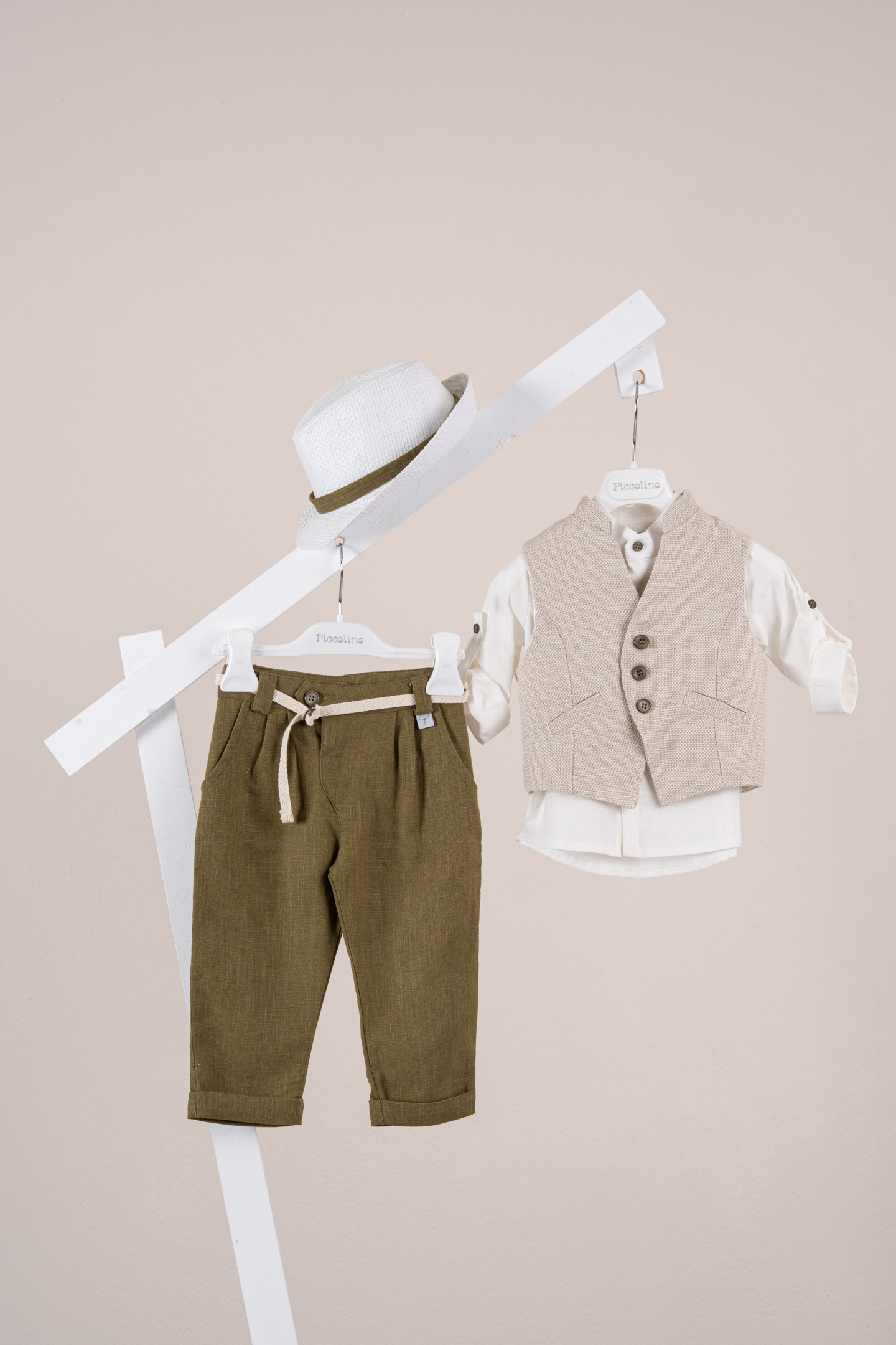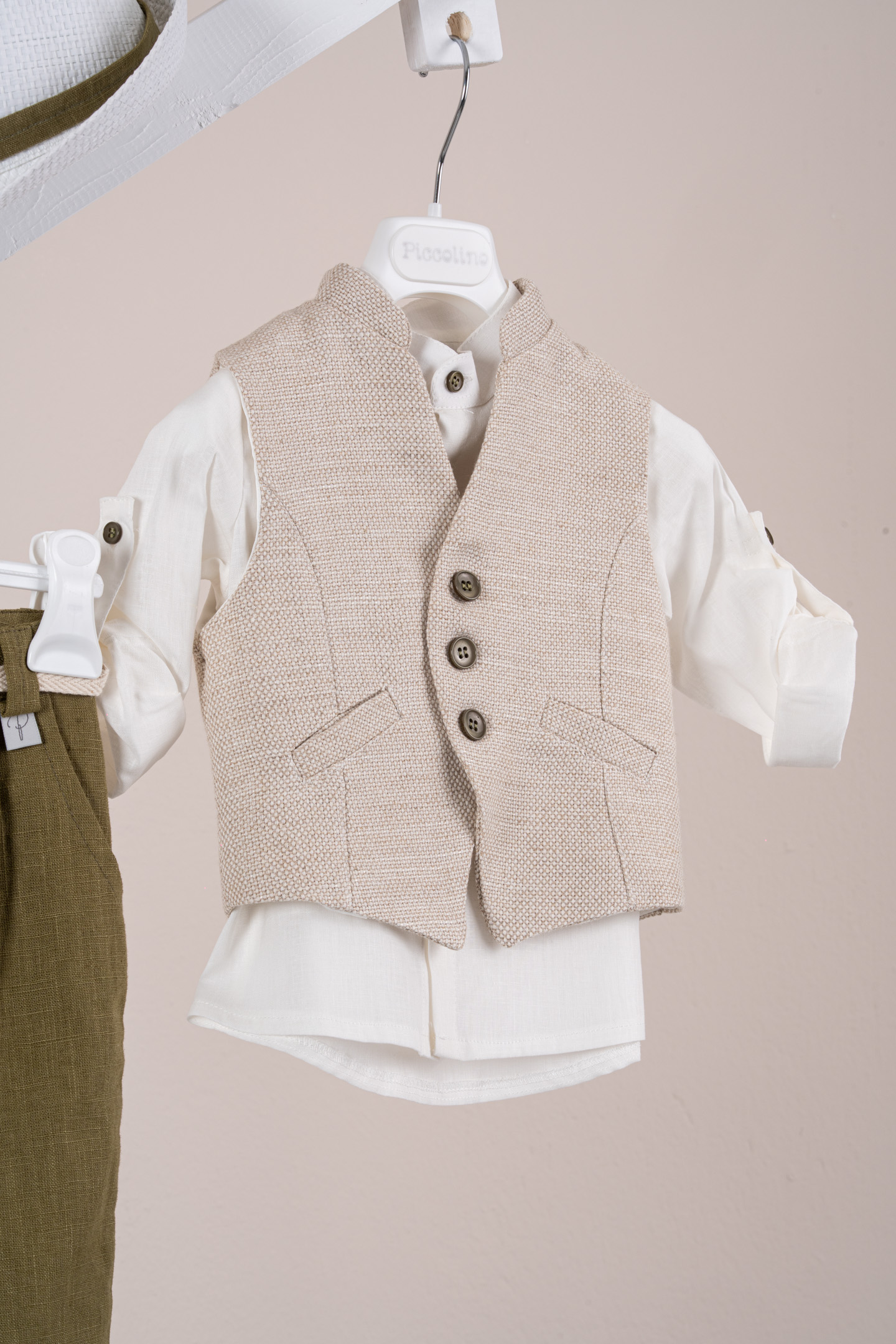 Βαπτιστικό κοστούμι Piccolino Logan σε χρώμα Golden Olive. Περιλαμβάνει καμπυλόγραμμο βαμβακερό γιλέκο , πουκάμισο λινό με γιακά μάο, παντελόνι λινό με πιέτες σε χρώμα Golden Olive, ζωνάκι με double D δέσιμο και καπέλο με φάσα. Διαθέσιμο σε 4 μεγέθη 6-12, 12-18, 18-24, 24-36(εξτρά χρέωση)