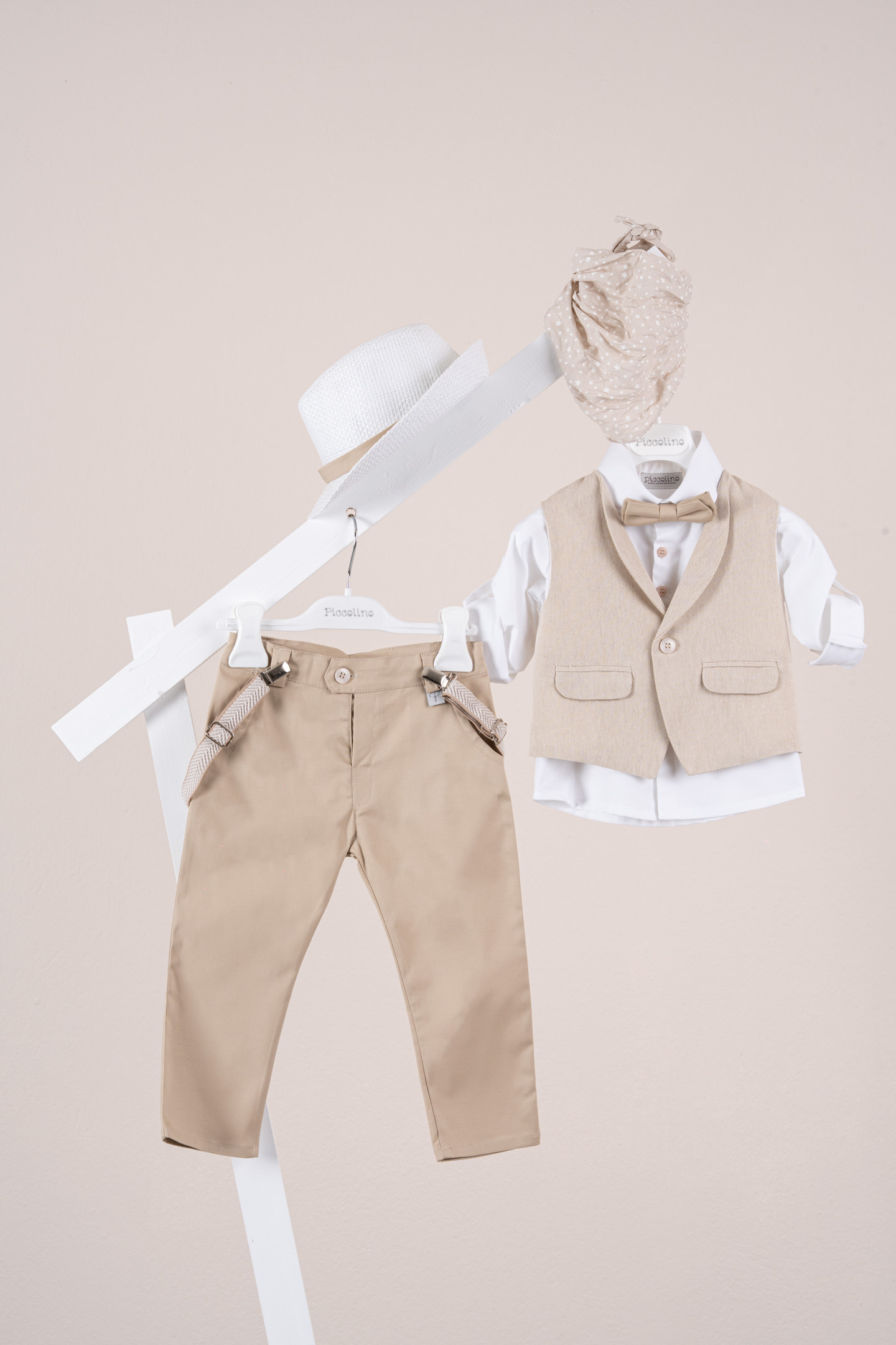 Βαπτιστικό κοστούμι Piccolino Nico σε χρώμα Beige. Περιλαμβάνει γιλέκο μονόκουμπο με πέτο, πουκάμισο βαμβακερό λευκό, παντελόνι βαμβακερό σε χρώμα Beige, παπιγιόν, τιράντες και καπέλο με φάσα. Διαθέσιμο σε 4 μεγέθη 6-12, 12-18, 18-24, 24-36(εξτρά χρέωση)