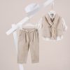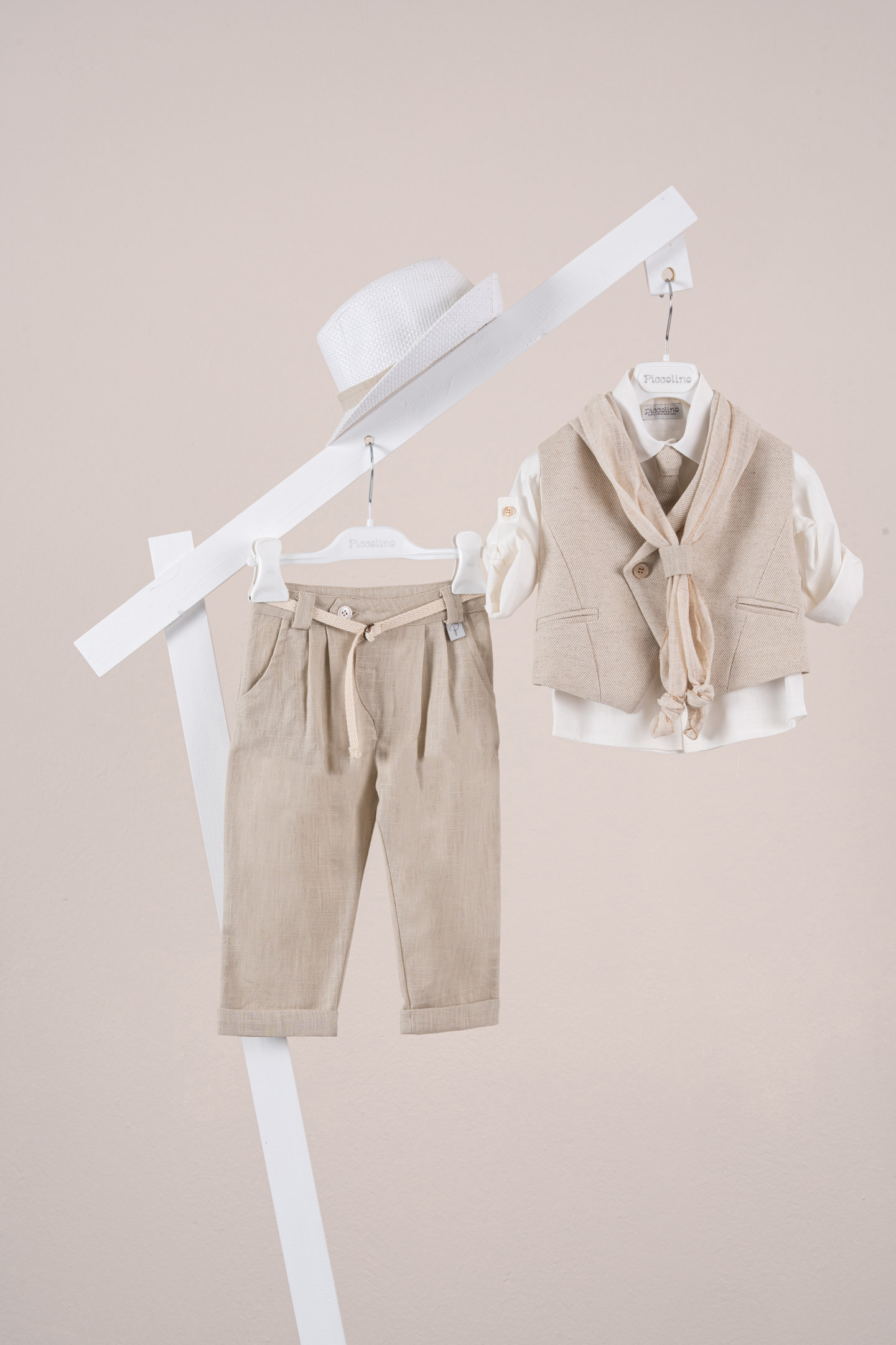 Βαπτιστικό κοστούμι Piccolino Enzo σε χρώμα Beige. Περιλαμβάνει γιλέκο σταυρωτό με μύτη μονόκουμπο, πουκάμισο λινό, παντελόνι λινό με πιέτες σε χρώμα Beige, γραβάτα, φουλάρι λινό με δέσιμο σε ίδια απόχρωση με το παντελόνι, ζωνάκι με double D δέσιμο και καπέλο με φάσα. Διαθέσιμο σε 4 μεγέθη 6-12, 12-18, 18-24, 24-36(εξτρά χρέωση)