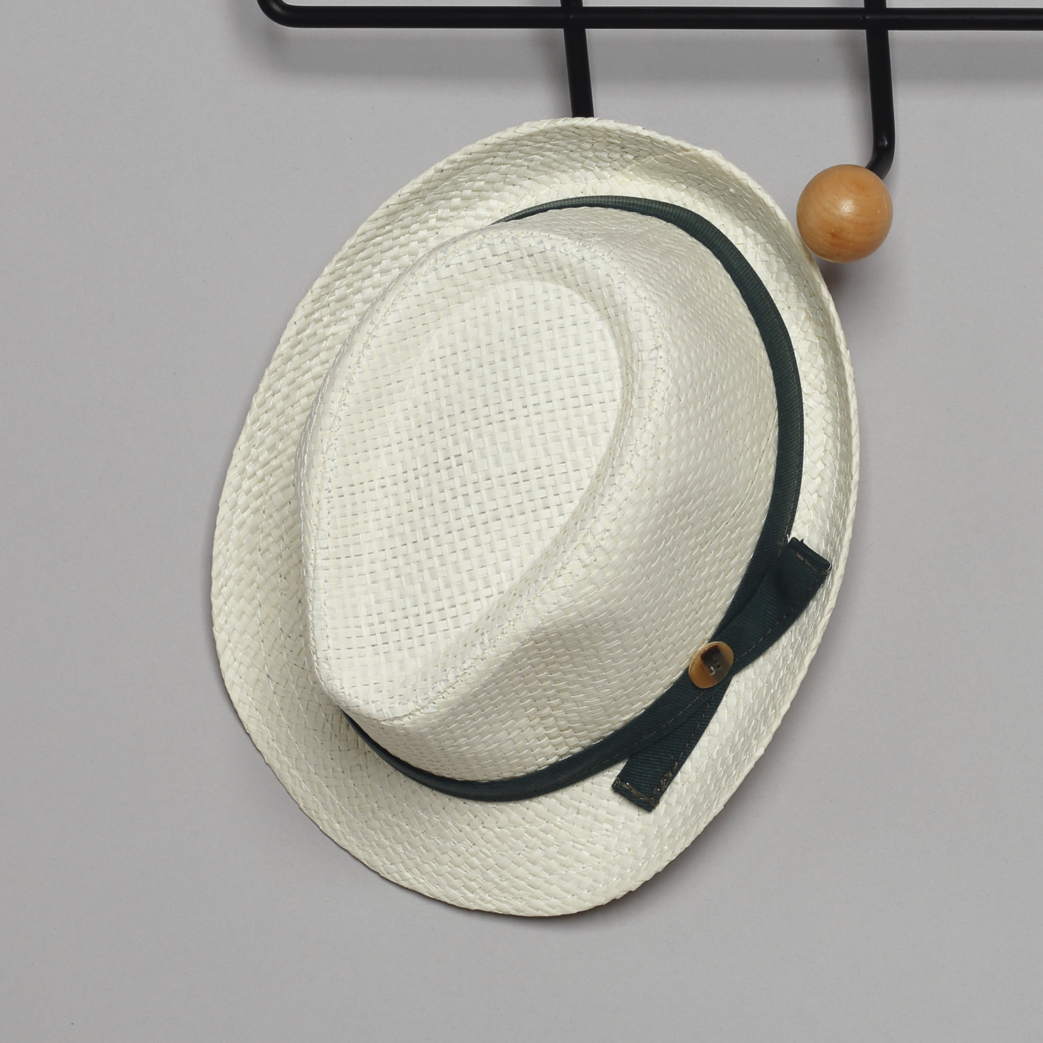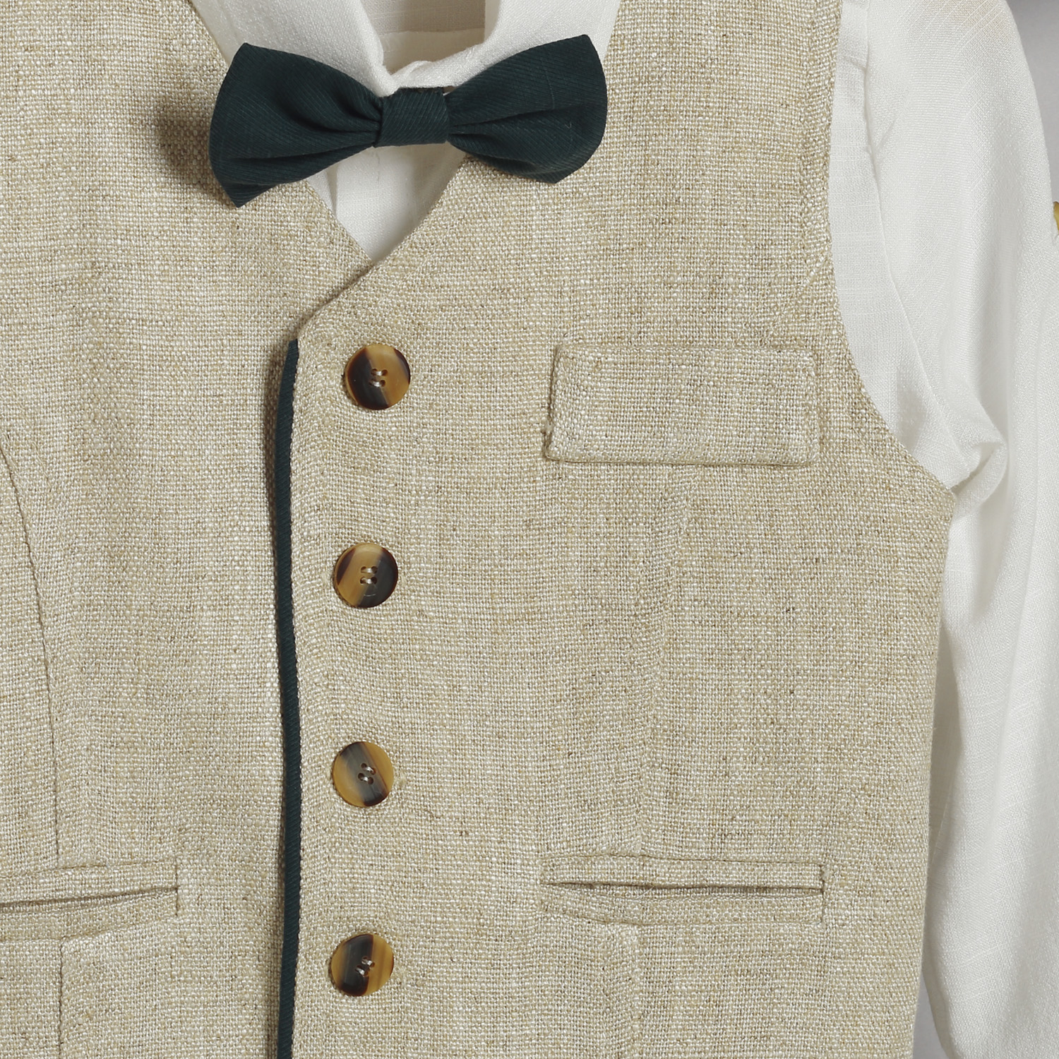 Το σύνολο συνοδεύεται με υφασμάτινο παπιόν και ψάθινο εκρού καβουράκι με κορδέλα από το ύφασμα του παντελονιού.