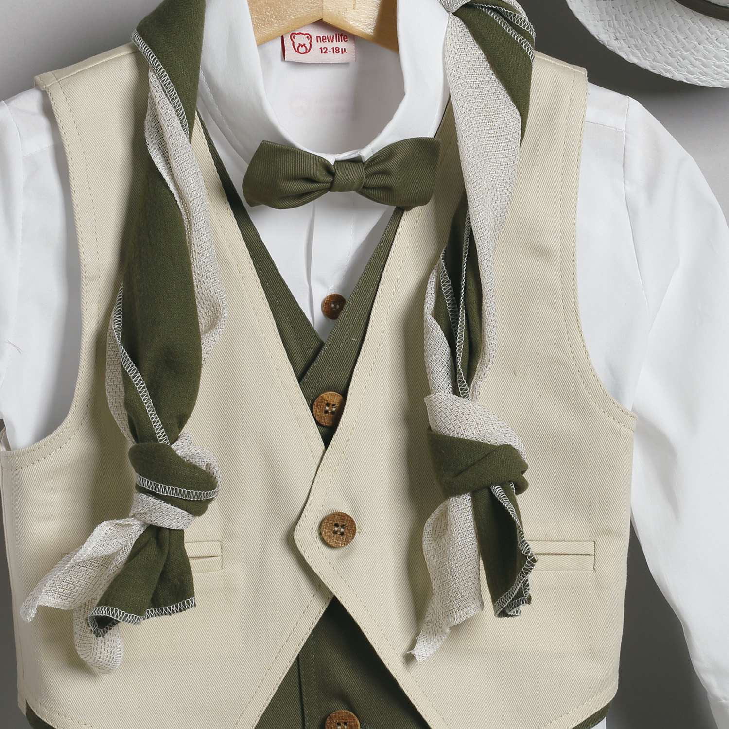 Το σύνολο συνοδεύεται με υφασμάτινο παπιόν,φουλάρι και ψάθινο άσπρο καβουράκι με κορδέλα από το ύφασμα του παντελονιού.