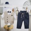 Ένα εκλεπτυσμένο βαπτιστικό σύνολο για αγόρι που συνδυάζει την κλασική αισθητική με μοντέρνες λεπτομέρειες. Το σετ αποτελείται από υπόλευκο λινό πουκάμισο, το οποίο προσφέρει δροσερή και άνετη εφαρμογή, ιδανική για τις ζεστές καλοκαιρινές ημέρες. Συνδυάζεται αρμονικά με μπεζ γιλέκο σε κομψή γραμμή προσθέτοντας μια ιδιαίτερη και εκλεπτυσμένη πινελιά στο σύνολο. Το γιλέκο διαθέτει διακοσμητικά κουμπιά και τσεπάκι με μαντηλάκι σε σκούρα μπλε απόχρωση που δημιουργεί μια όμορφη χρωματική αντίθεση. Το σύνολο συμπληρώνεται με κομψό παπιγιόν σε μπεζ και μπλε τόνους που προσθέτει μια διακριτική πινελιά φινέτσας. Το παντελόνι σε σκούρο ραφ χρώμα διαθέτει άνετη γραμμή και ξεχωρίζει με το διακοσμητικό πλεκτό κορδόνι στη μέση σε μπεζ και μπλε αποχρώσεις. Ένα ιδιαίτερο βαπτιστικό σύνολο που αποπνέει κομψότητα, καλοκαιρινή φρεσκάδα και διαχρονικό στυλ, ιδανικό για να χαρίσει στο μικρό σας μια ξεχωριστή εμφάνιση