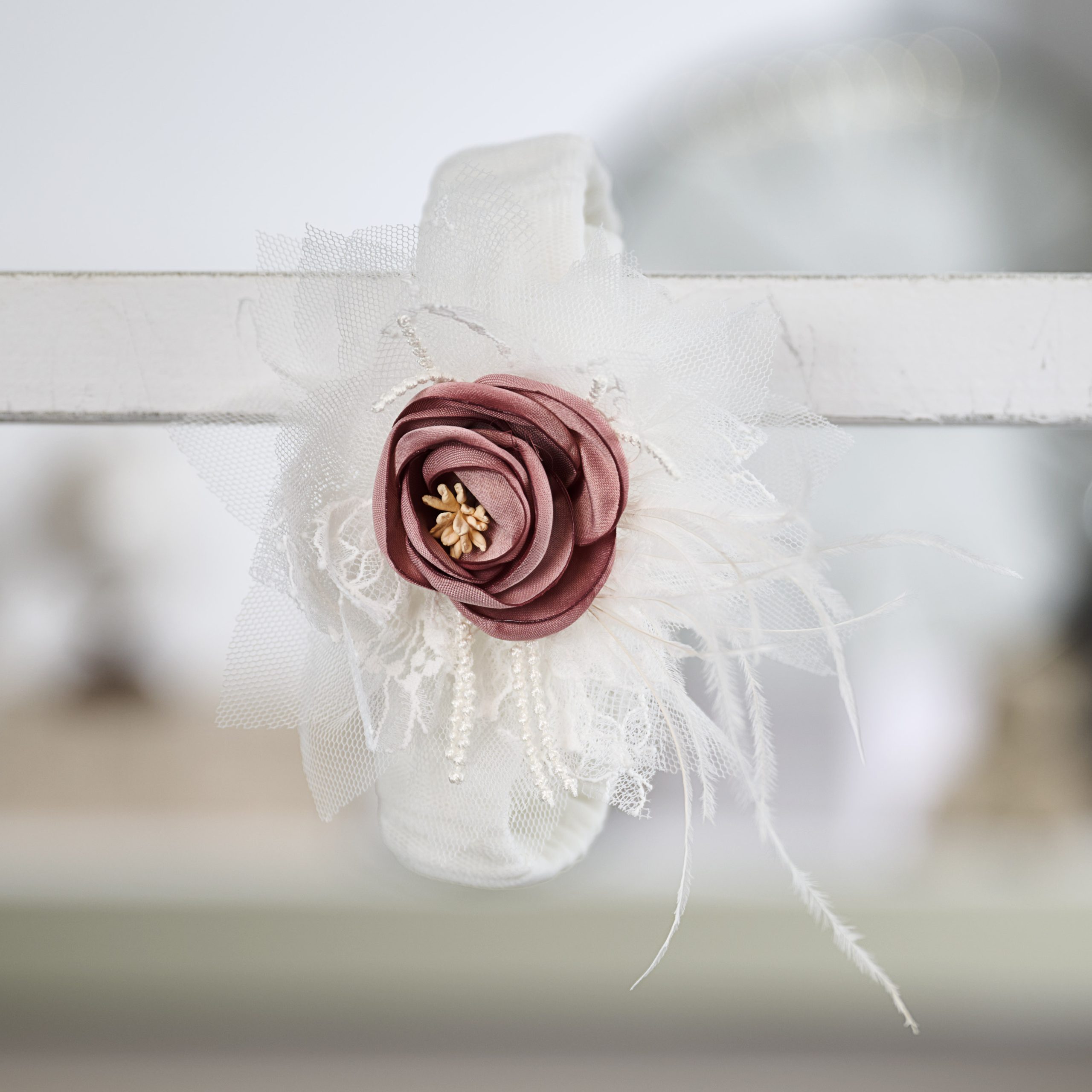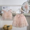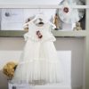 Το σύνολο συμπληρώνεται από ασορτί κορδέλα μαλλιών σε ιβουάρ τόνο, διακοσμημένη με τούλι και υφασμάτινο λουλούδι στην ίδια απόχρωση, ολοκληρώνοντας αρμονικά την εμφάνιση.
