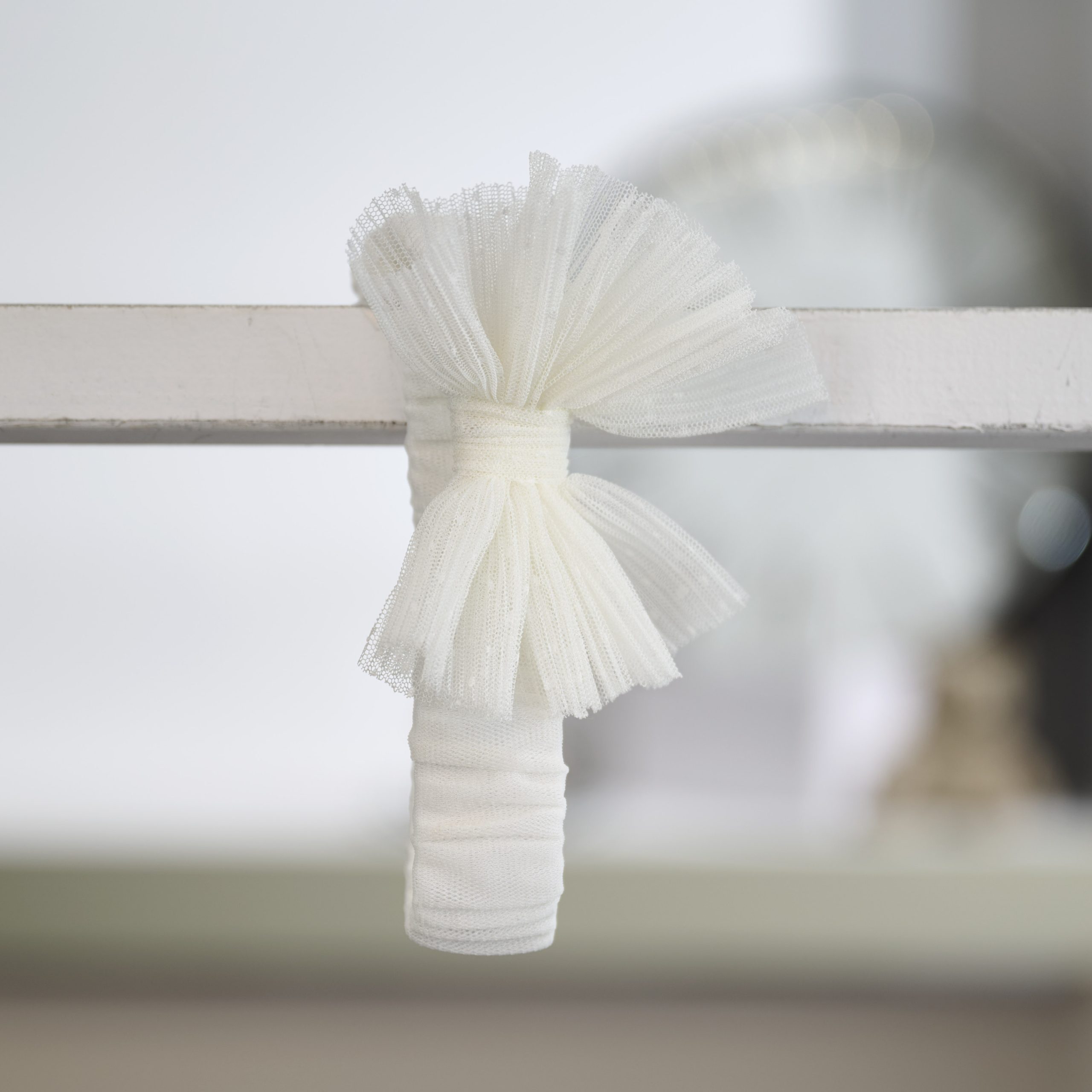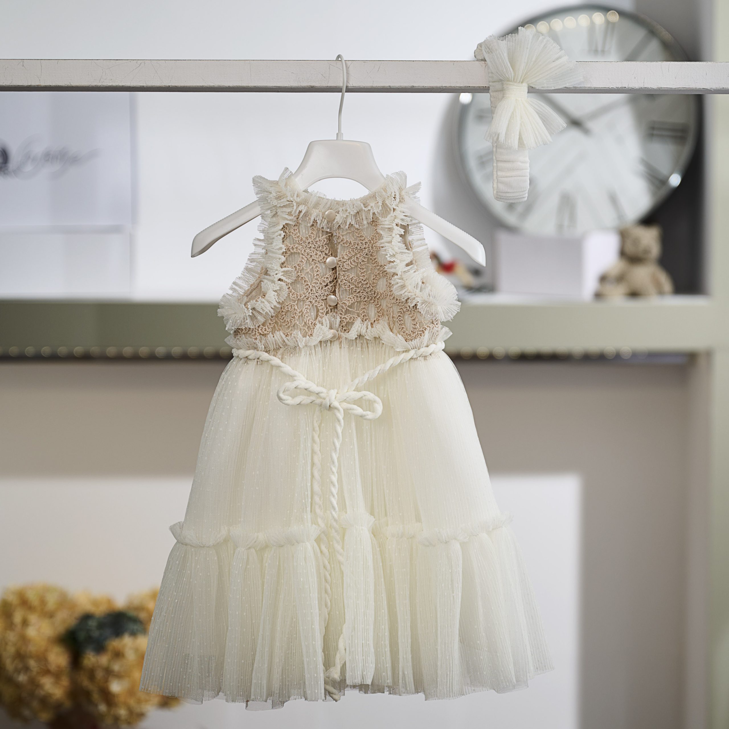 Το σύνολο συμπληρώνεται από ασορτί κορδέλα μαλλιών σε ιβουάρ τόνο, διακοσμημένη με τούλινο φιόγκο, ολοκληρώνοντας κομψά την εμφάνιση.