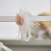 Το κορσάζ είναι κατασκευασμένο από φίνο τούλι με διακριτικό glitter και κομψή διαφάνεια στο επάνω μέρος, ενώ στο κέντρο του φορέματος ξεχωρίζει ένα χειροποίητο λουλούδι σε απόχρωση σαπιο μήλο, διακοσμημένο με περίτεχνη τρέσα που χαρίζει μια ιδιαίτερα φίνα αισθητική. Στο πίσω μέρος το φόρεμα ολοκληρώνεται με έναν κομψό τούλινο φιόγκο, που προσθέτει μια ρομαντική πινελιά στο σύνολο.Το σύνολο συμπληρώνεται από ασορτί κορδέλα μαλλιών διακοσμημένη με χειροποίητο λουλούδι σε απόχρωση σομόν, τούλι και διακριτικά φτερά, ολοκληρώνοντας κομψά την εμφάνιση.