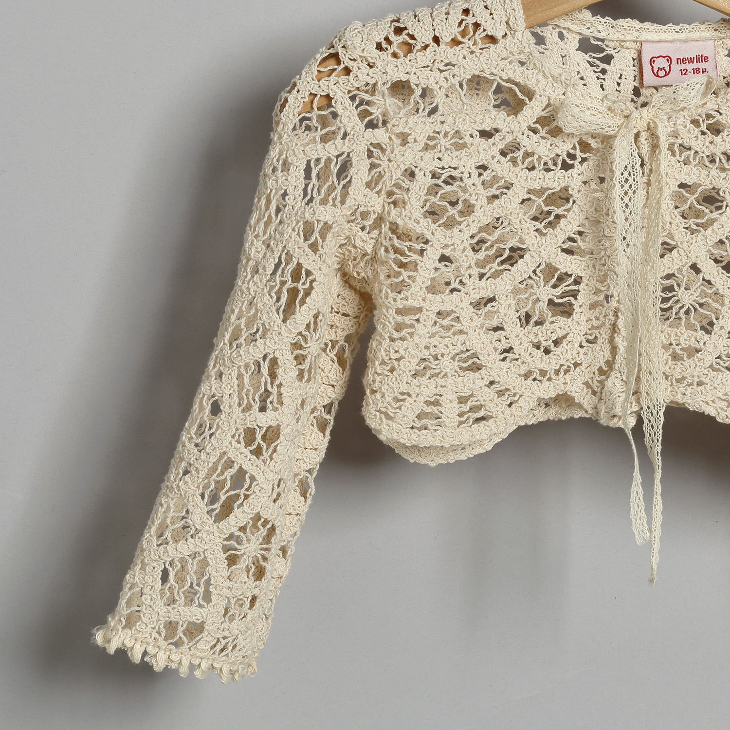 Ζακετάκι από πλεκτή δαντέλα σε μπεζ χρώμα , με δυο κορδελάκια που χρησιμοποιούνται για το δέσιμο.
