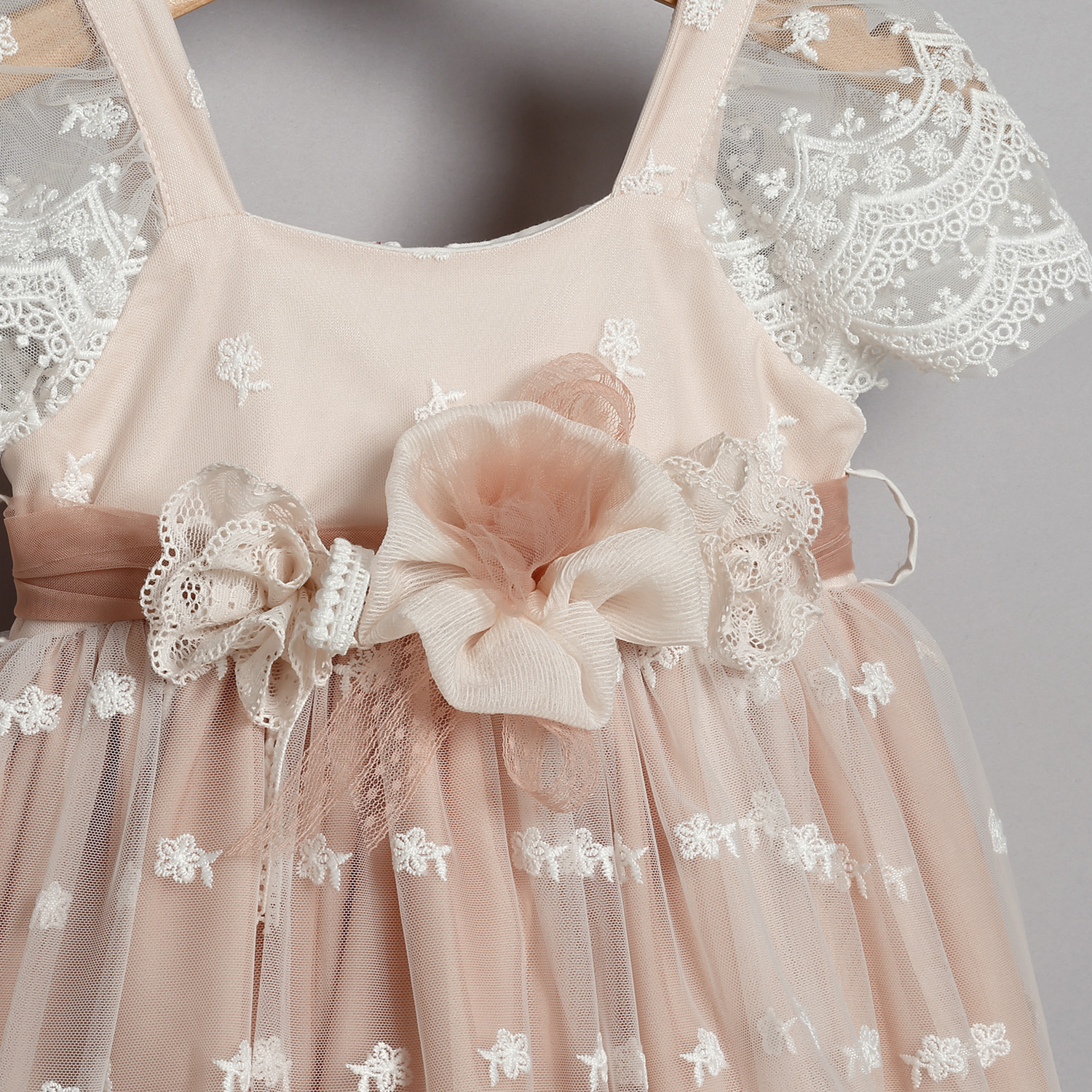 Φόρεμα από εκρού τούλινη δαντέλα στολισμένο με τούλινη ζώνη, λουλούδια και τρεσάκια.