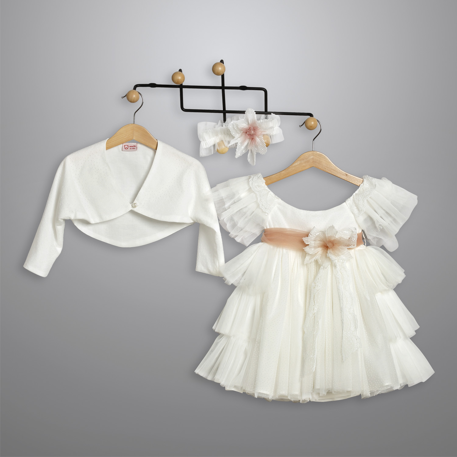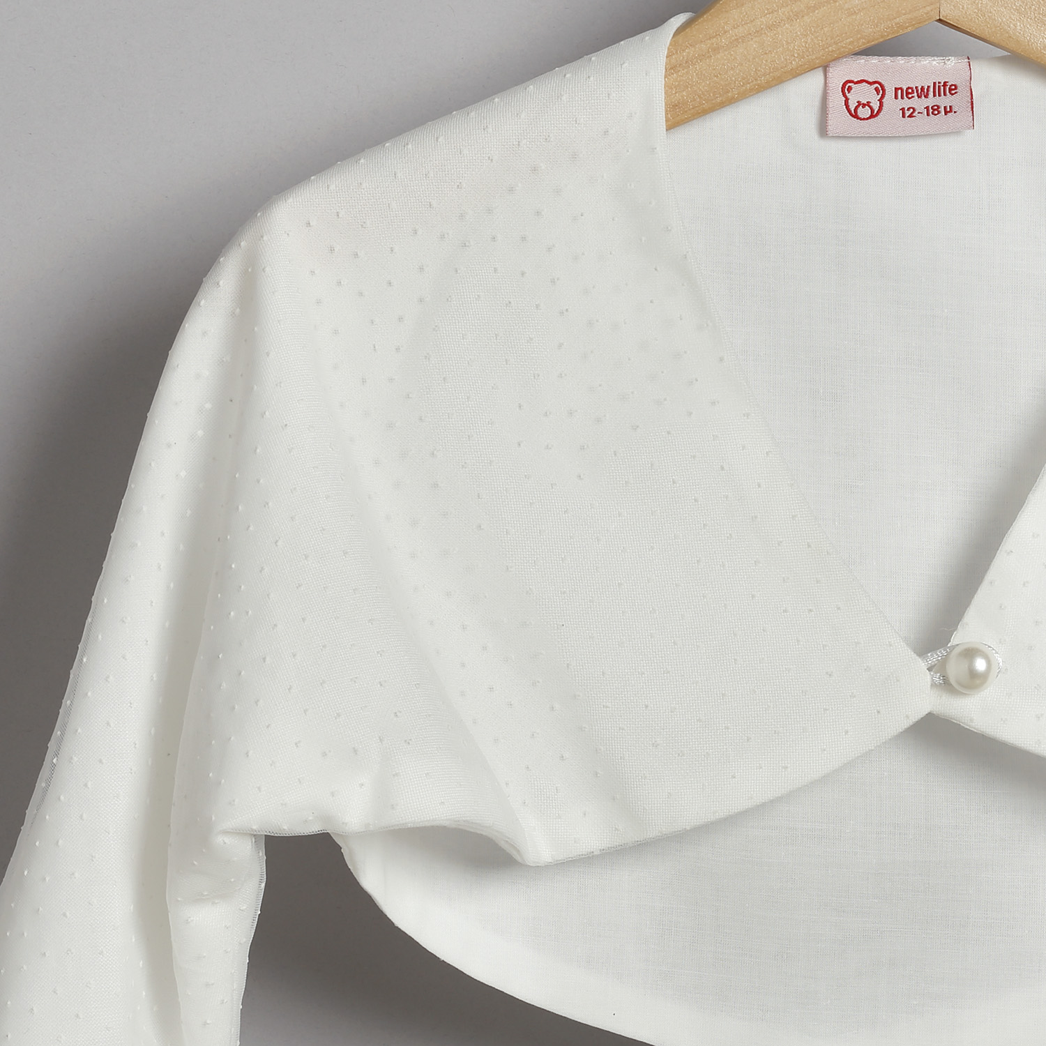 Ζακετάκι από πουά τούλι σε εκρού χρώμα, επενδυμένο με βαμβακερή φόδρα με ένα κουμπί πέρλα που χρησιμοποιείται για το κλείσιμο.