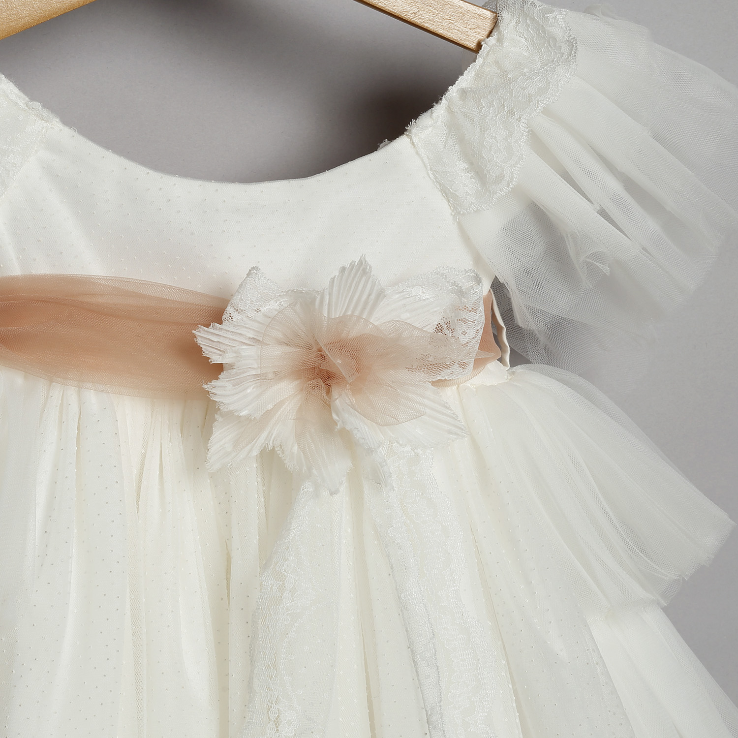 Φόρεμα από εκρού πουά τούλι στολισμένο με τούλινη ζώνη, λουλούδι και δαντελάκια.