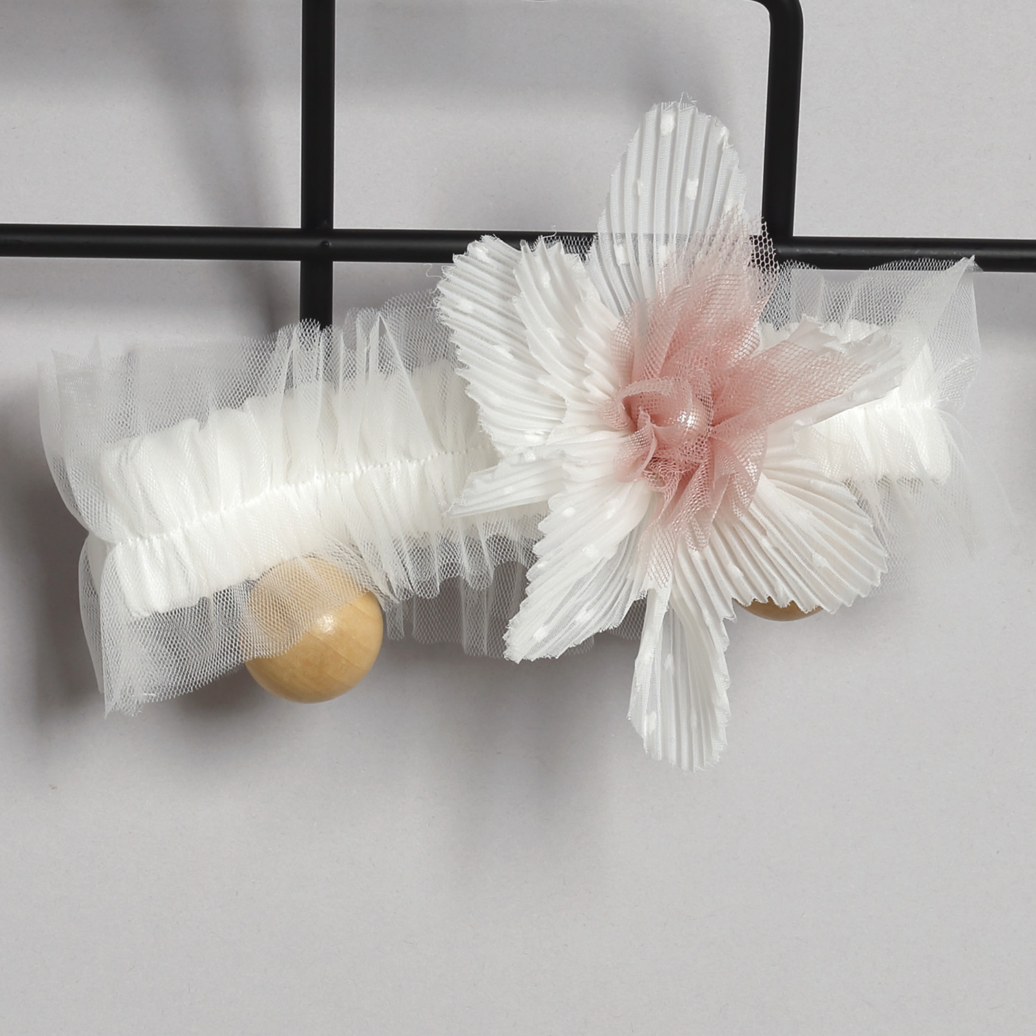 Μπροστά υπάρχει ένα λουλούδι από πλισέ τούλι και τούλι, με μια πέρλα στο εσωτερικό του,