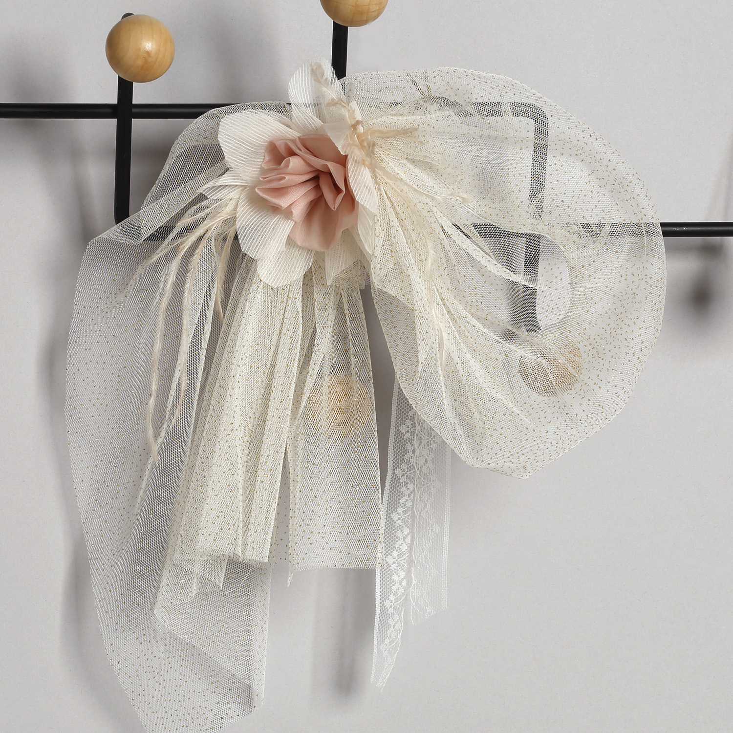 Μπροστά υπάρχει ένα λουλούδι από τούλι και μουσελίνα με διακοσμητικό στο εσωτερικό του, ραμμένο πάνω σε κορδόνια και πούπουλα.