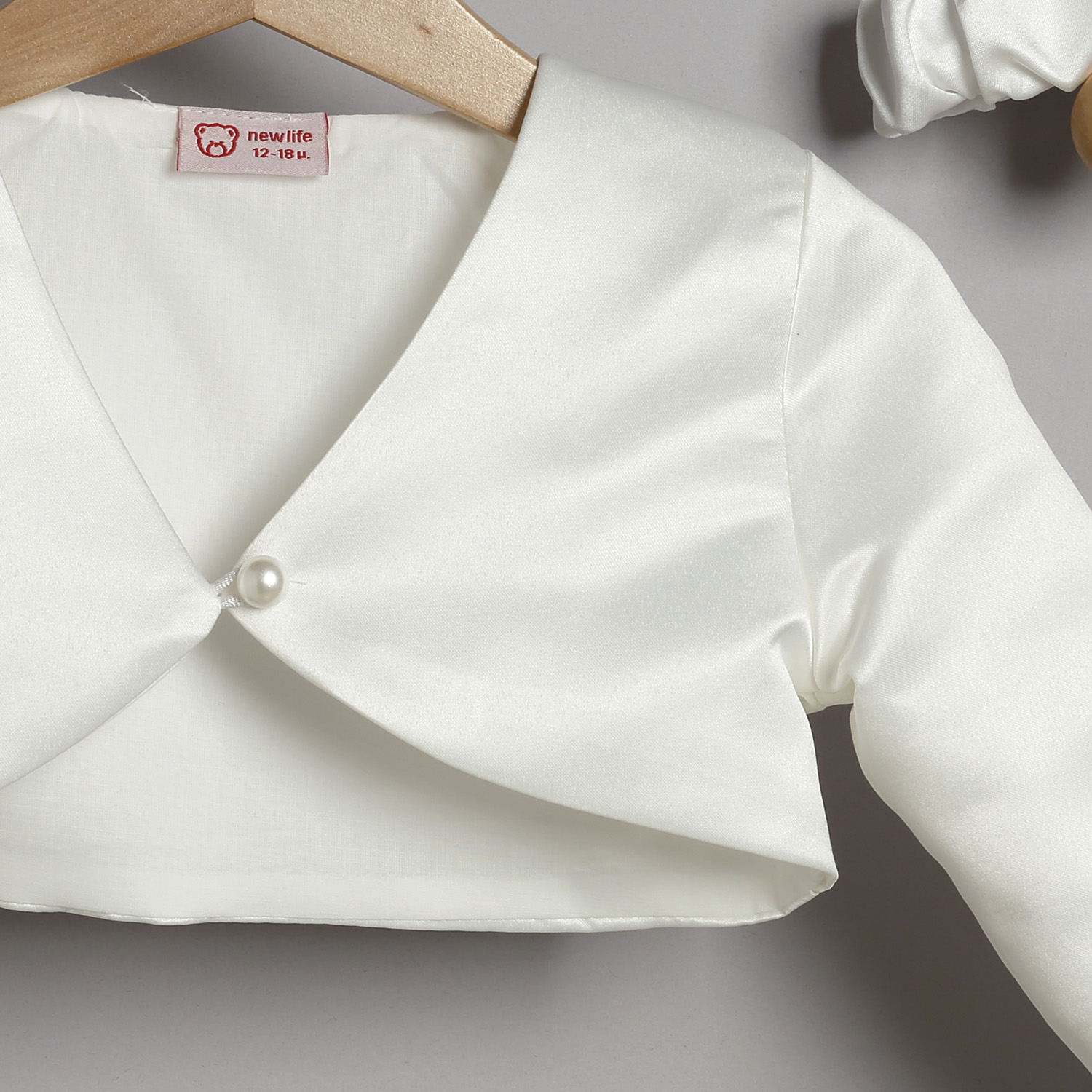 Ζακετάκι από σατέν σε εκρού χρώμα, επενδυμένο με βαμβακερή φόδρα με ένα κουμπί πέρλα.