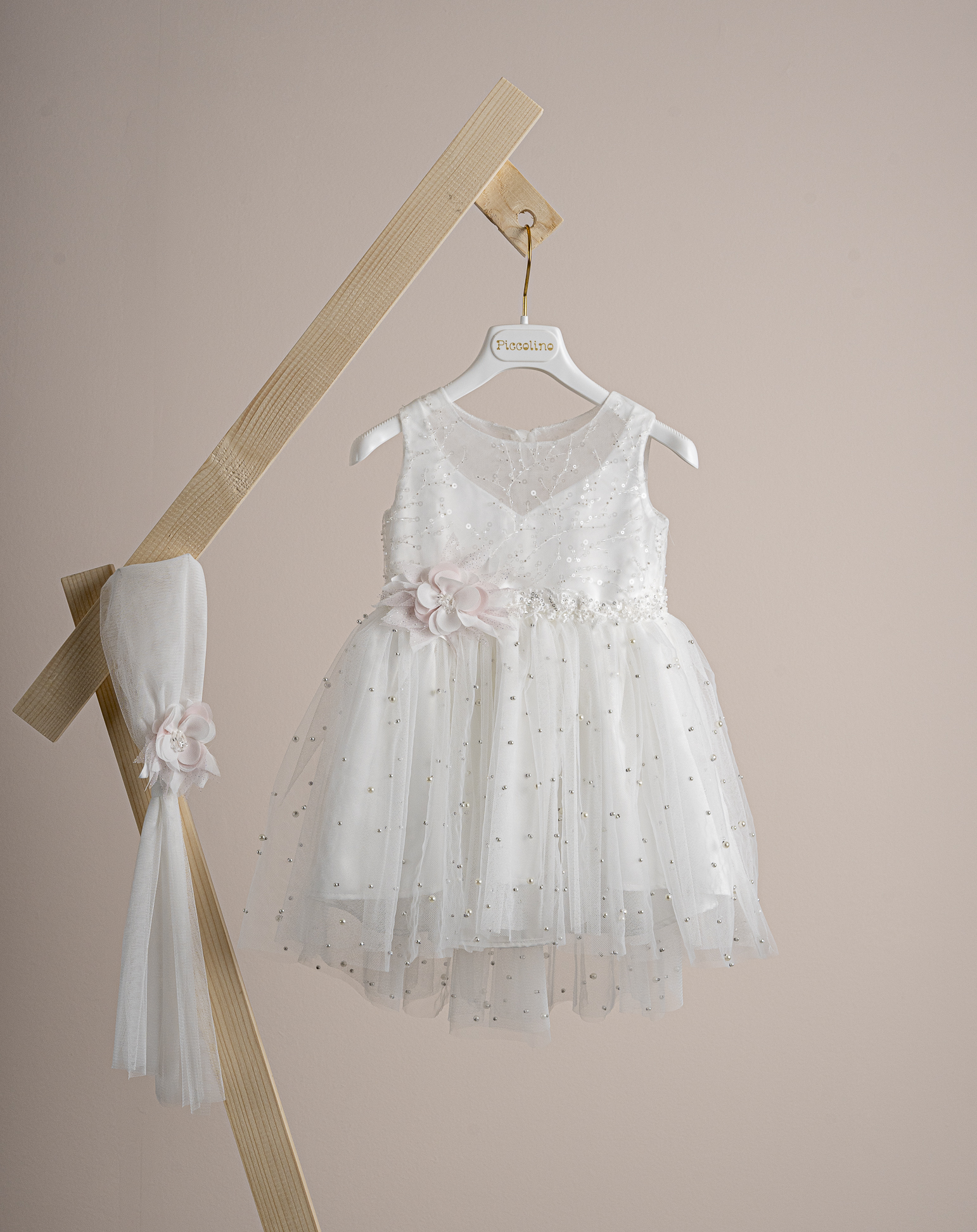 Βαπτιστικό φόρεμα Piccolino Salina Ivory, Φόρεμα μεσάτο με μπούστο απο δαντέλα ανάγλυφη με στρας και σχηματισμό σε κόψιμο καρδιάς, με διακριτική διαφάνεια. Πλάτη με διαφάνεια και δαντέλα με στρας. Αστραφτερό ζωνάκι και ασσύμετρη τούλινη φούστα με πέρλες. Το ντεκόρ του φορέματος αποτελείται από χειροποίητο λουλούδι. Το φόρεμα συνοδέυεται απο μπαντάνα με ντεκόρ όμοιο με το φόρεμα. Διαθέσιμο σε 4 μεγέθη: 6-12, 12-18, 18-24, 24-36(εξτρά χρέωση)