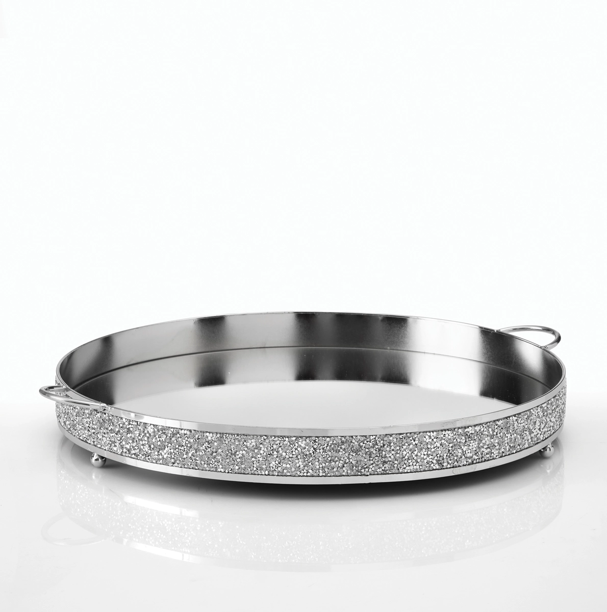 Στρογγυλός μεταλλικός ασημένιος δίσκος με καθρέφτη και ασημένια στρασάκια.