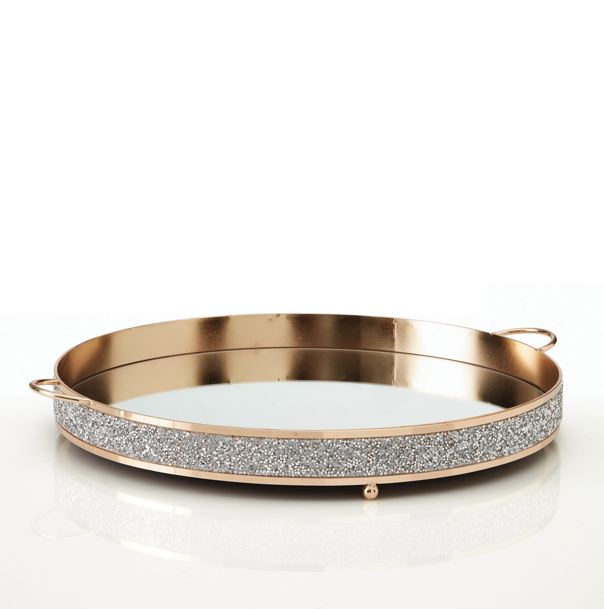 Στρογγυλός μεταλλικός χρυσός δίσκος με καθρέφτη και ασημένια στρασάκια.