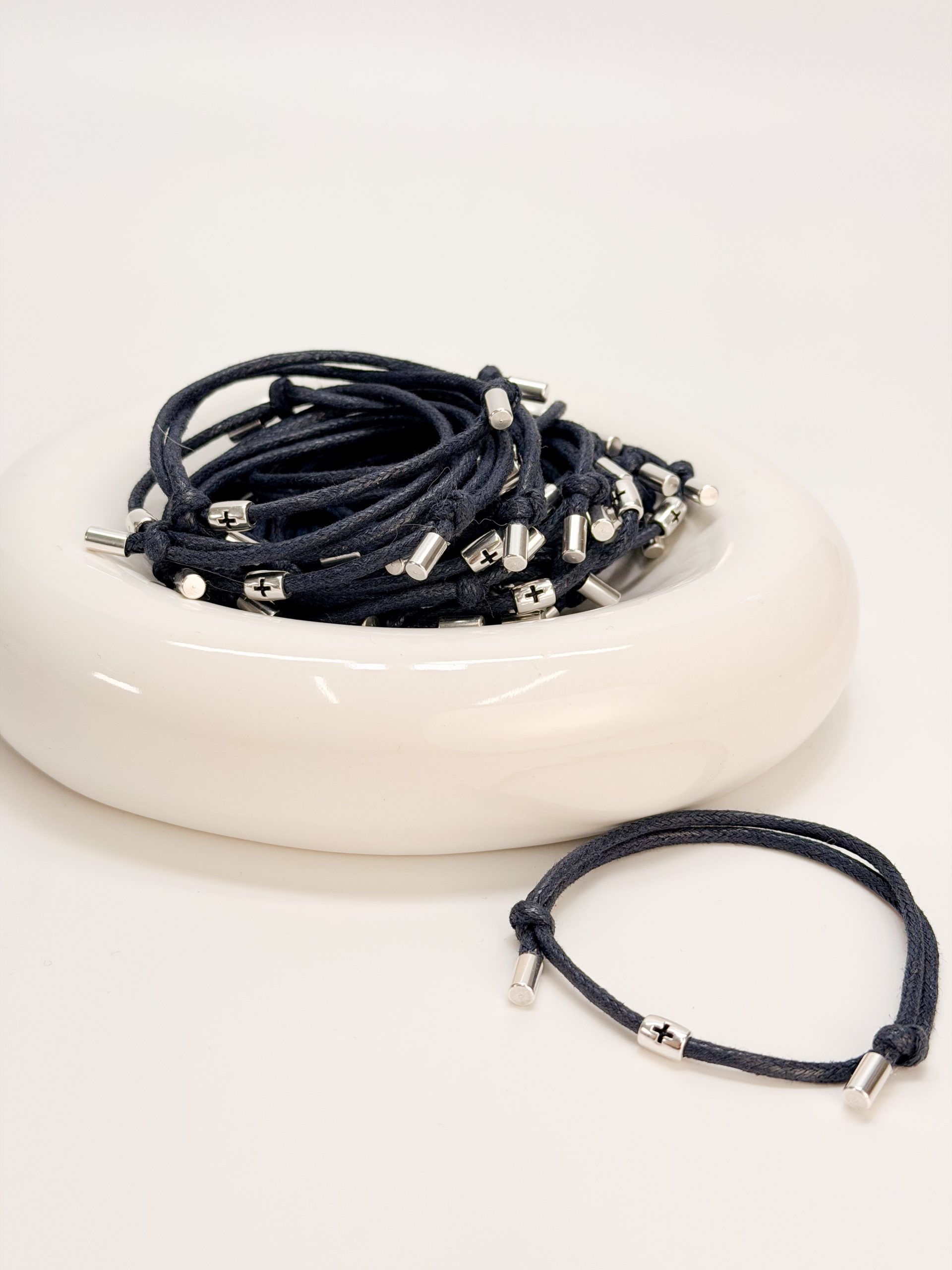 Μαρτυρικό βραχιόλι CELFIE AND CO A-62 με μπλε κορδόνι,σταυρό και τάπες σε ασημι απόχρωση.