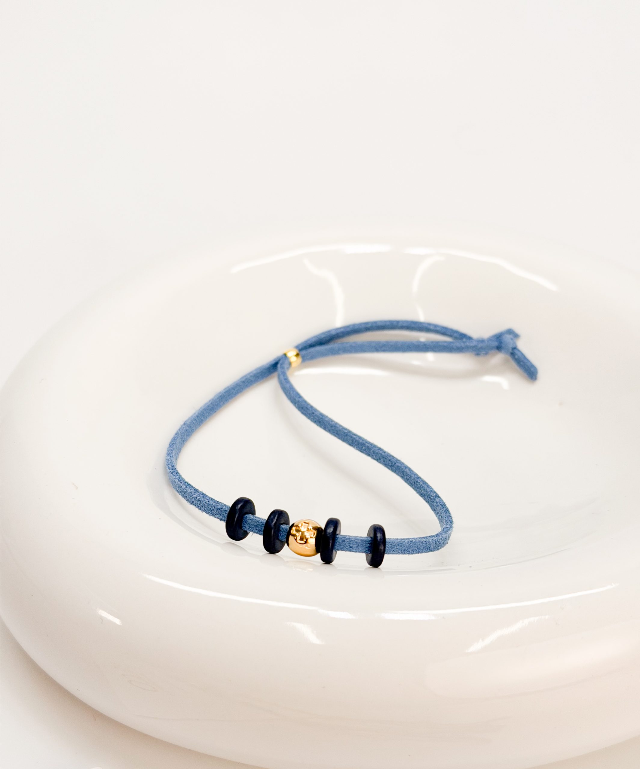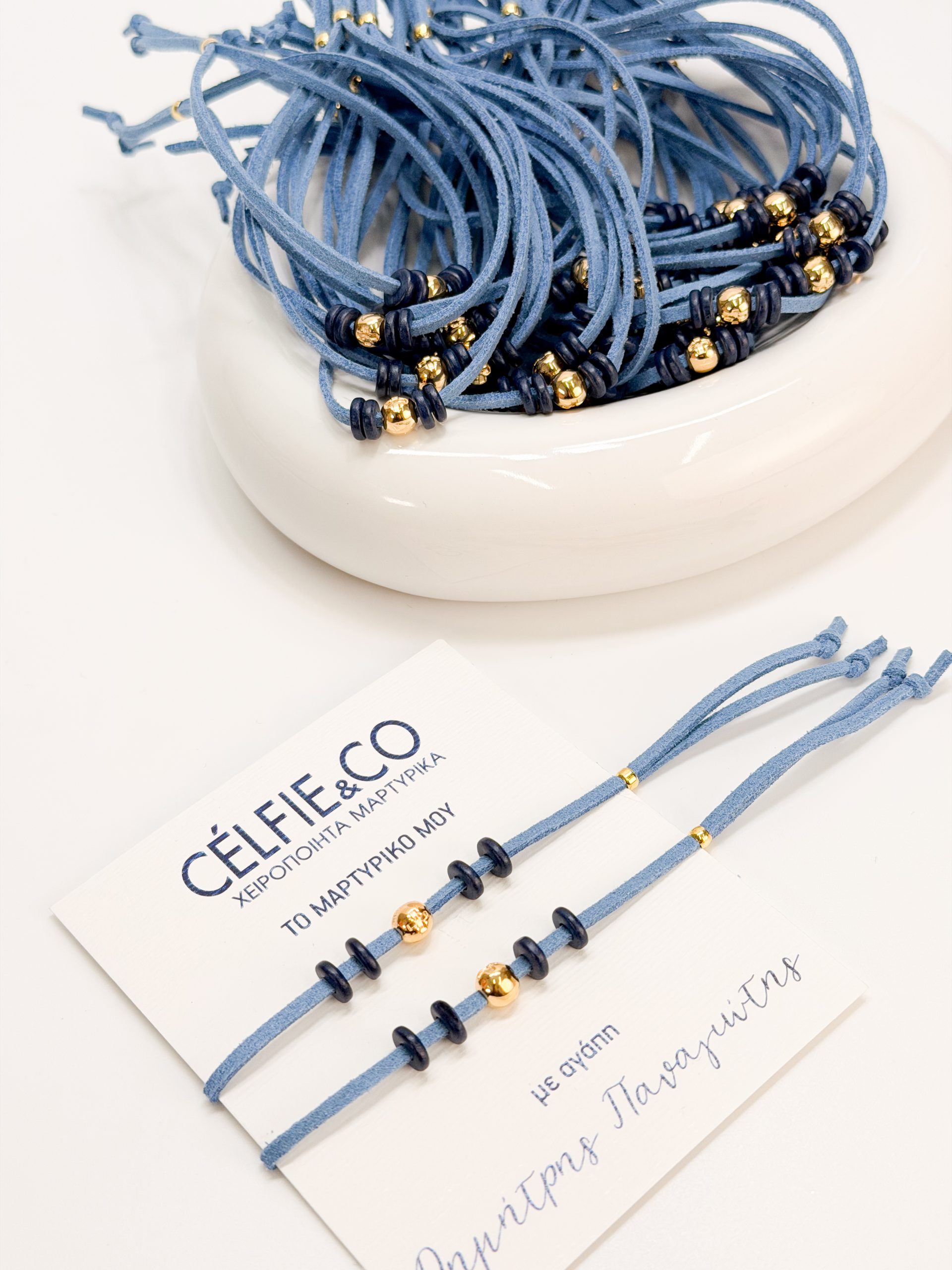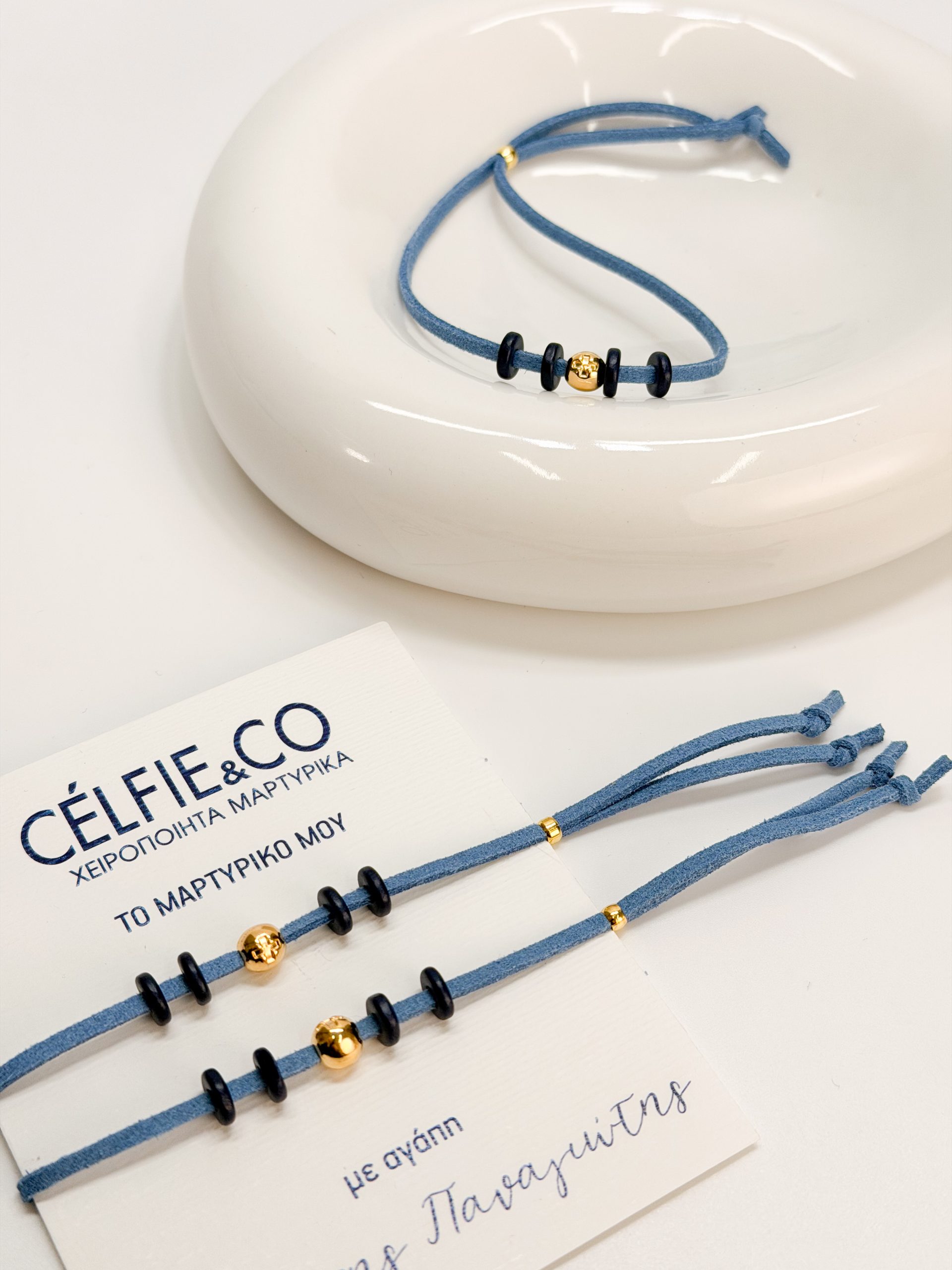 Μαρτυρικό βραχιόλι CELFIE AND CO A-67,με μπλε ραφ σουετ κορδόνι,επιχρυσωμένο σταυρό και κεραμικές ροδέλες.