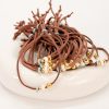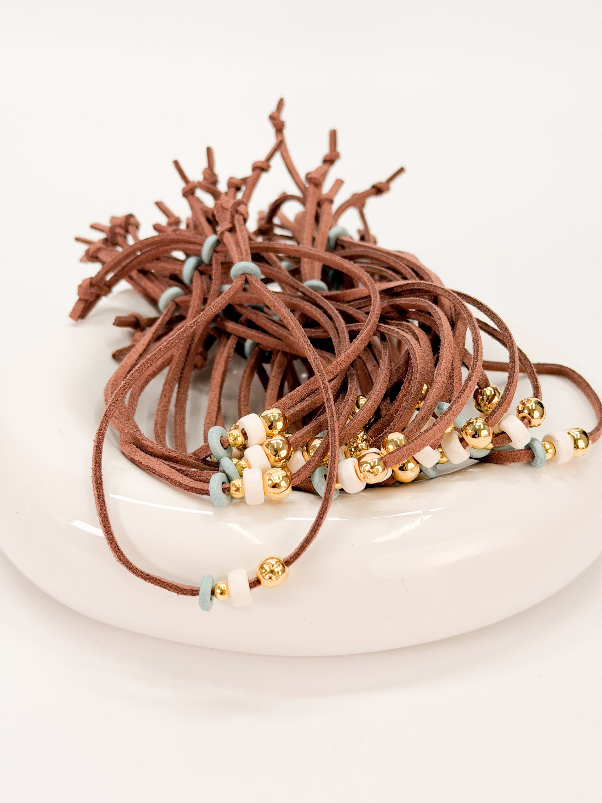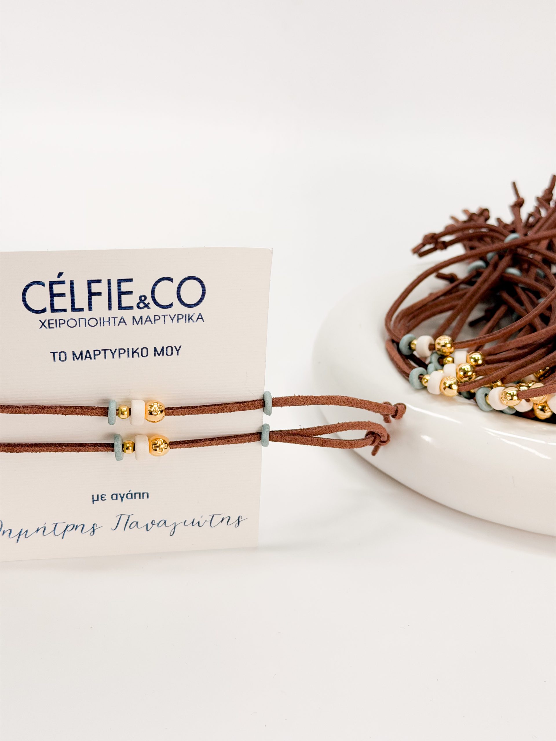 Μαρτυρικό βραχιόλι CELFIE AND CO B-37 με καφέ σουέτ κορδόνι,επιχρυσωμένο σταυρό και κεραμικές ροδέλες.