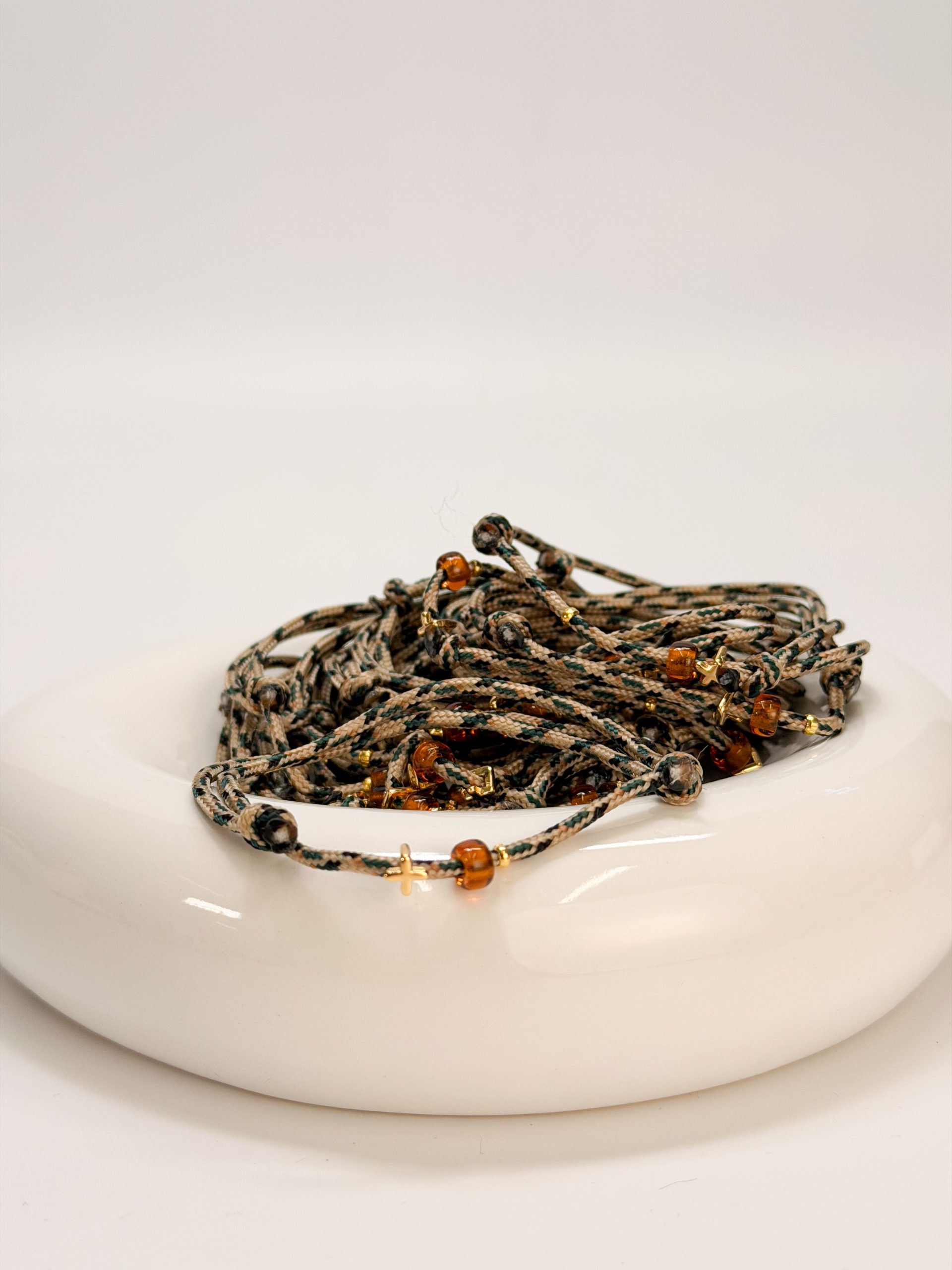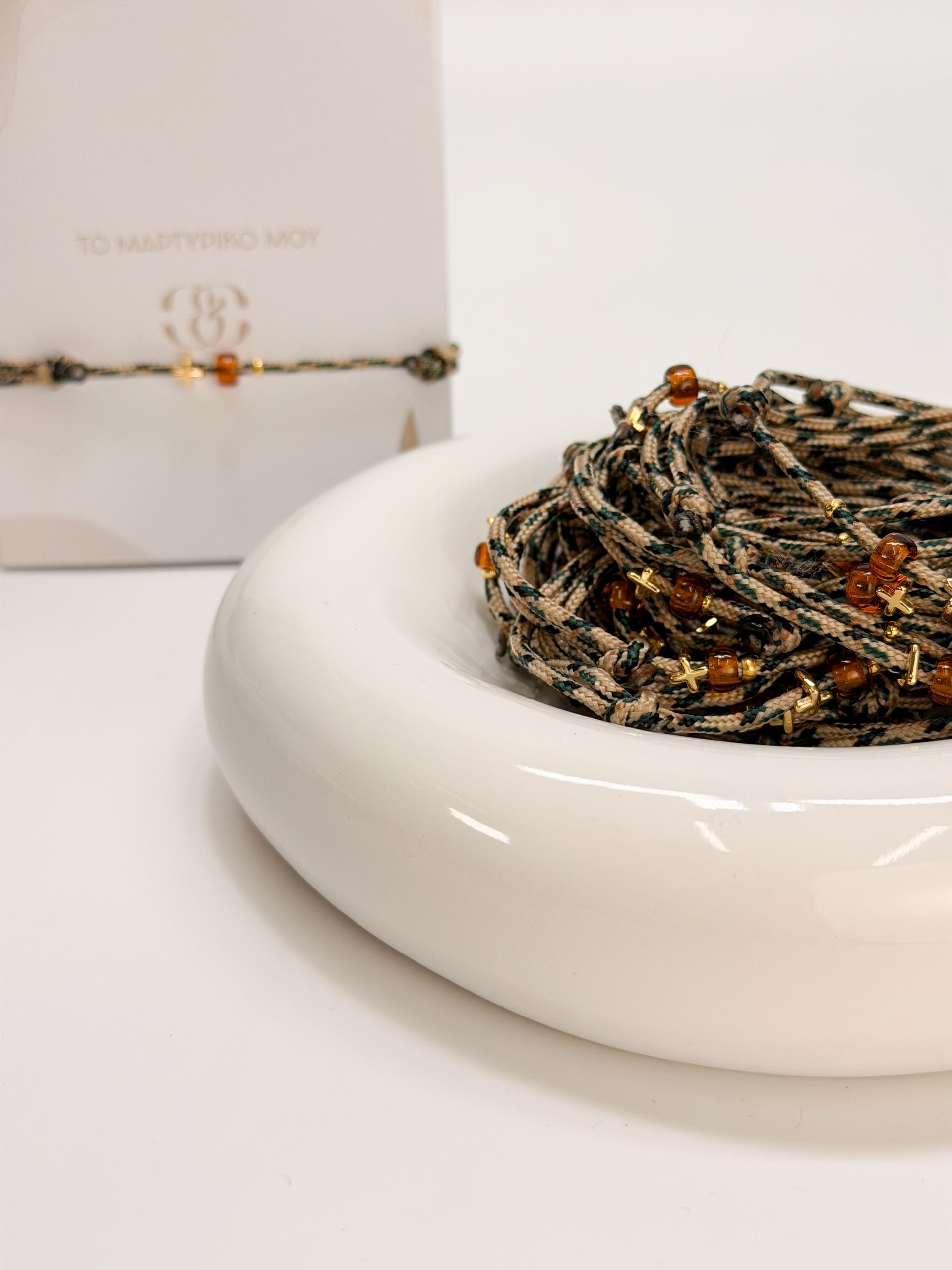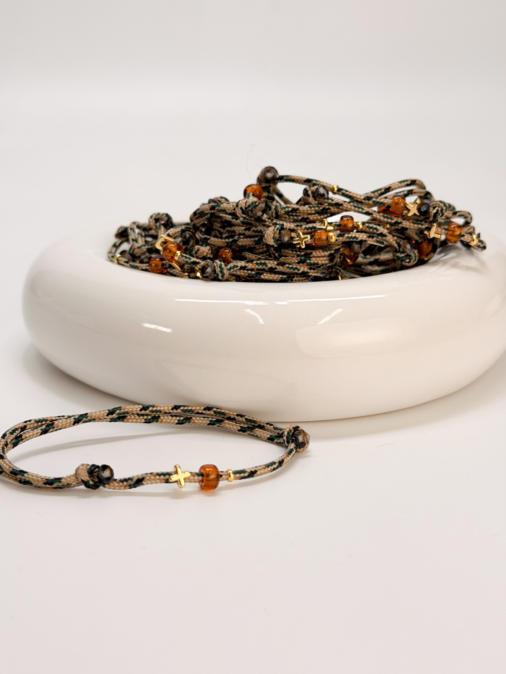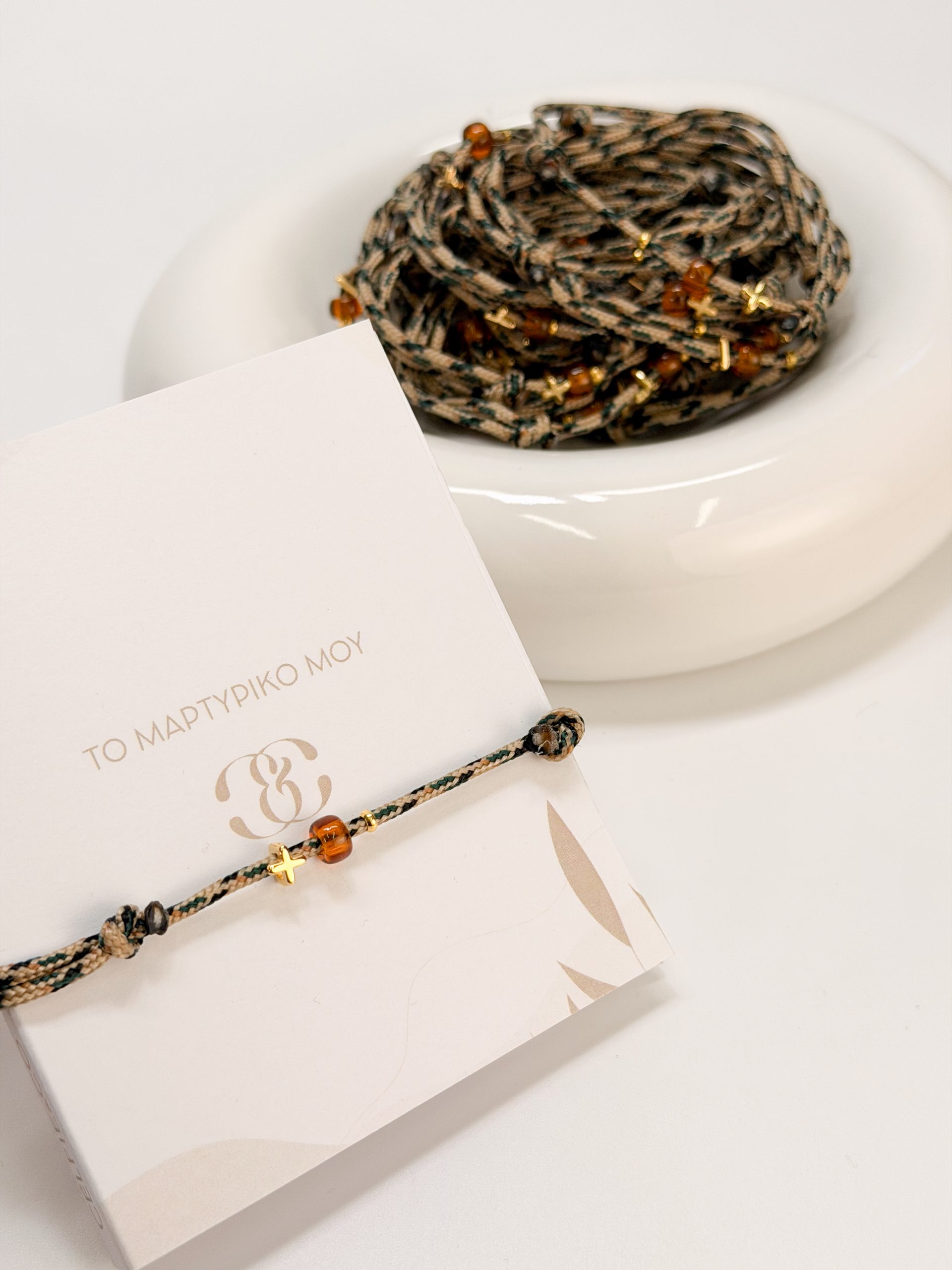 Μαρτυρικό βραχιόλι CELFIE AND CO E-54 με κορδόνι σε 3 αποχρώσεις,καφέ ακρυλική χάντρα και επιχρυσωμένο σταυρό.