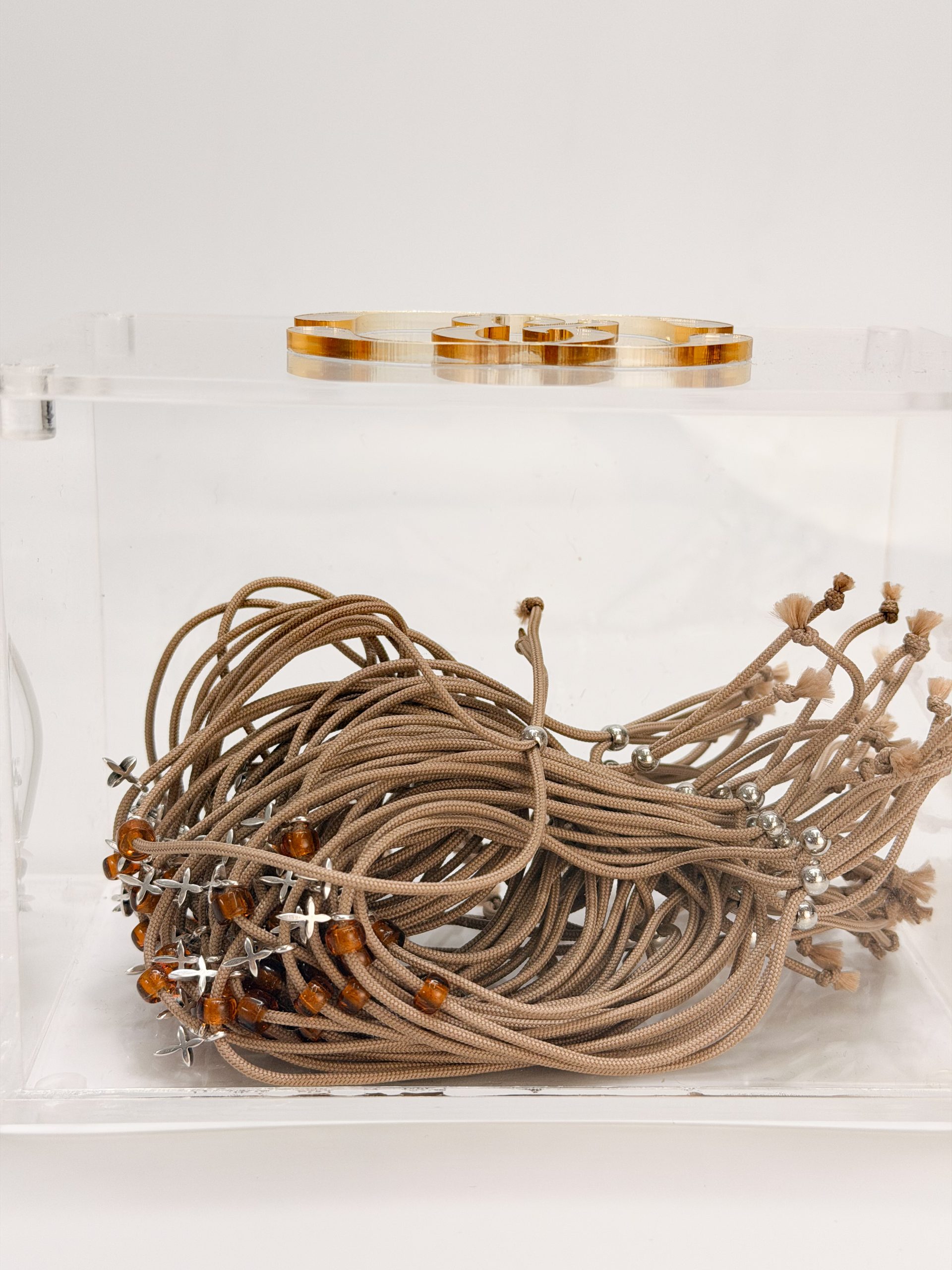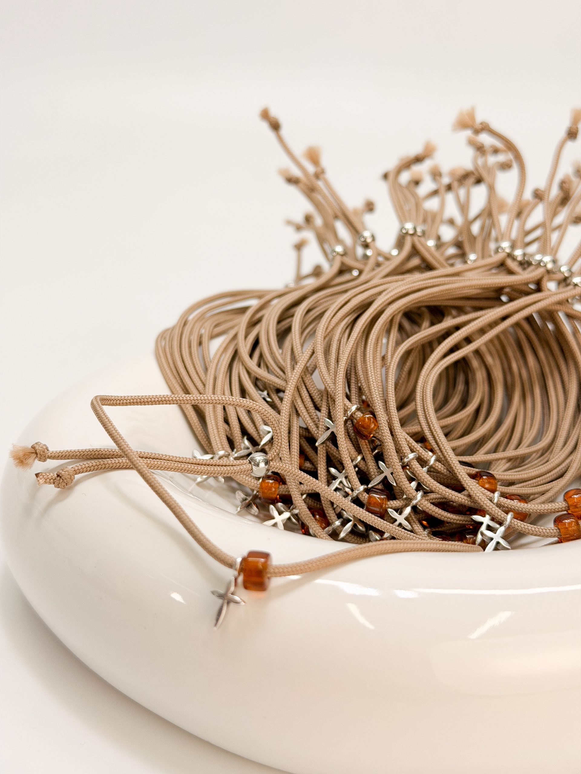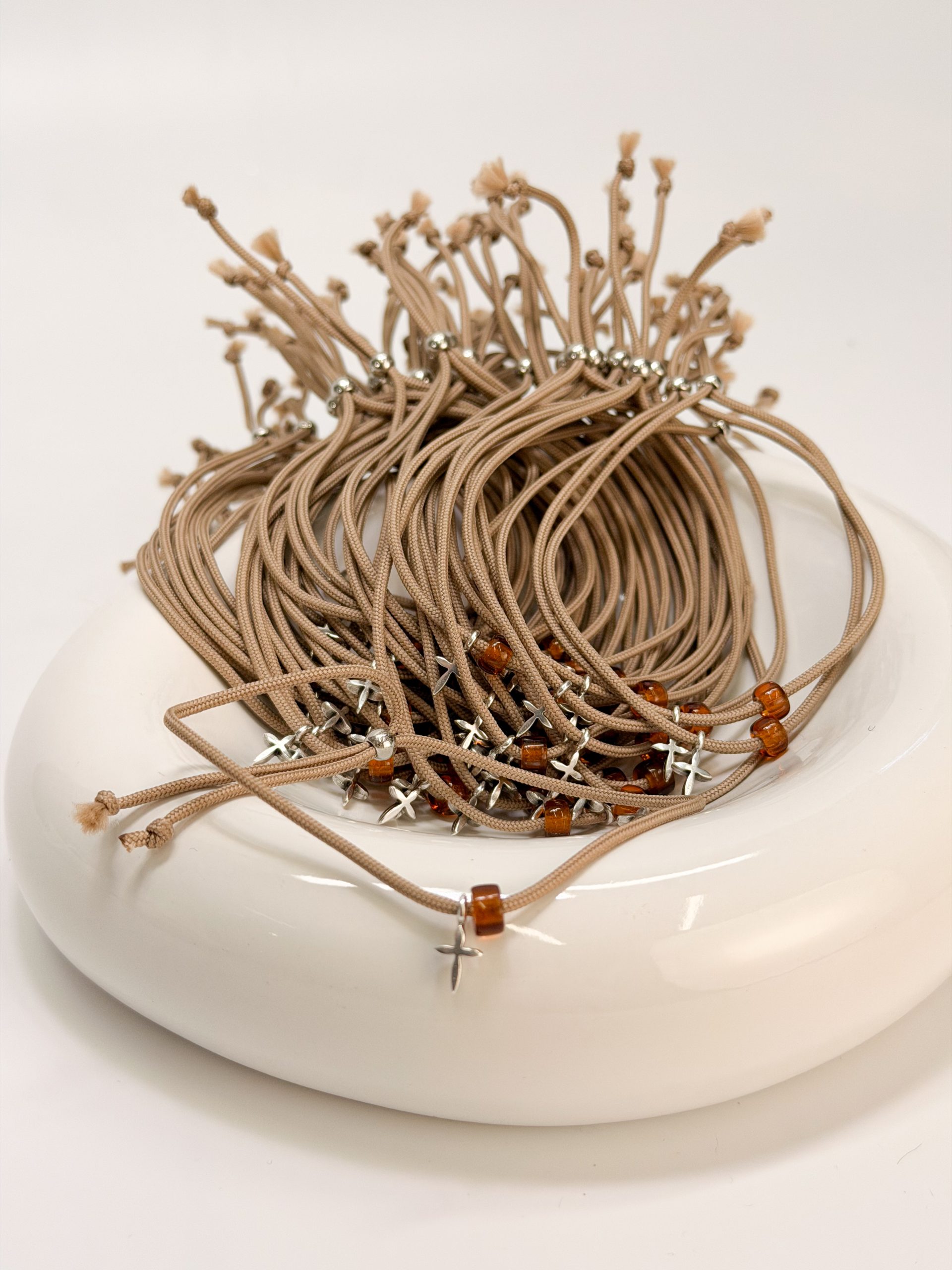 Μαρτυρικό βραχιόλι CELFIE AND CO E-59 με μπεζ κορδόνι,καφέ χάντρα και σταυρό σε ασημί απόχρωση.
