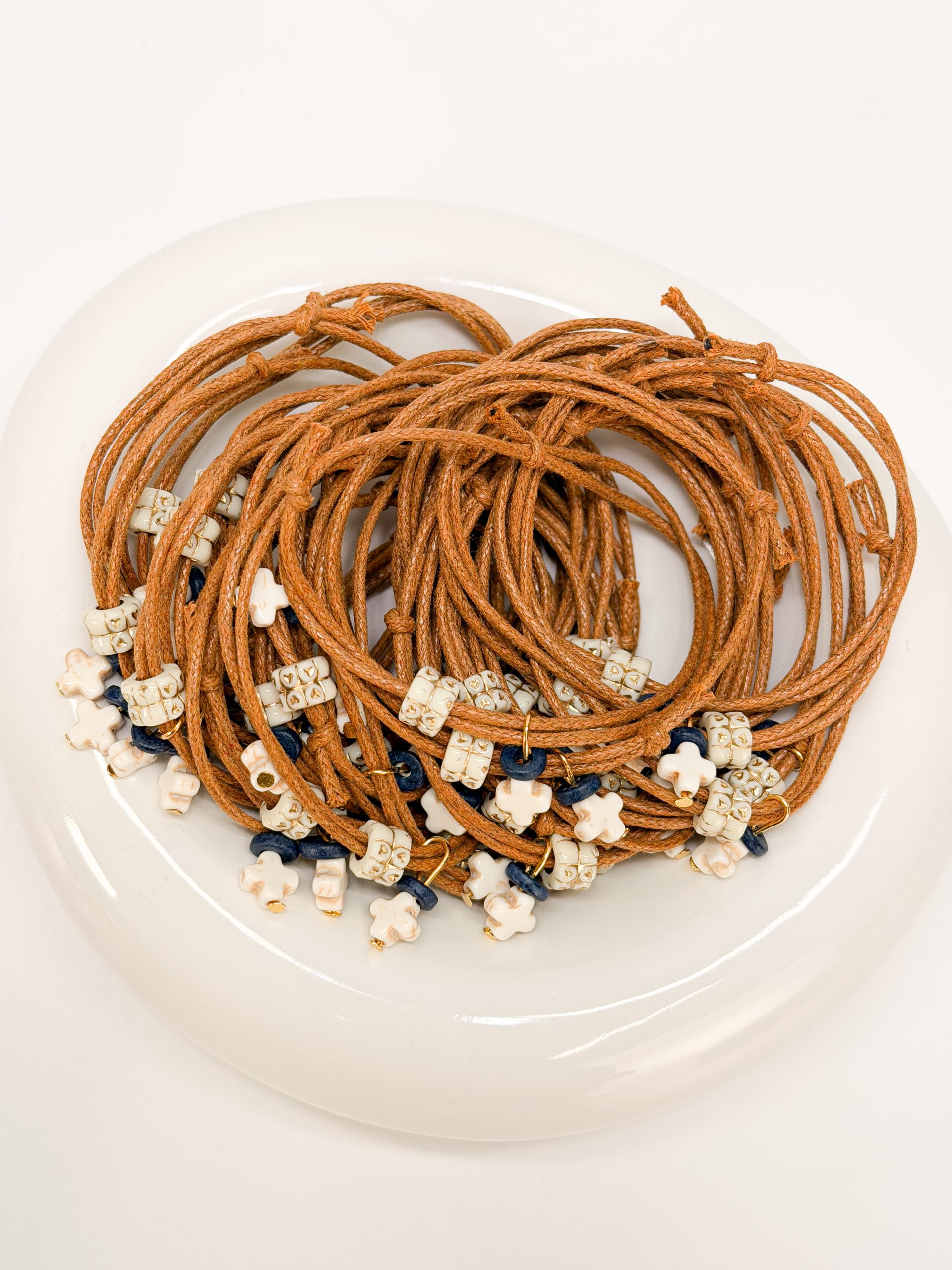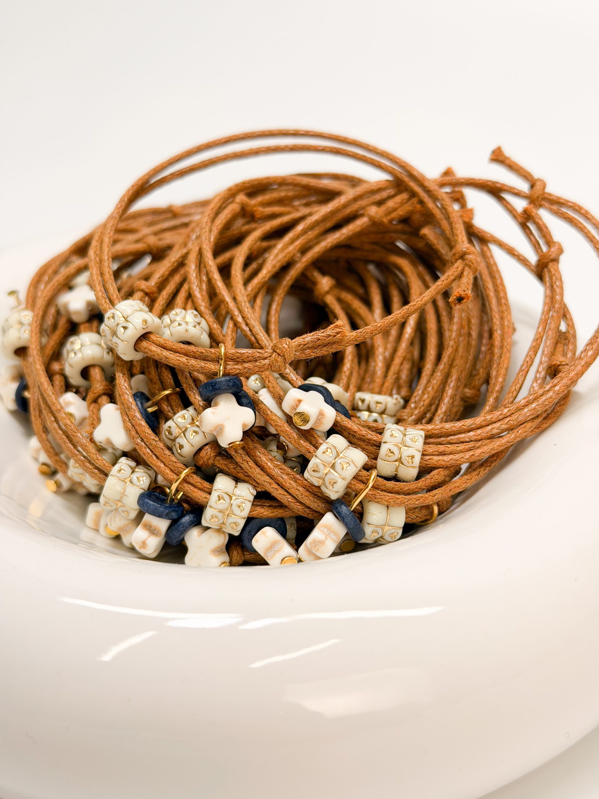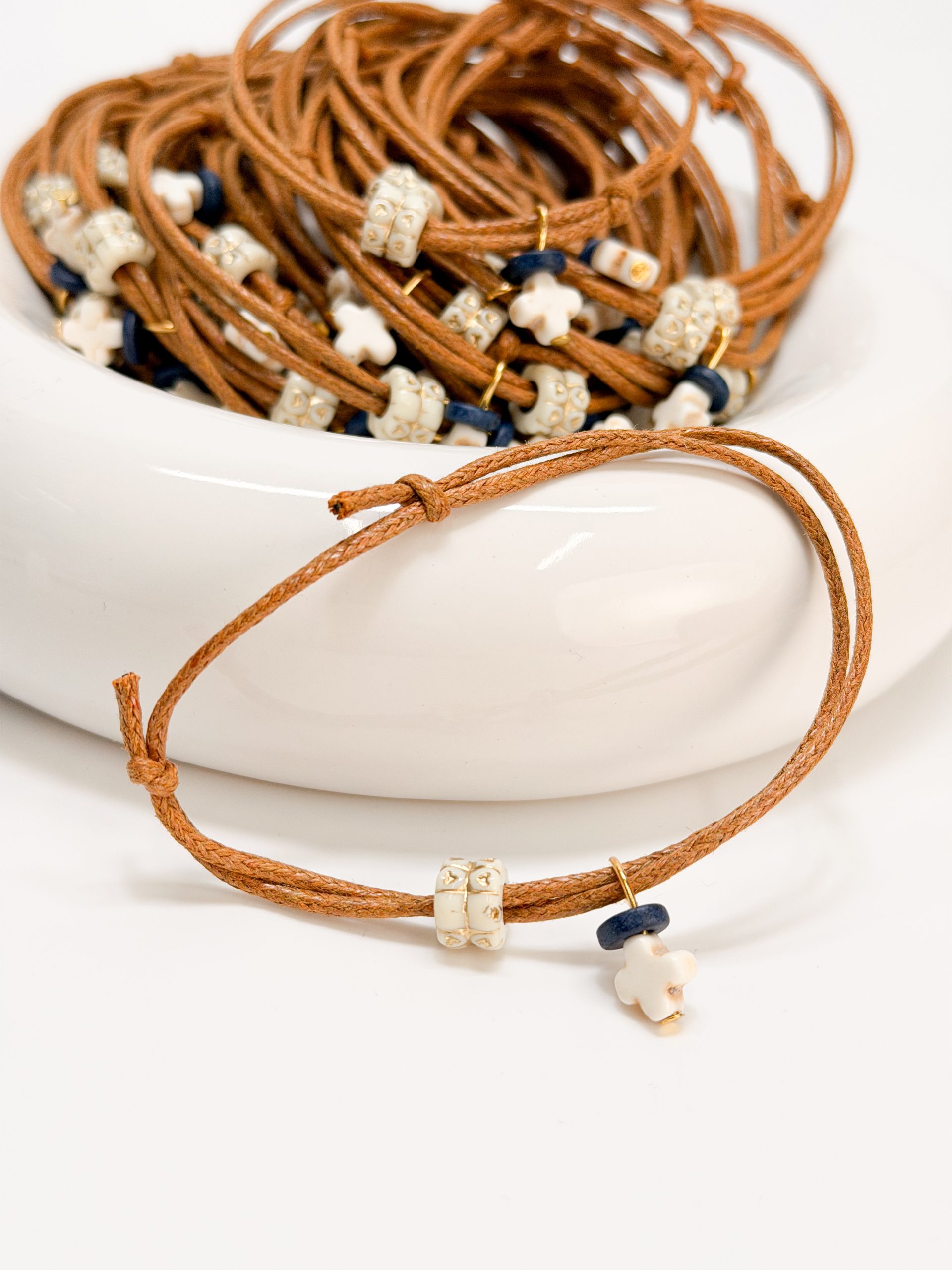 κεραμική μπλε χάντρα και δίχρωμη ακρυλική χάντρα σε χρυσή-λευκή απόχρωση.
