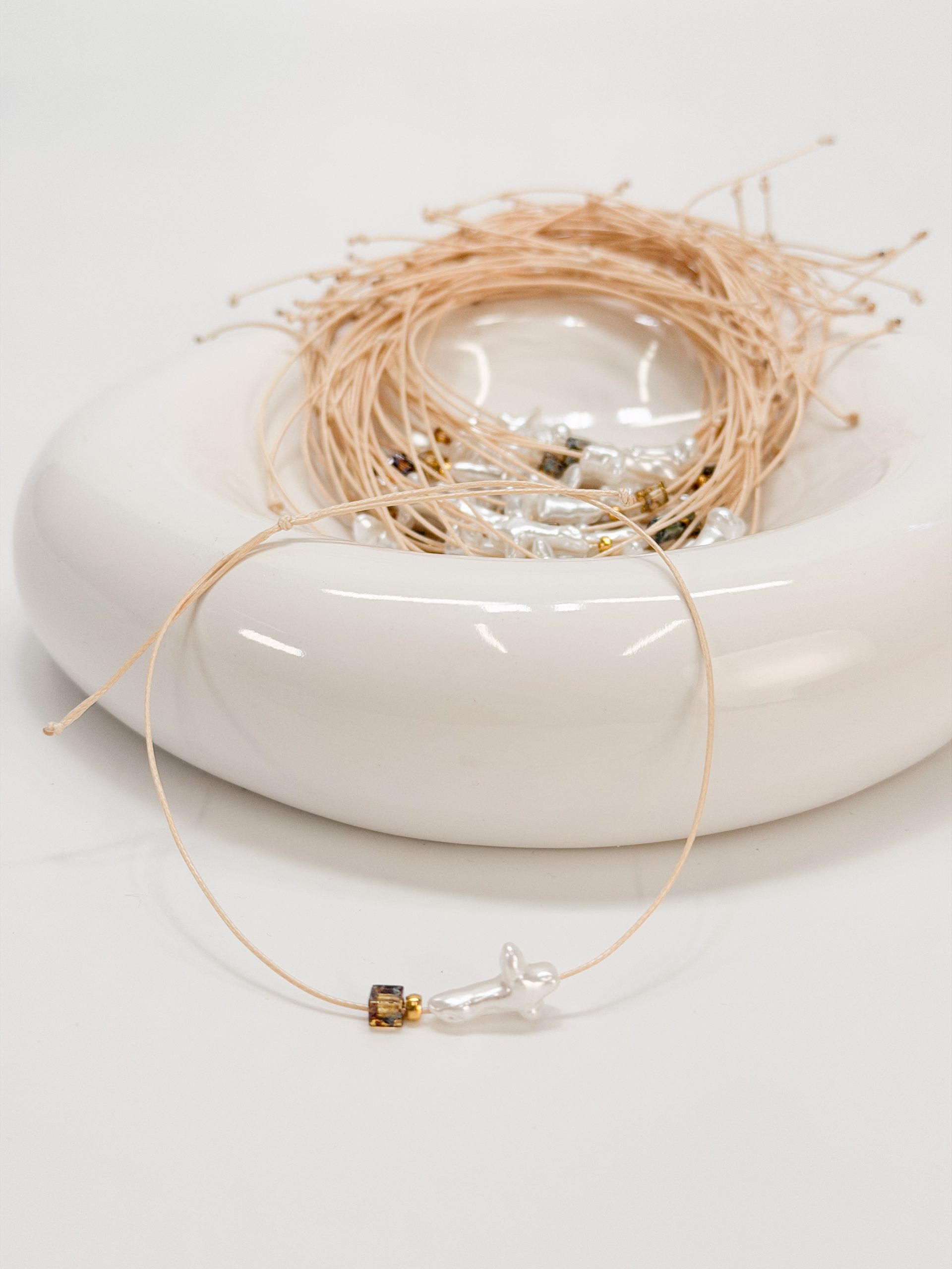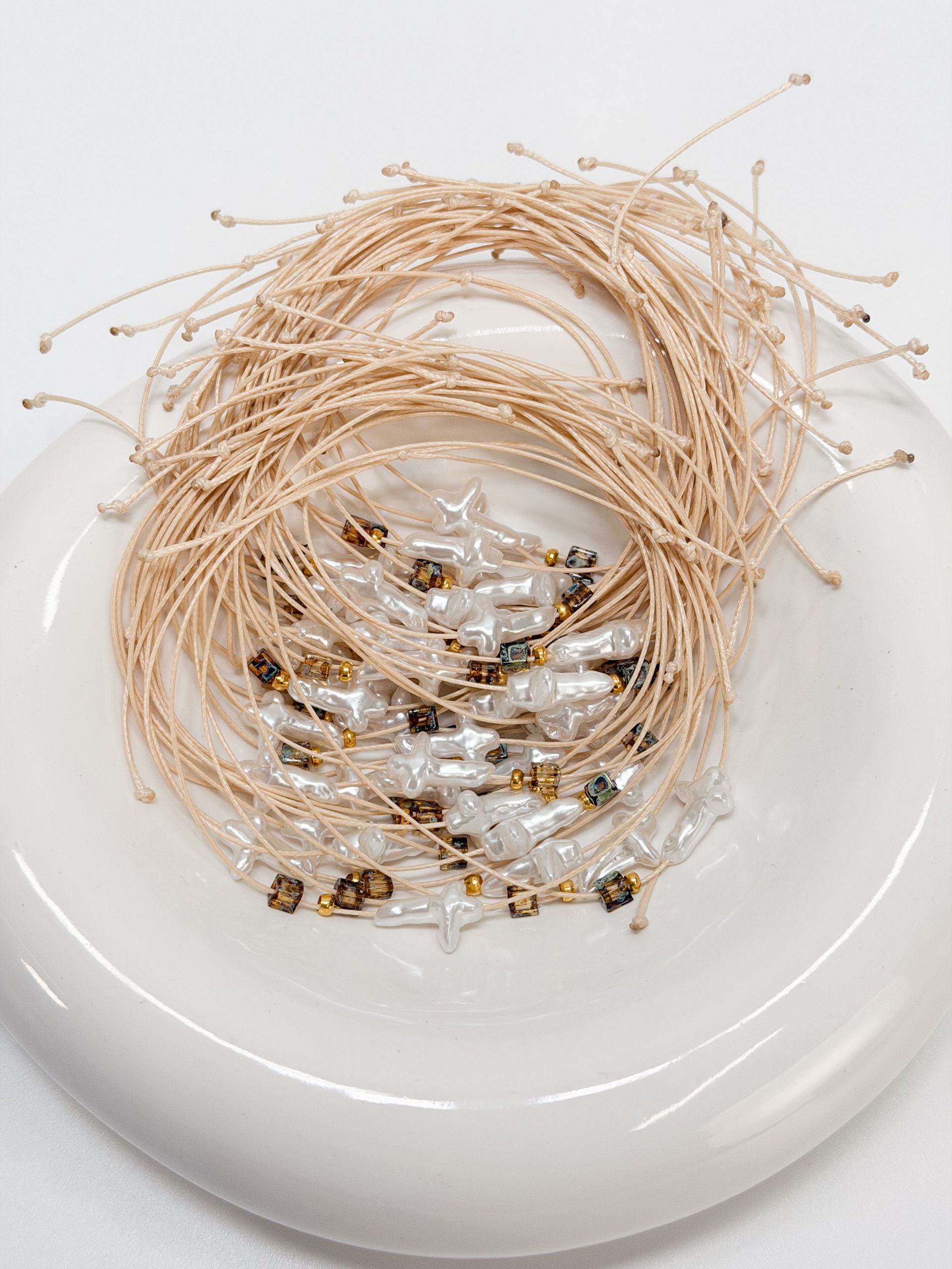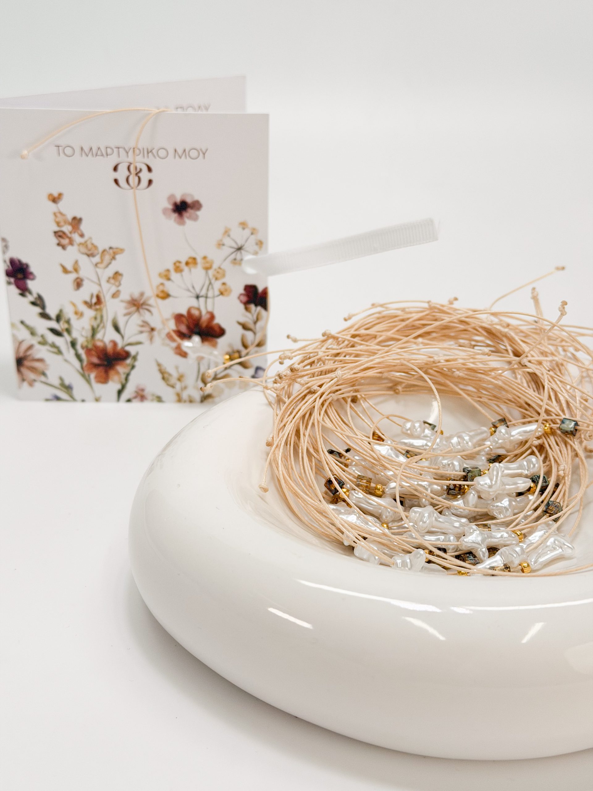 Μαρτυρικό βραχιόλι CELFIE AND CO J-5 με περλέ σταυρό,εκρού κορδόνι λεπτό και κυβάκι miyuki.