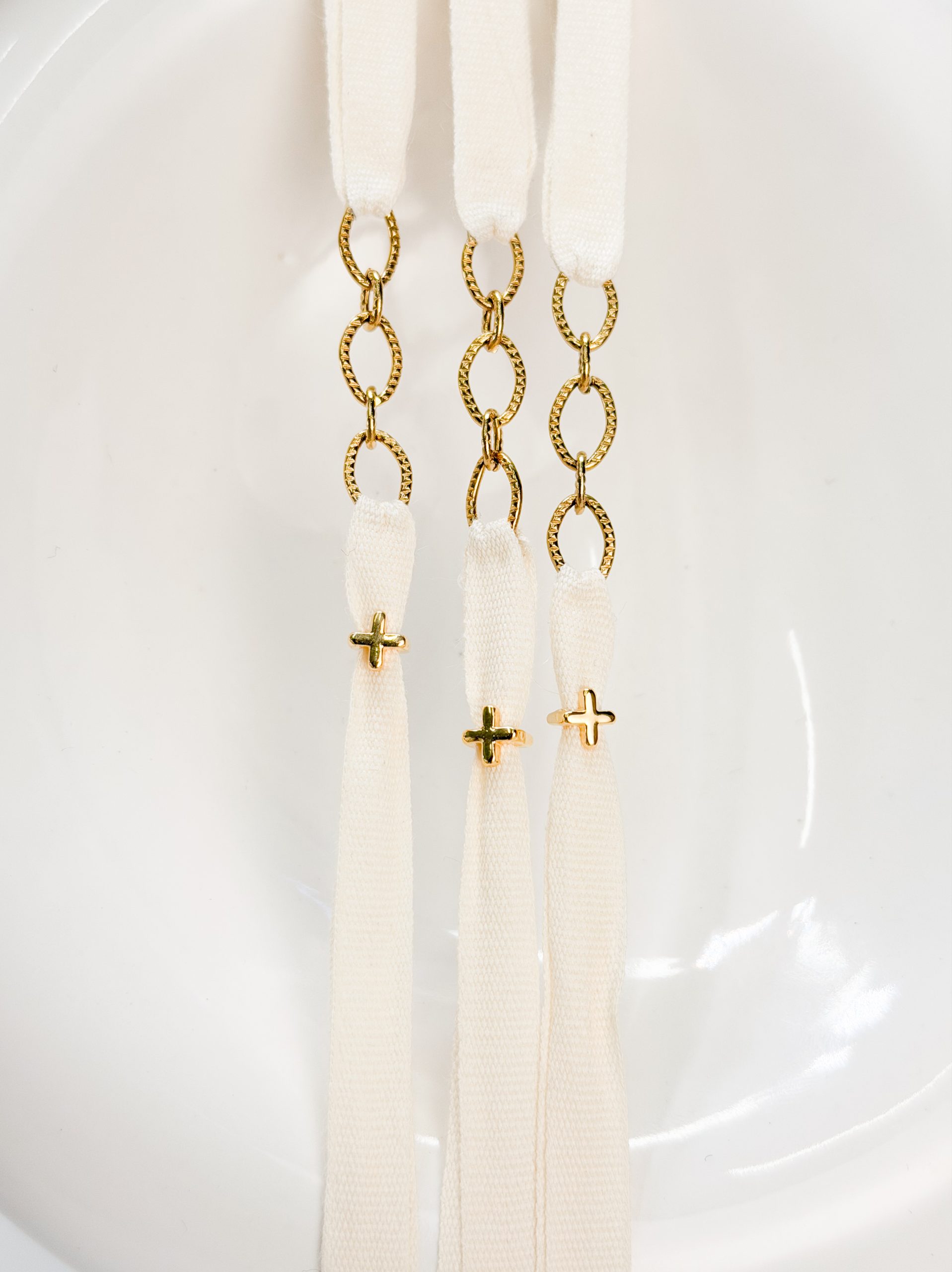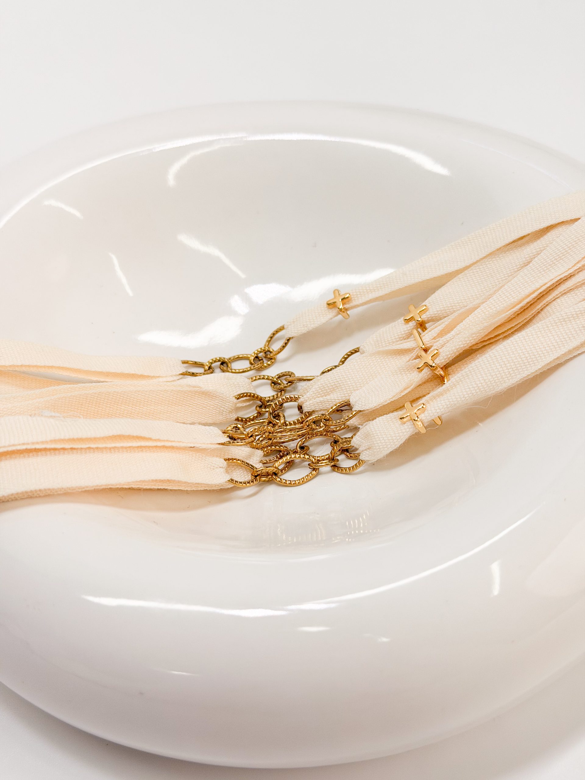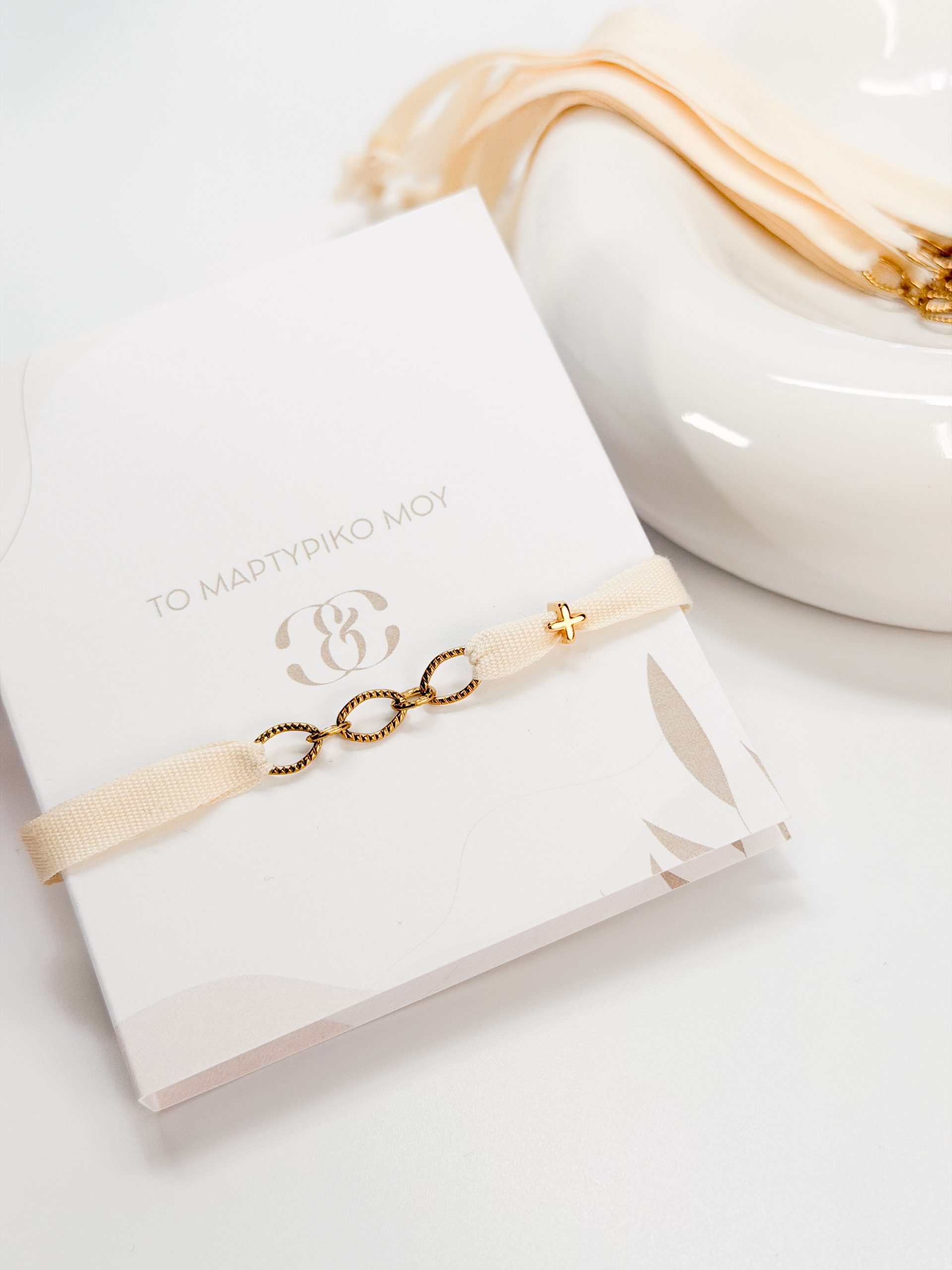 Μαρτυρικό βραχιόλι CELFIE AND CO J-6 με εκρού κορδέλα,αλυσίδα στην μέση και επιχρυσωμένο σταυρό.