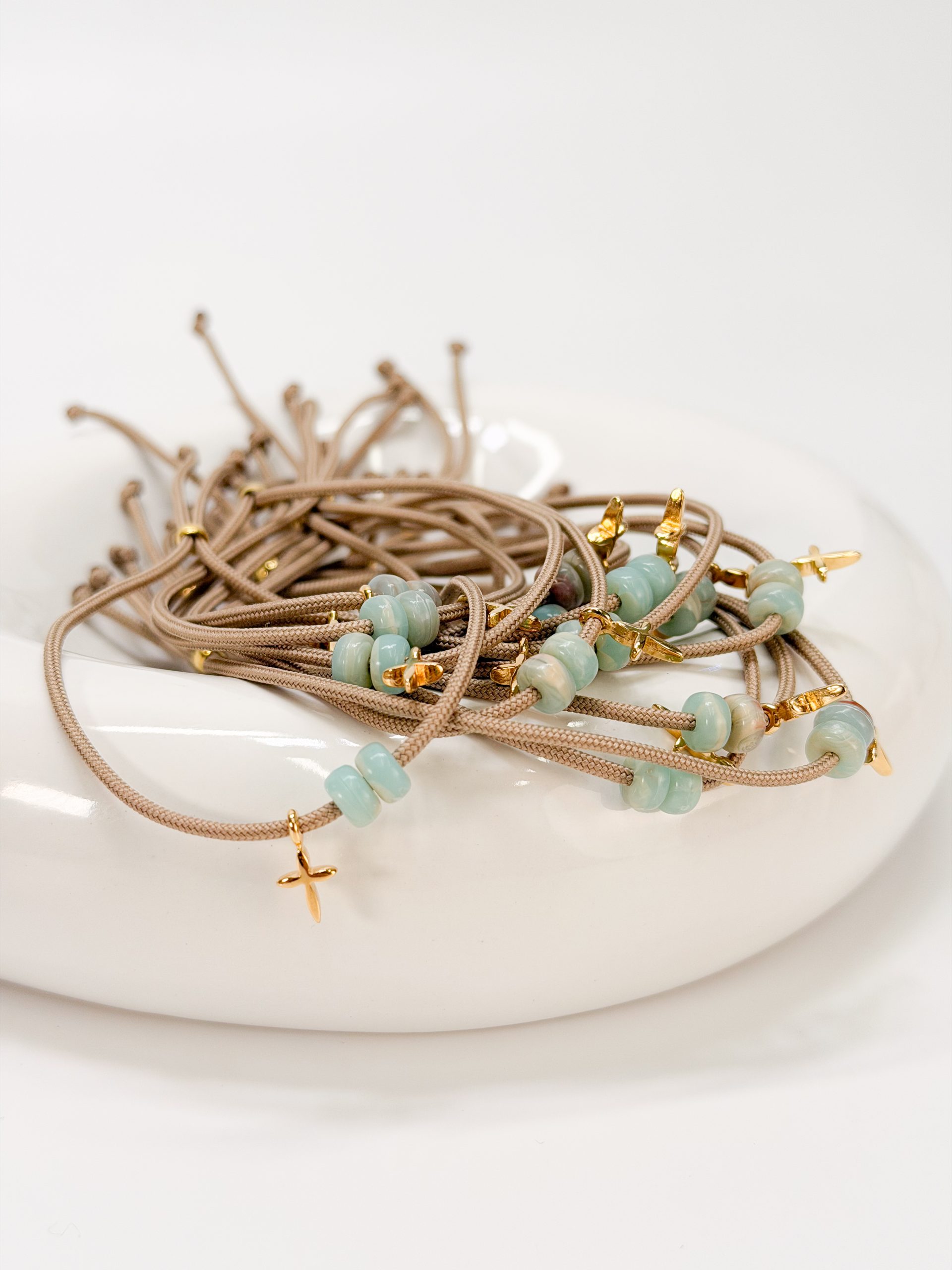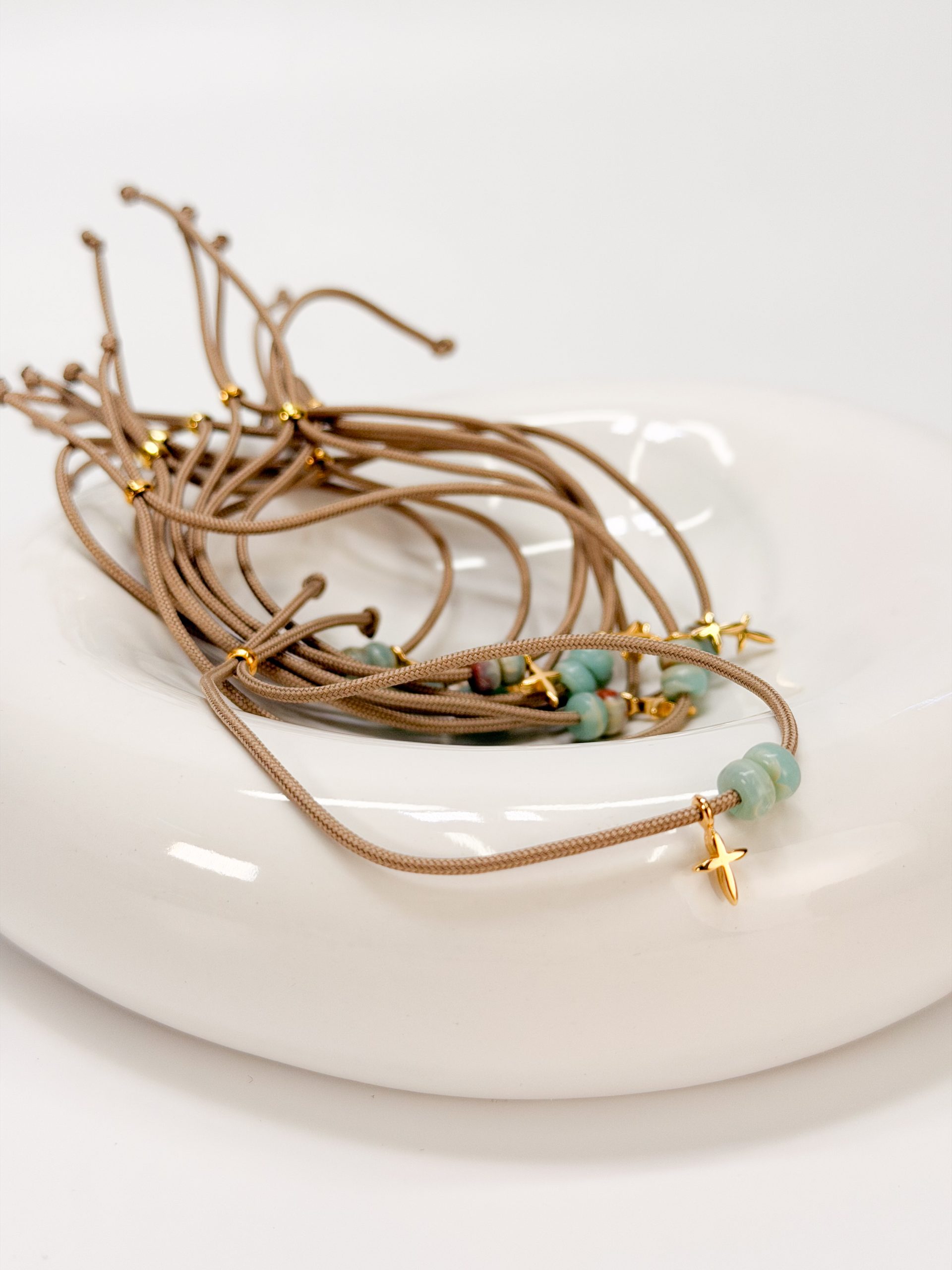 Μαρτυρικό βραχιόλι CELFIE AND CO M-46 με μπεζ κορδόνι,βεραμαν χάντρες δίχρωμες και επιχρυσωμένο σταυρό.