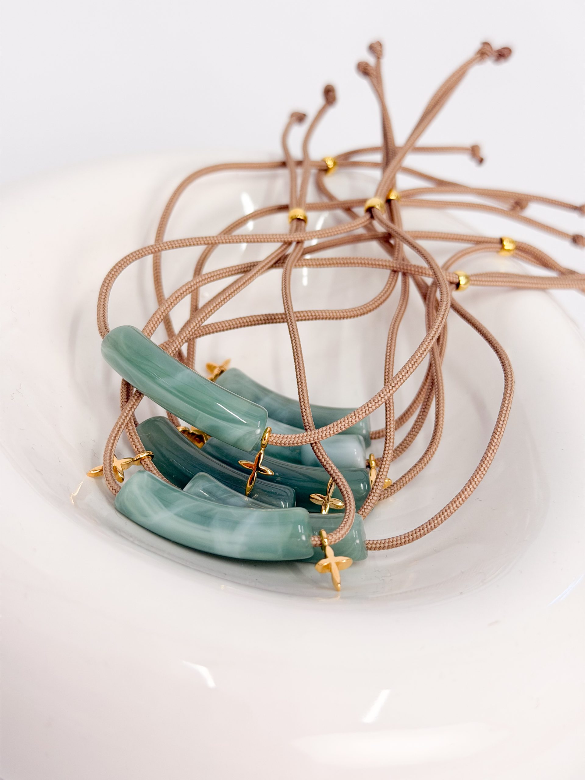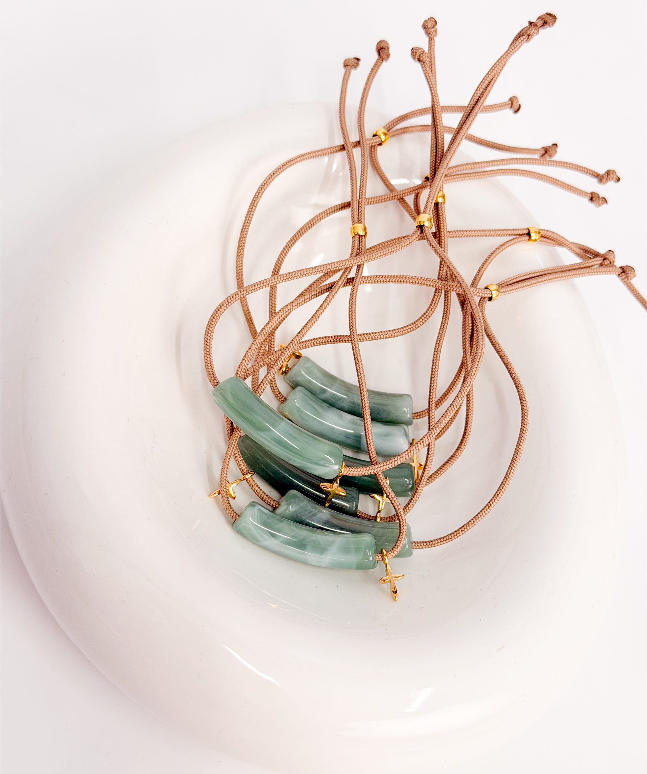 Μαρτυρικό βραχιόλι CELFIE AND CO M-47 με μπεζ κορδόνι,βεραμαν χάντρα και επιχρυσωμένο σταυρό.
