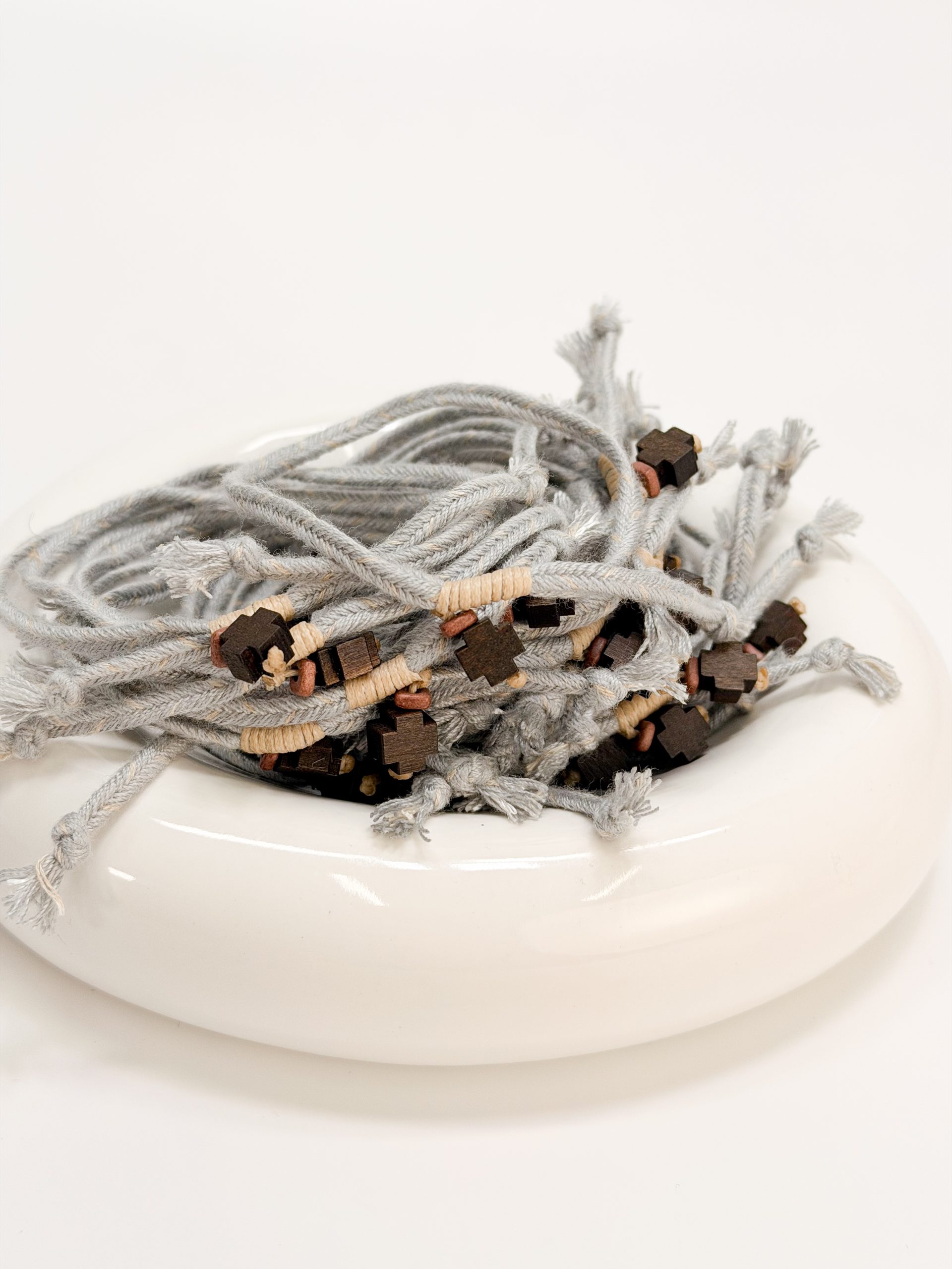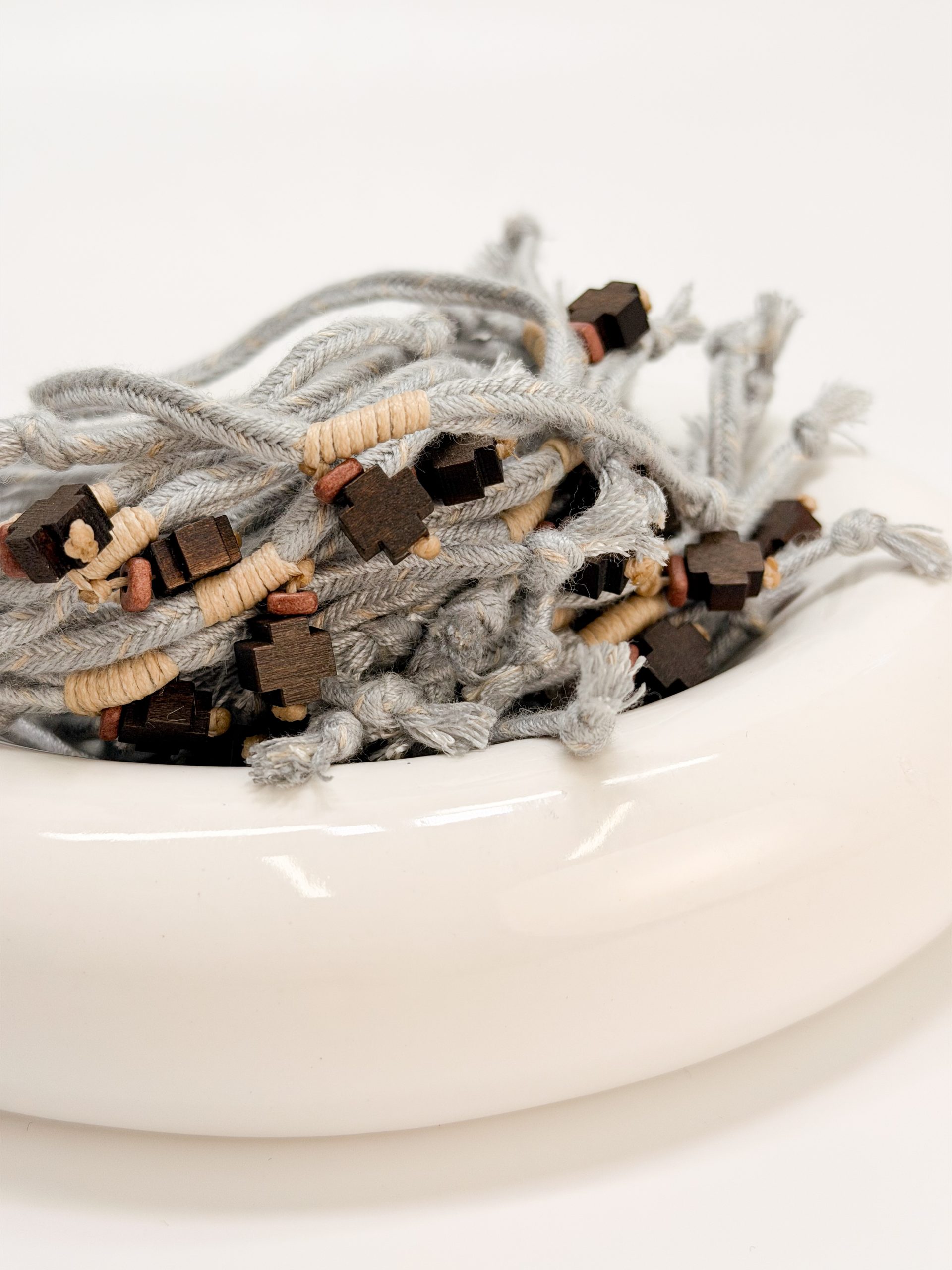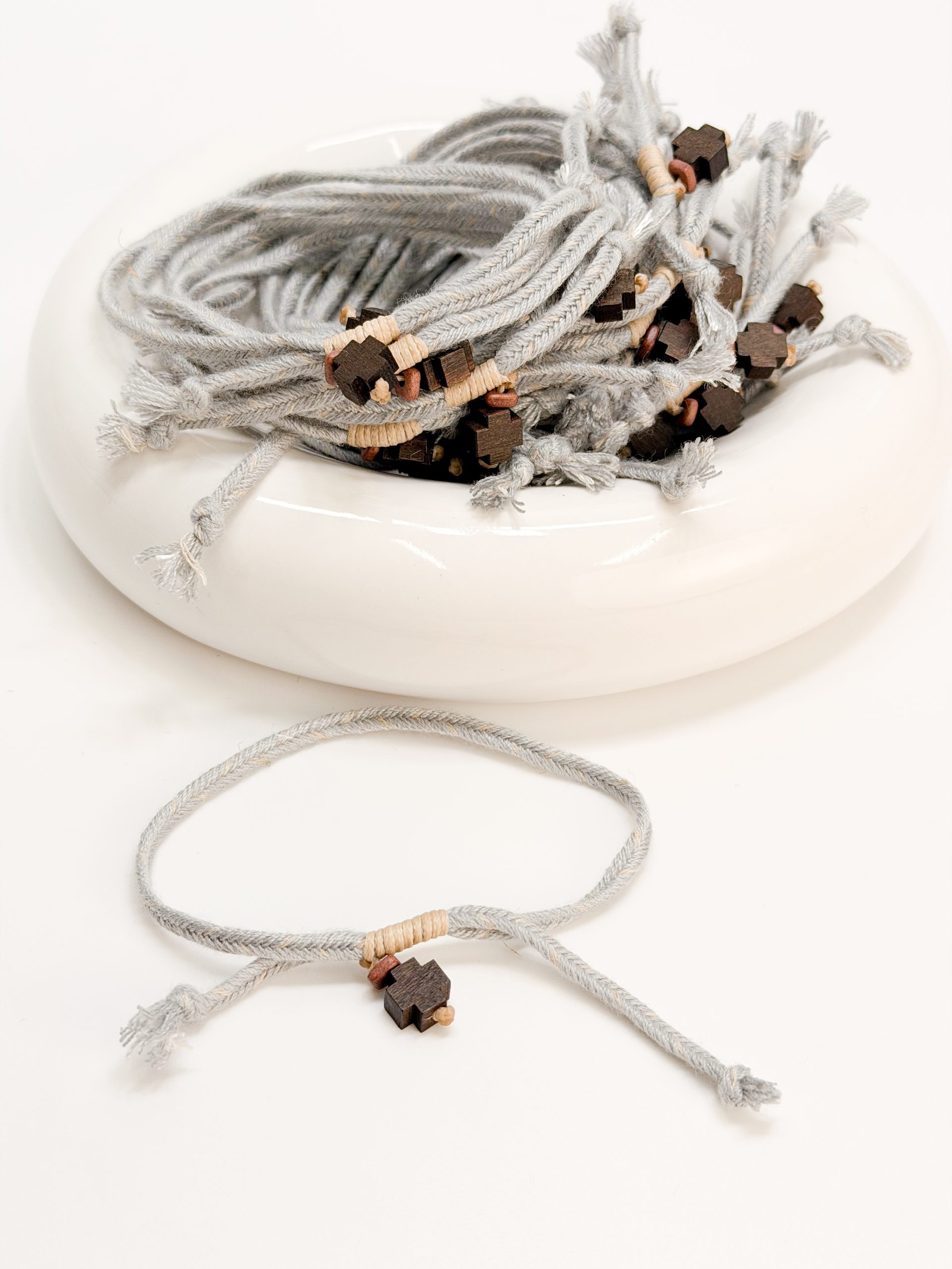 Μαρτυρικό βραχιόλι CELFIE AND CO N-76 με γκρι κορδόνι,μπεζ ροδέλα,δέσιμο και ξύλινο σταυρό.