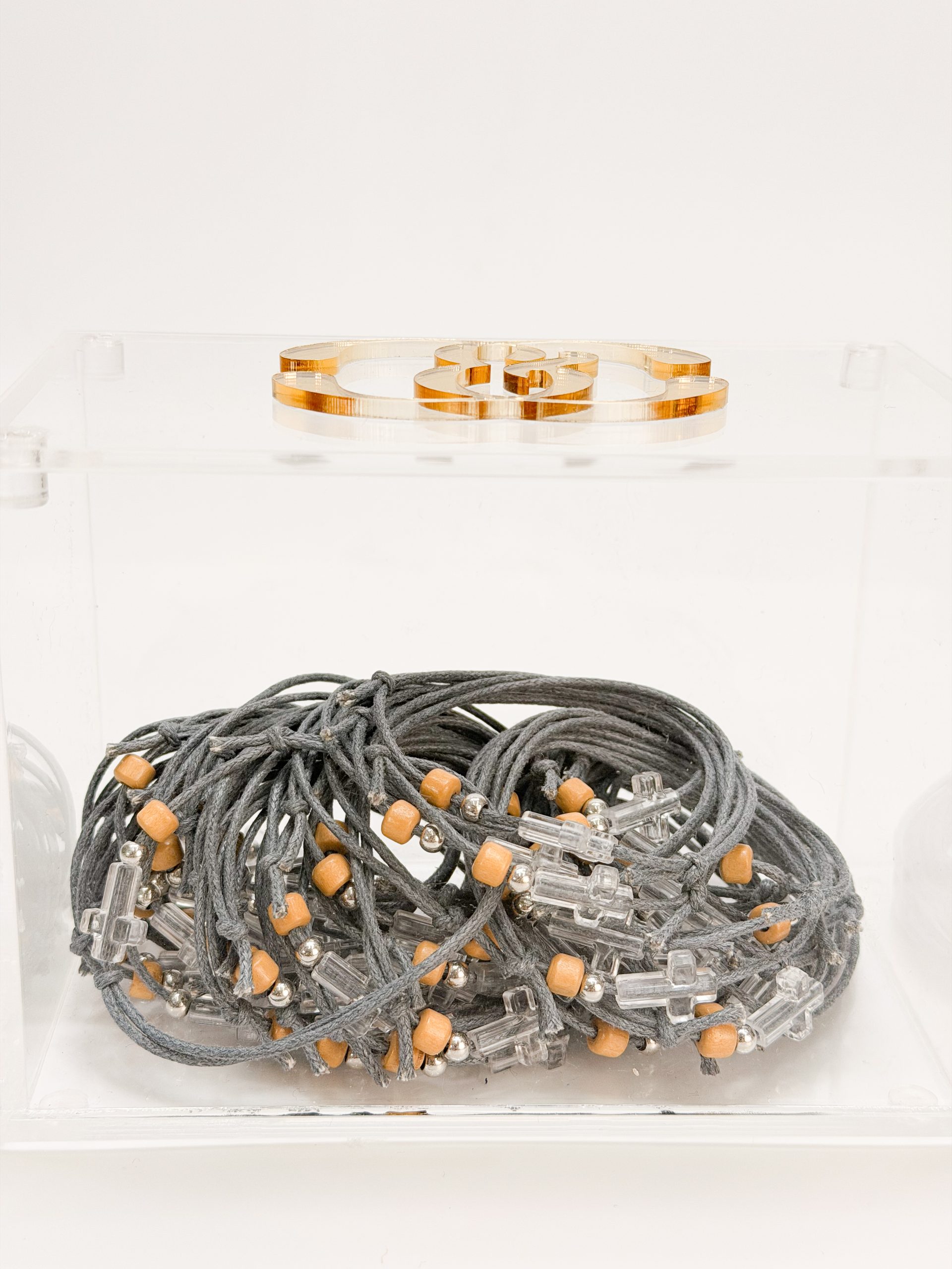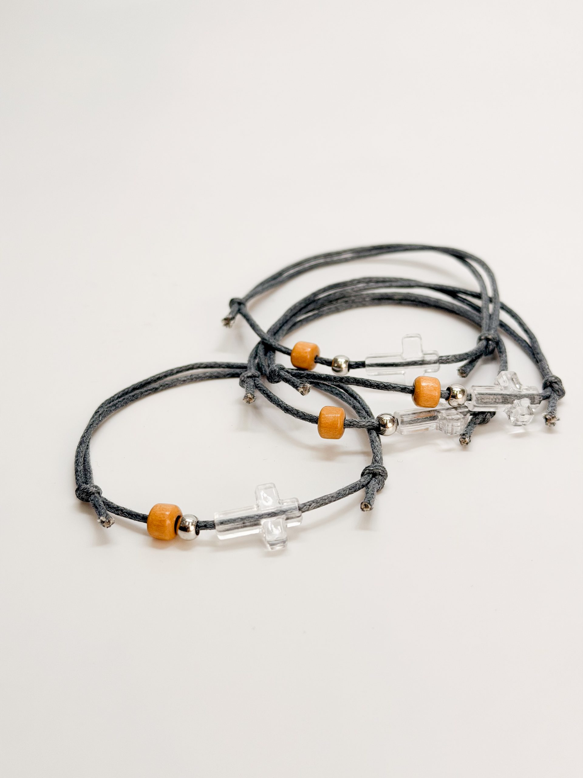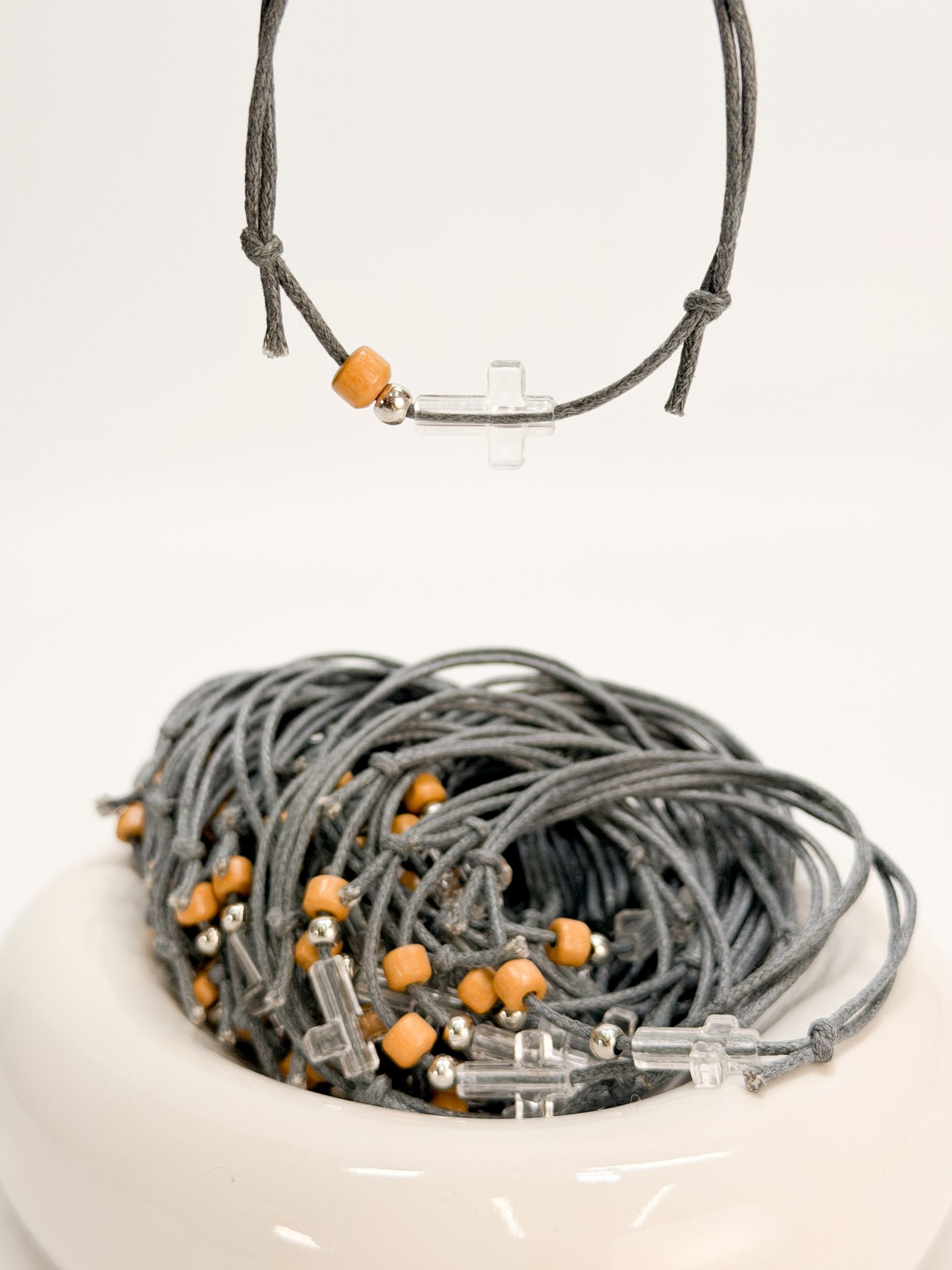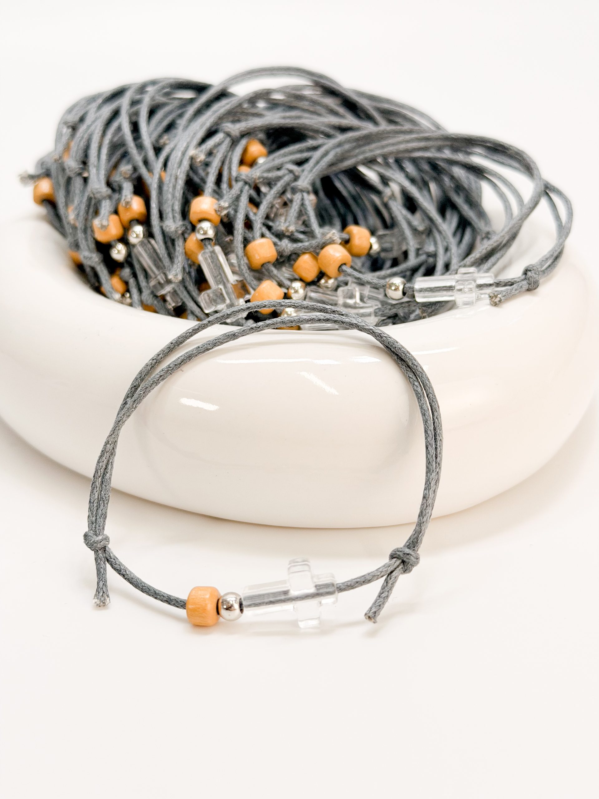 Μαρτυρικό βραχιόλι CELFIE AND CO N-81 με γκρι κορδόνι,διάφανο ακρυλικό σταυρό και ξύλινη χάντρα.