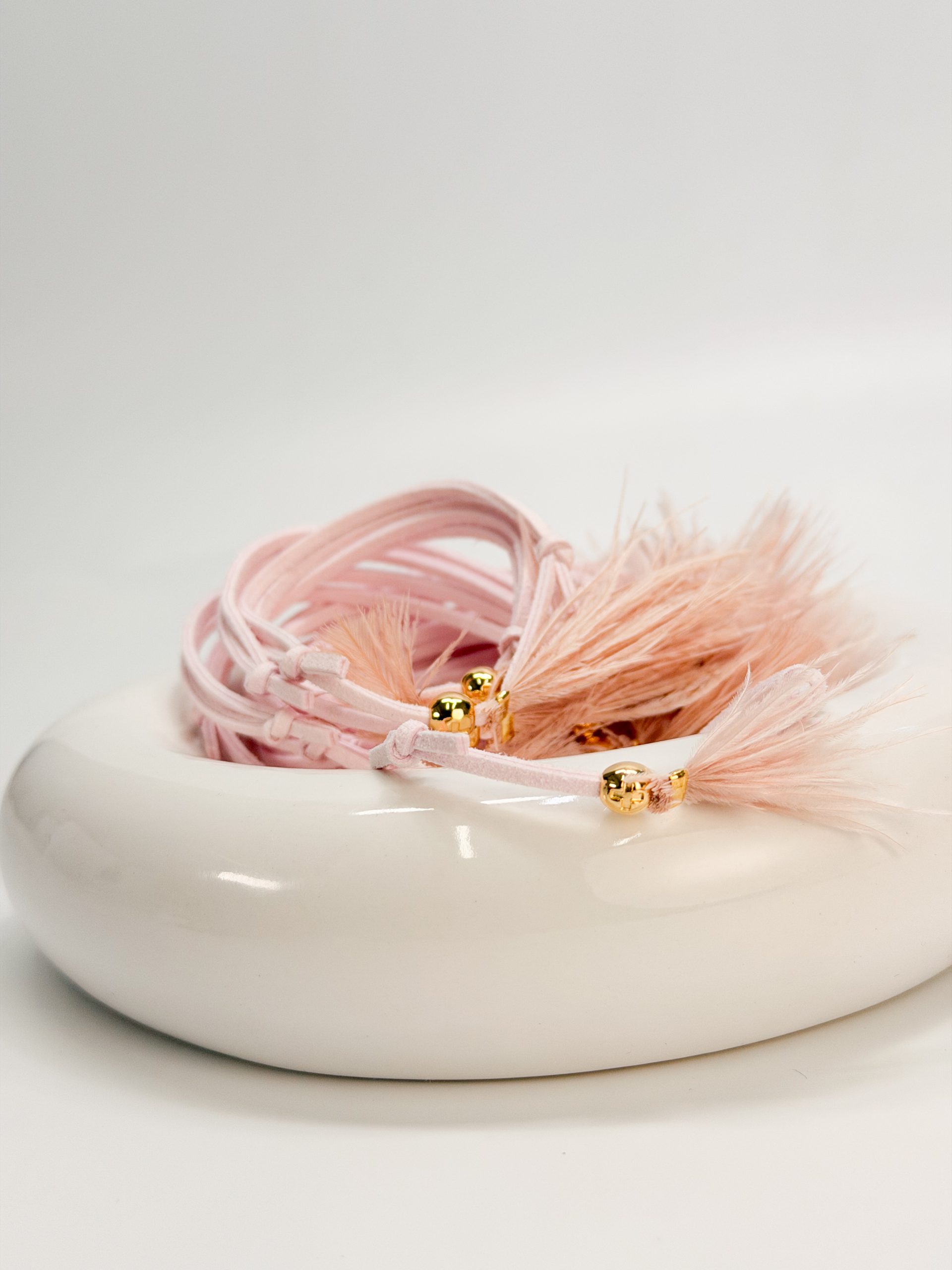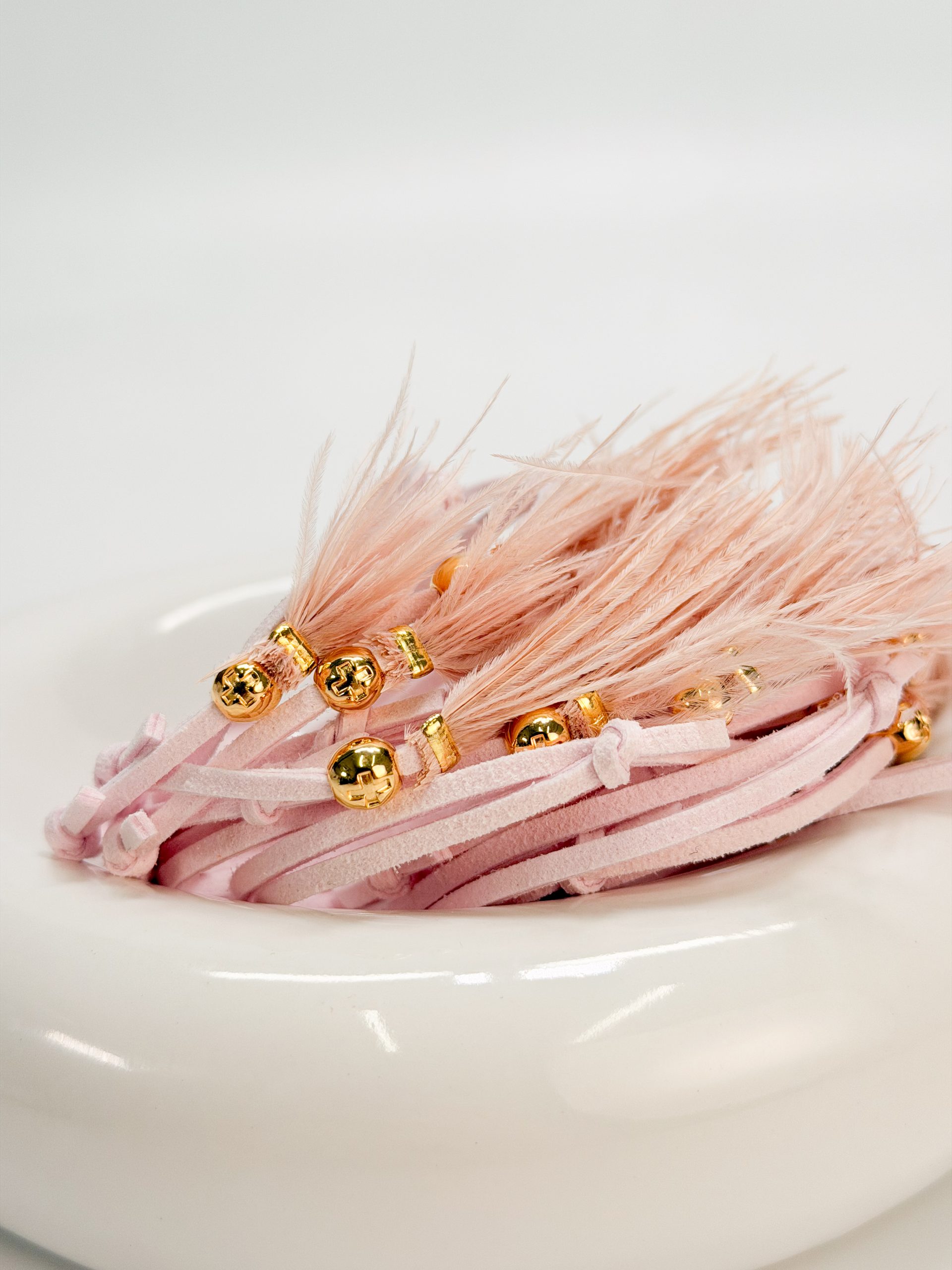 Μαρτυρικό βραχιόλι CELFIE AND CO T-82 με σουετ κορδόνι ροζ ανοιχτό,επιχρυσωμένο σταυρό και φτερό.