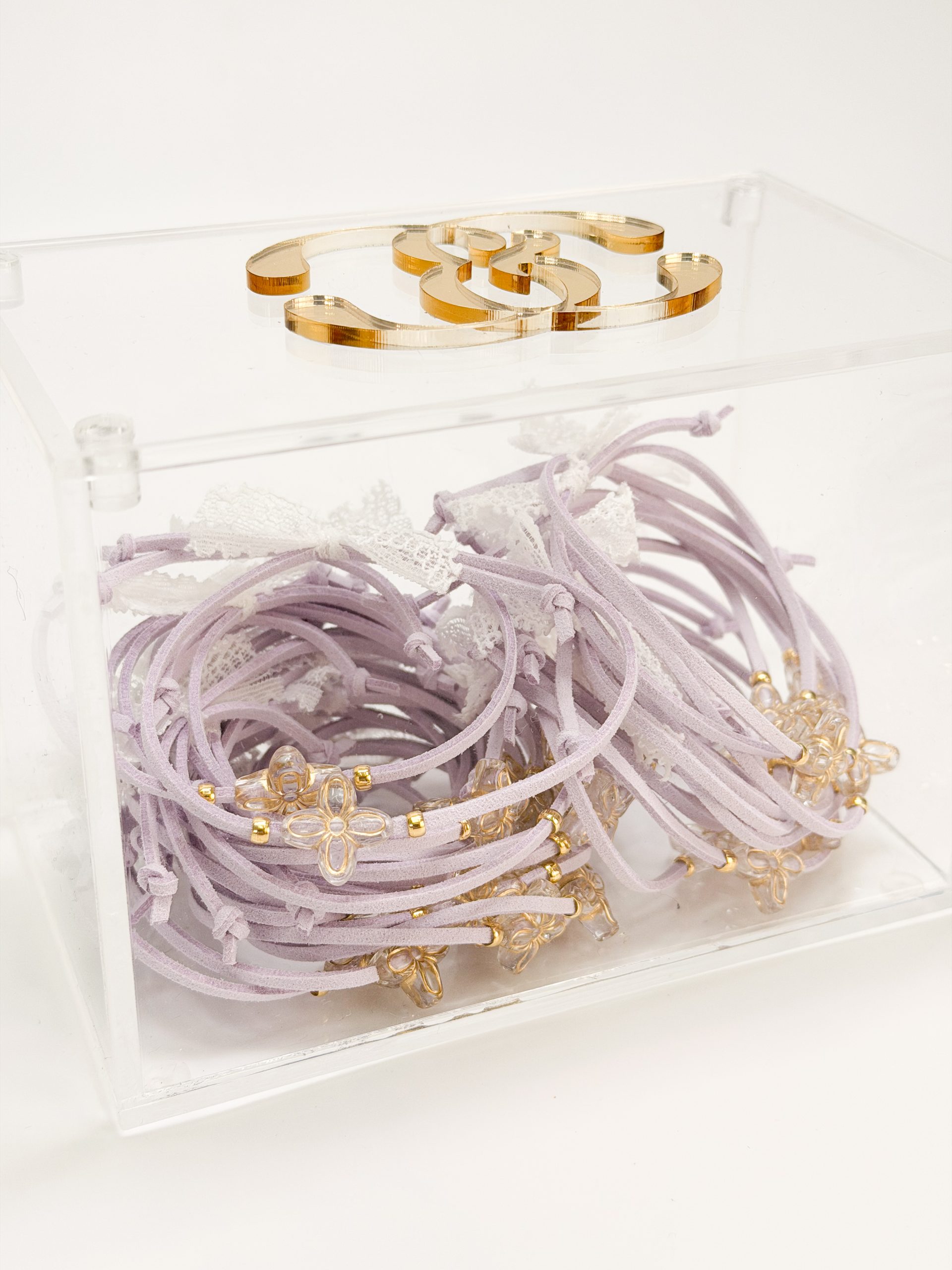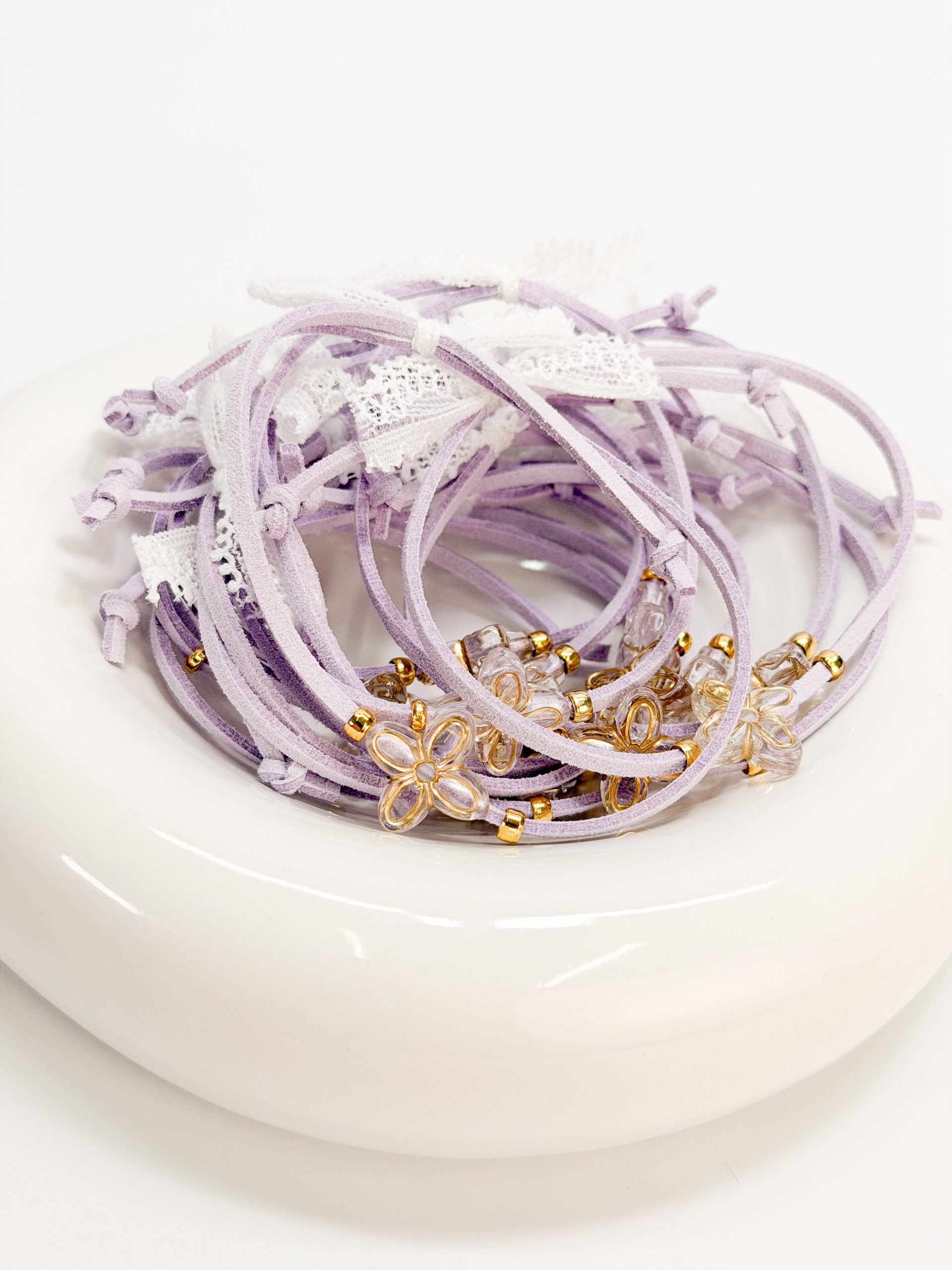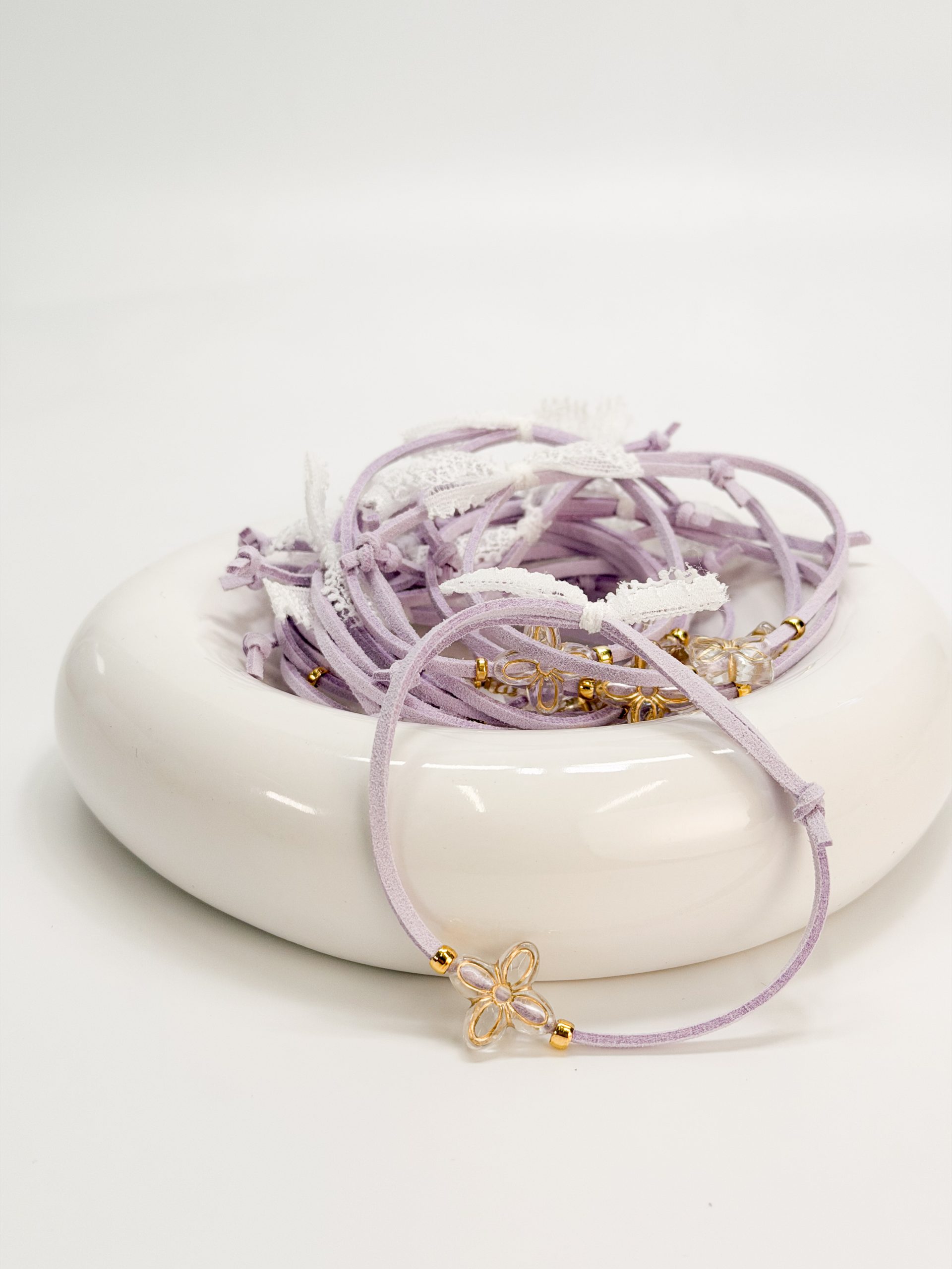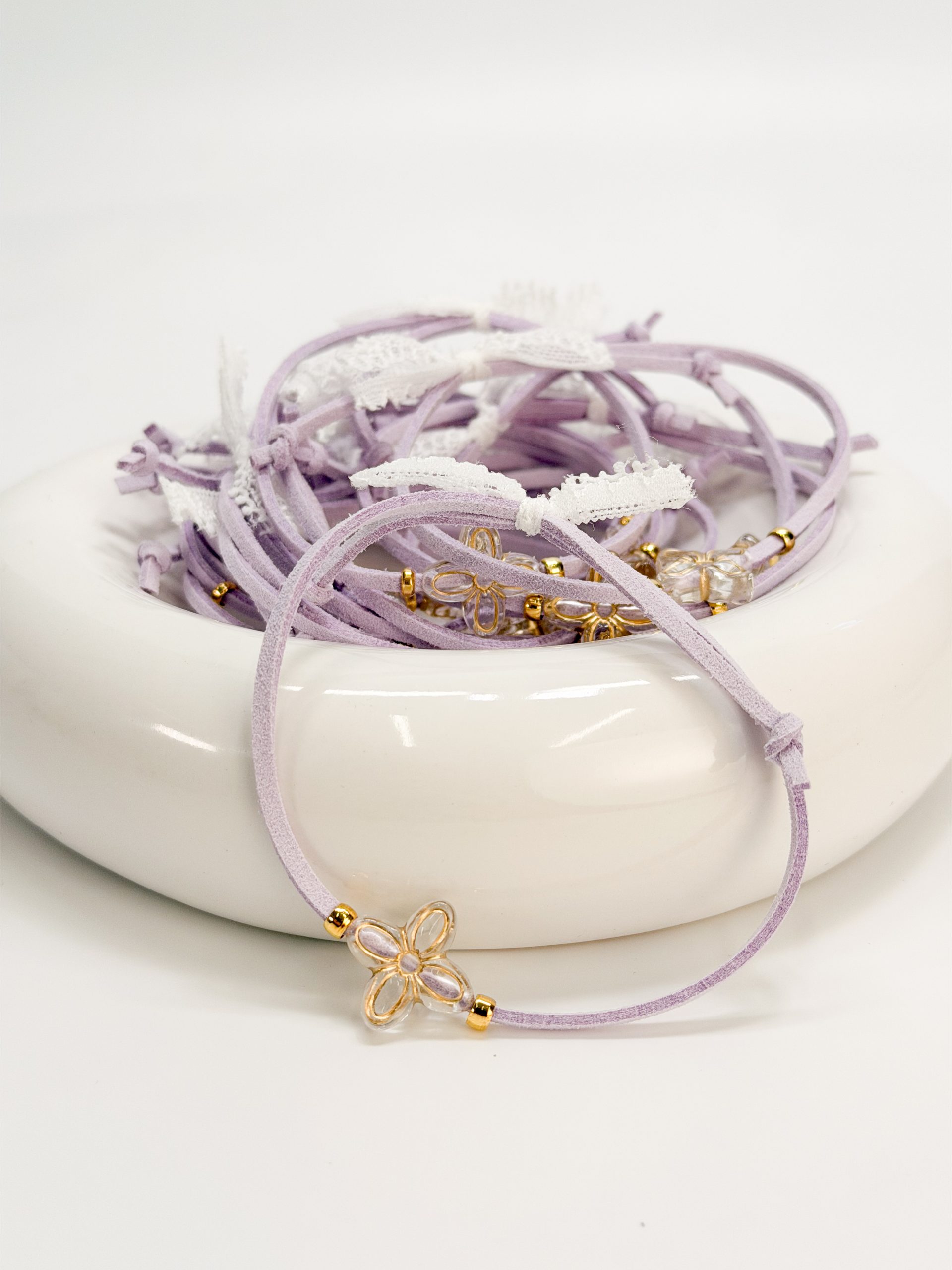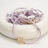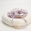 Μαρτυρικό βραχιόλι CELFIE AND CO T-91 με λιλά σουετ κορδόνι,ακρυλικό σταυρό σε σχήμα λουλουδιού και δαντέλα.