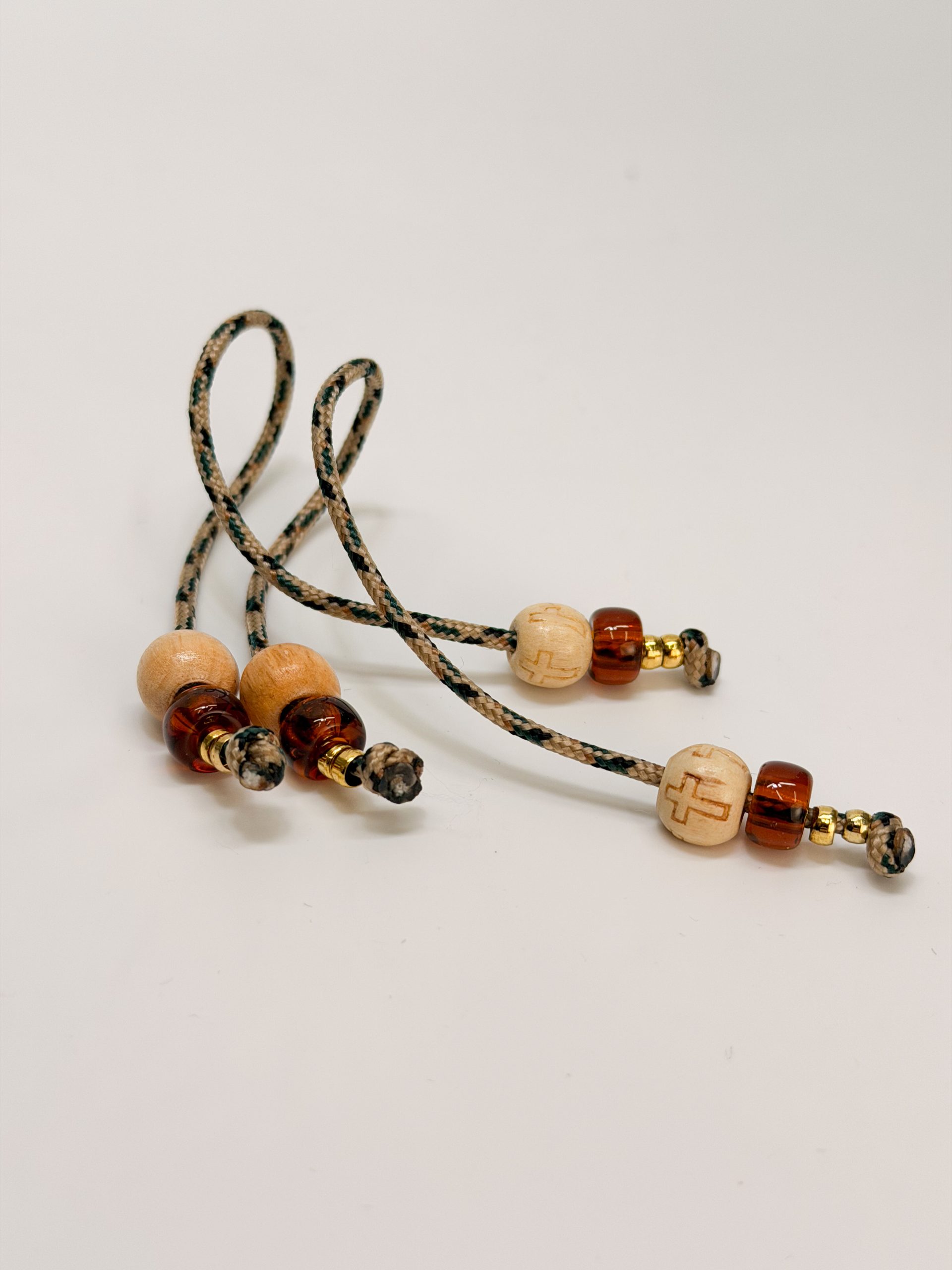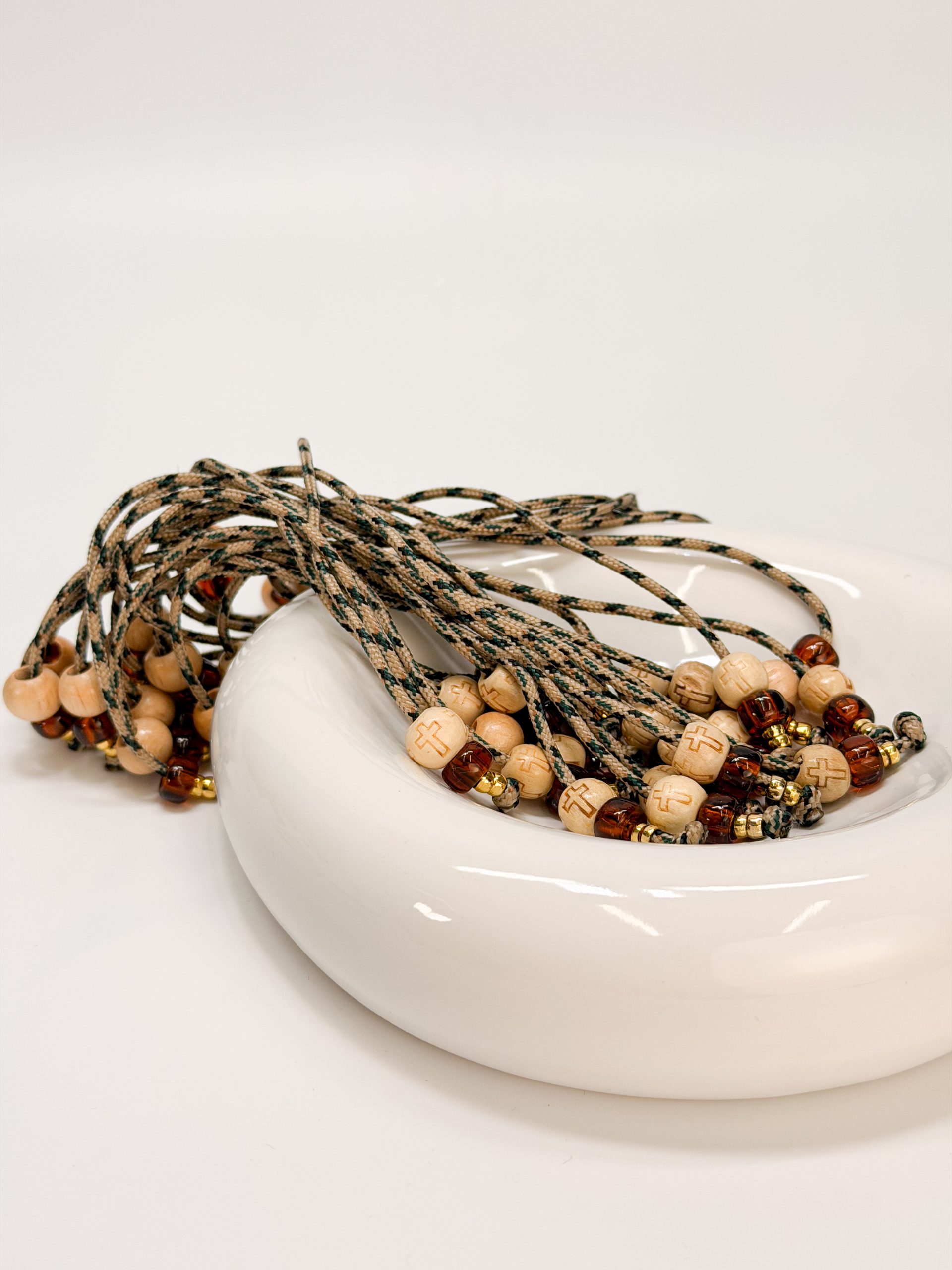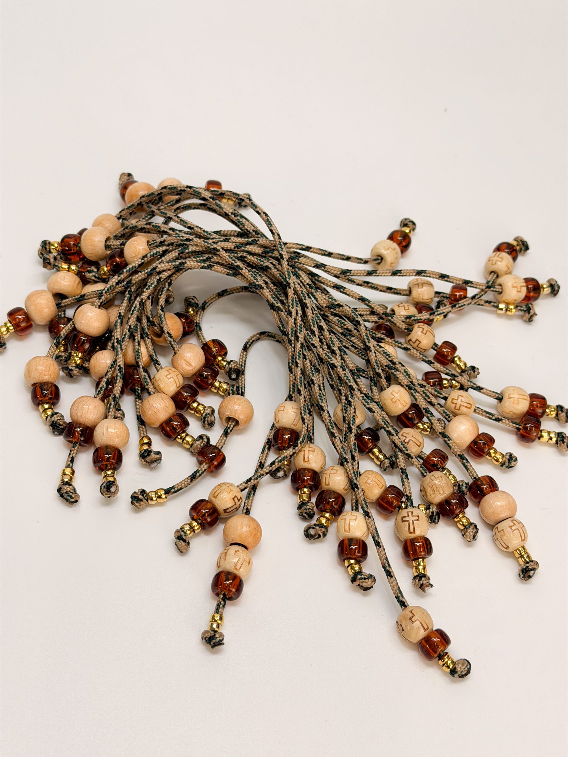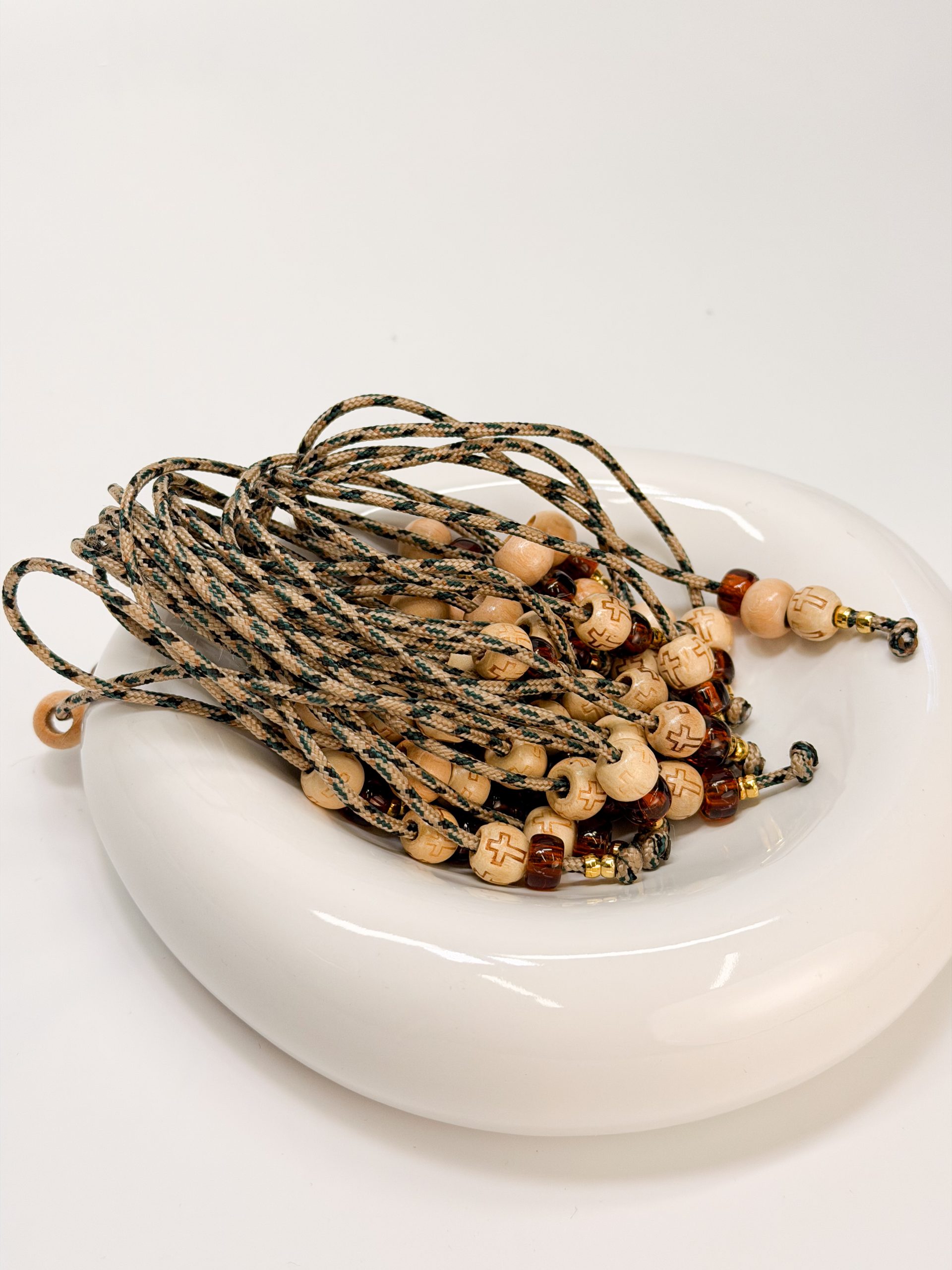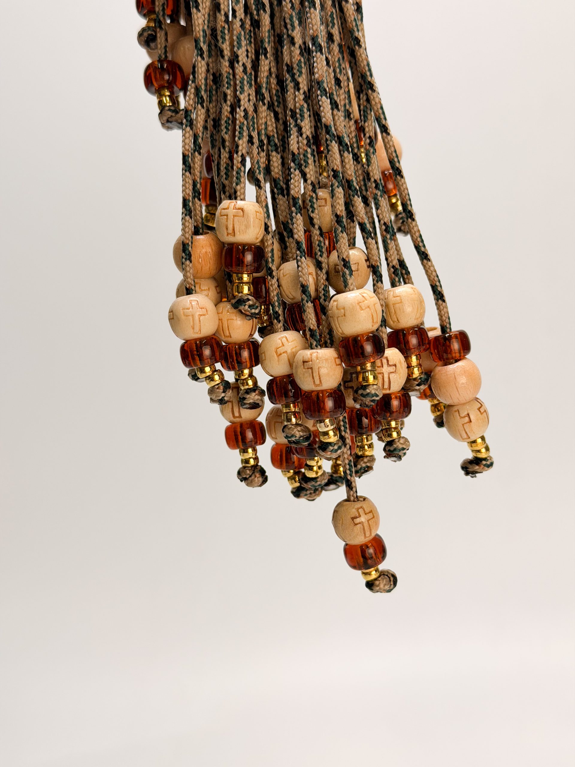 Μαρτυρικό κομπολόι CELFIE AND CO E-55 με κορδόνι σε 3 αποχρώσεις,ξύλινο σταυρό και χάντρα και καφέ χάντρες.