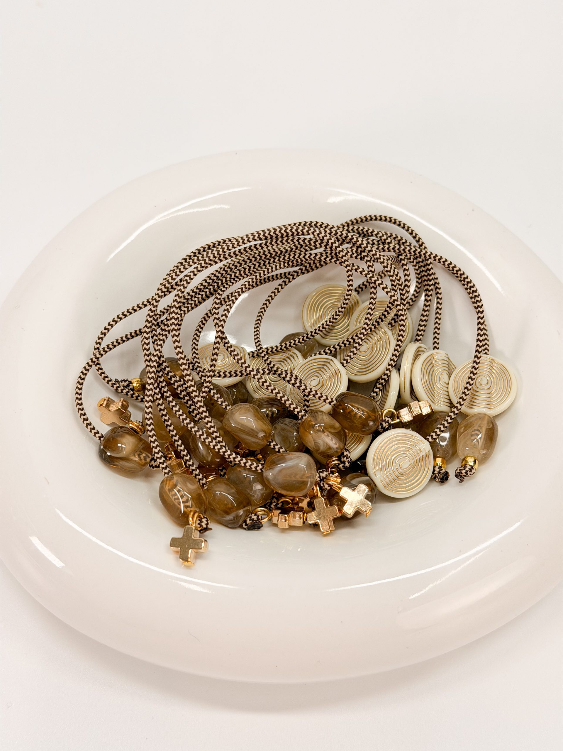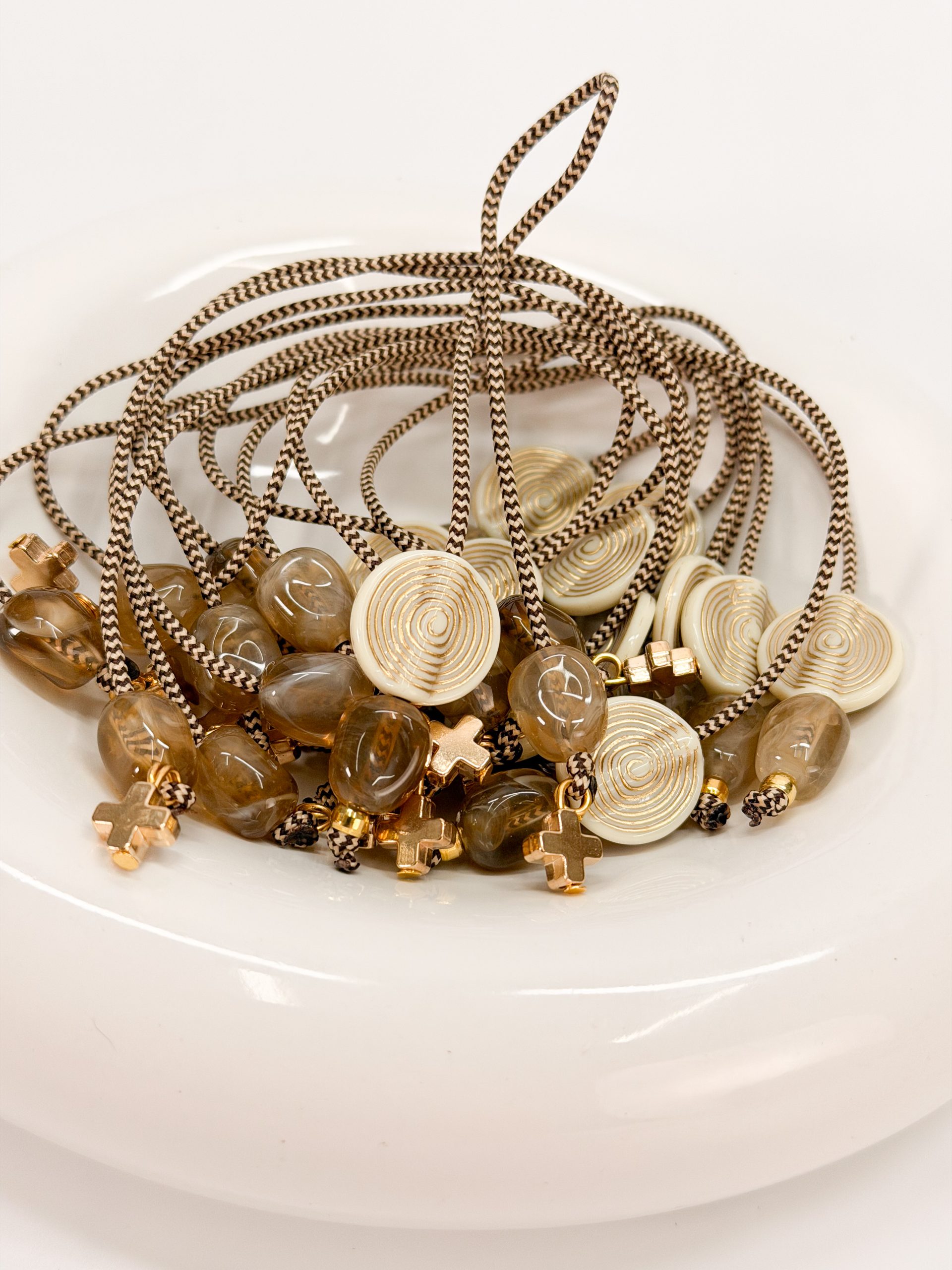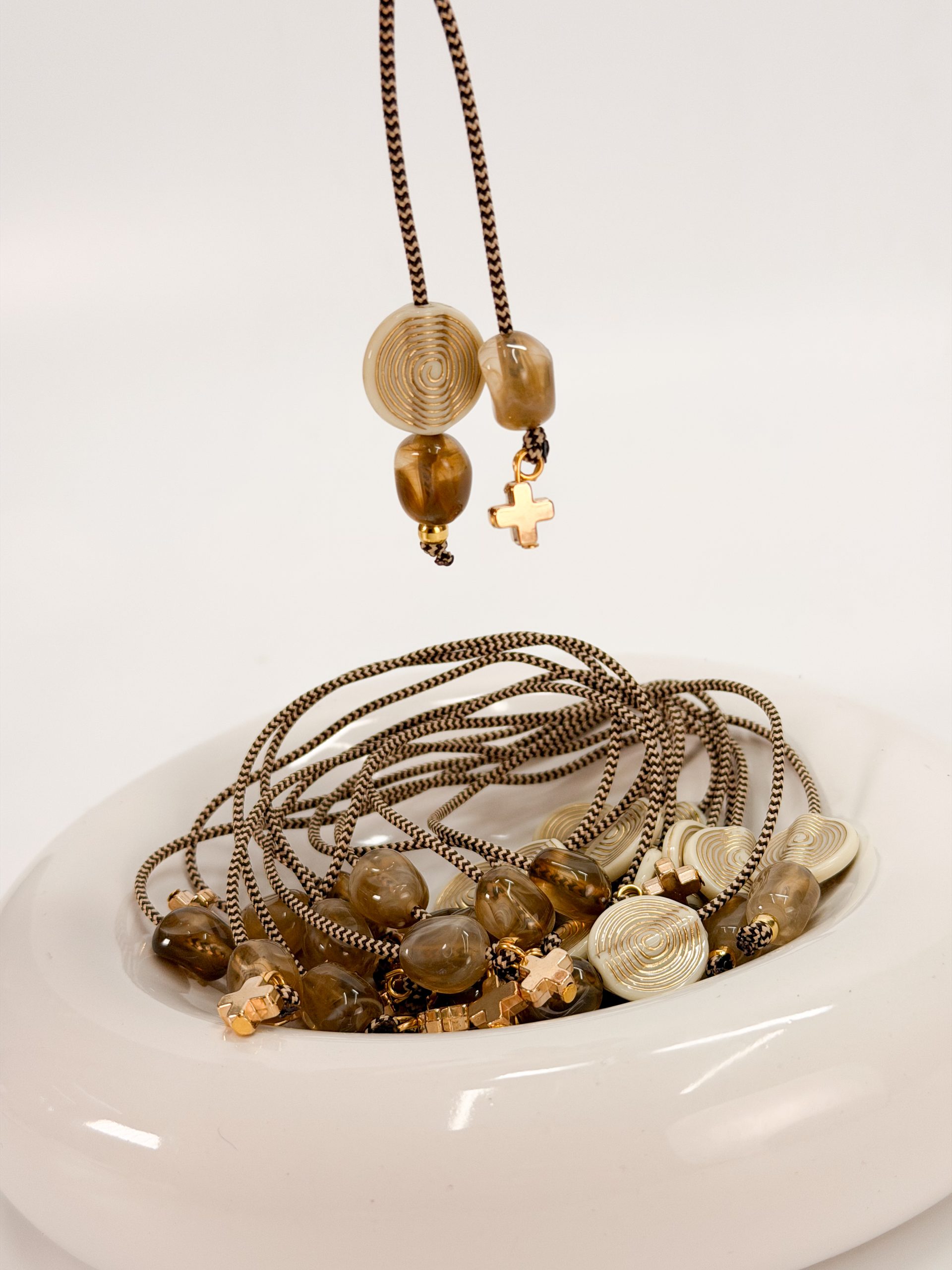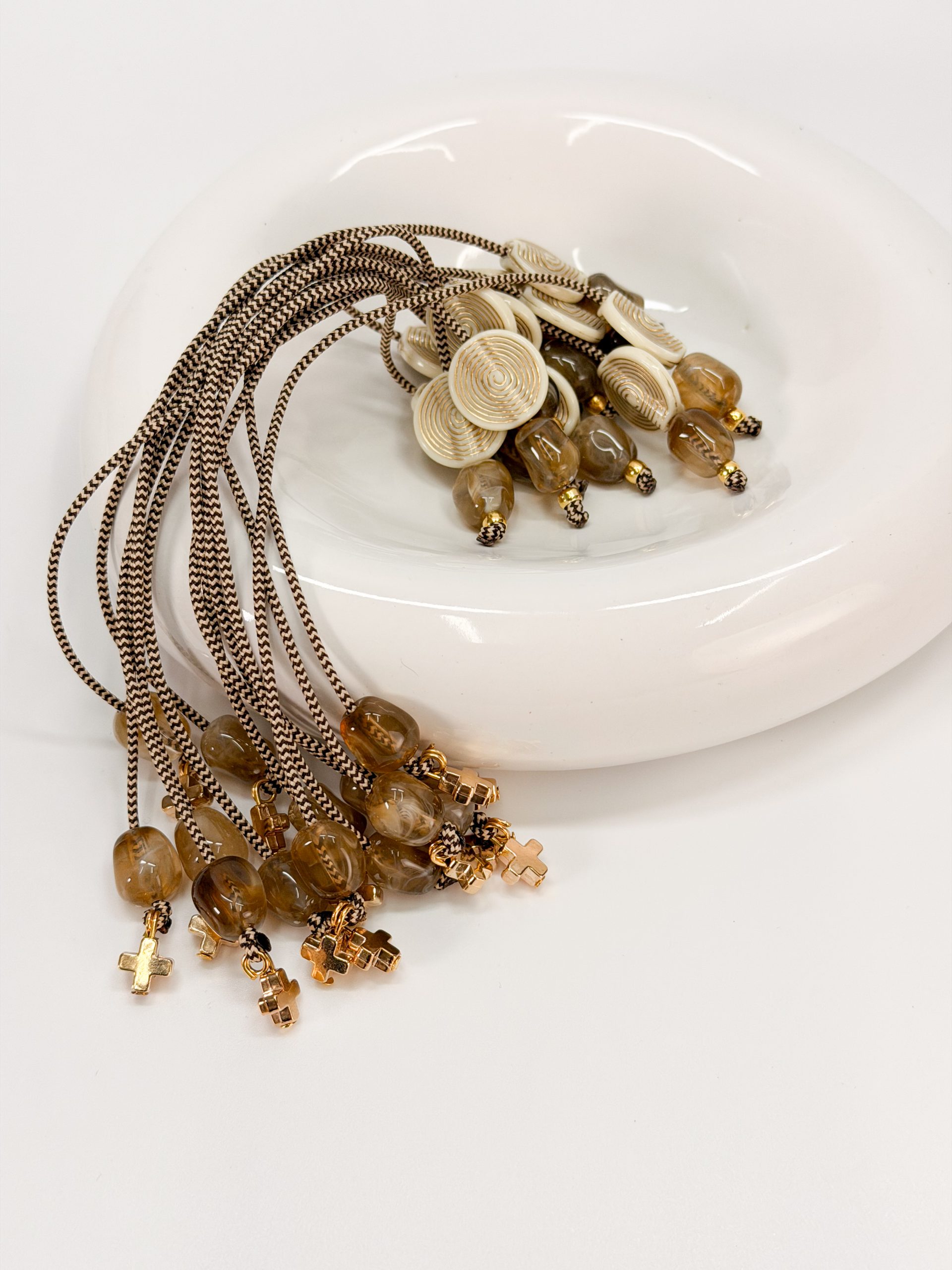 καφέ χάντρες και μοτιφ στρογγυλό σε χρυσό άσπρο.