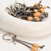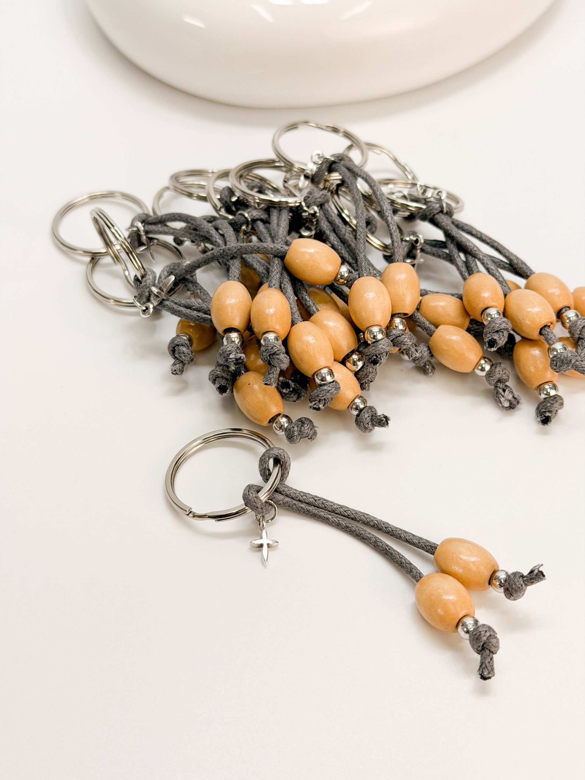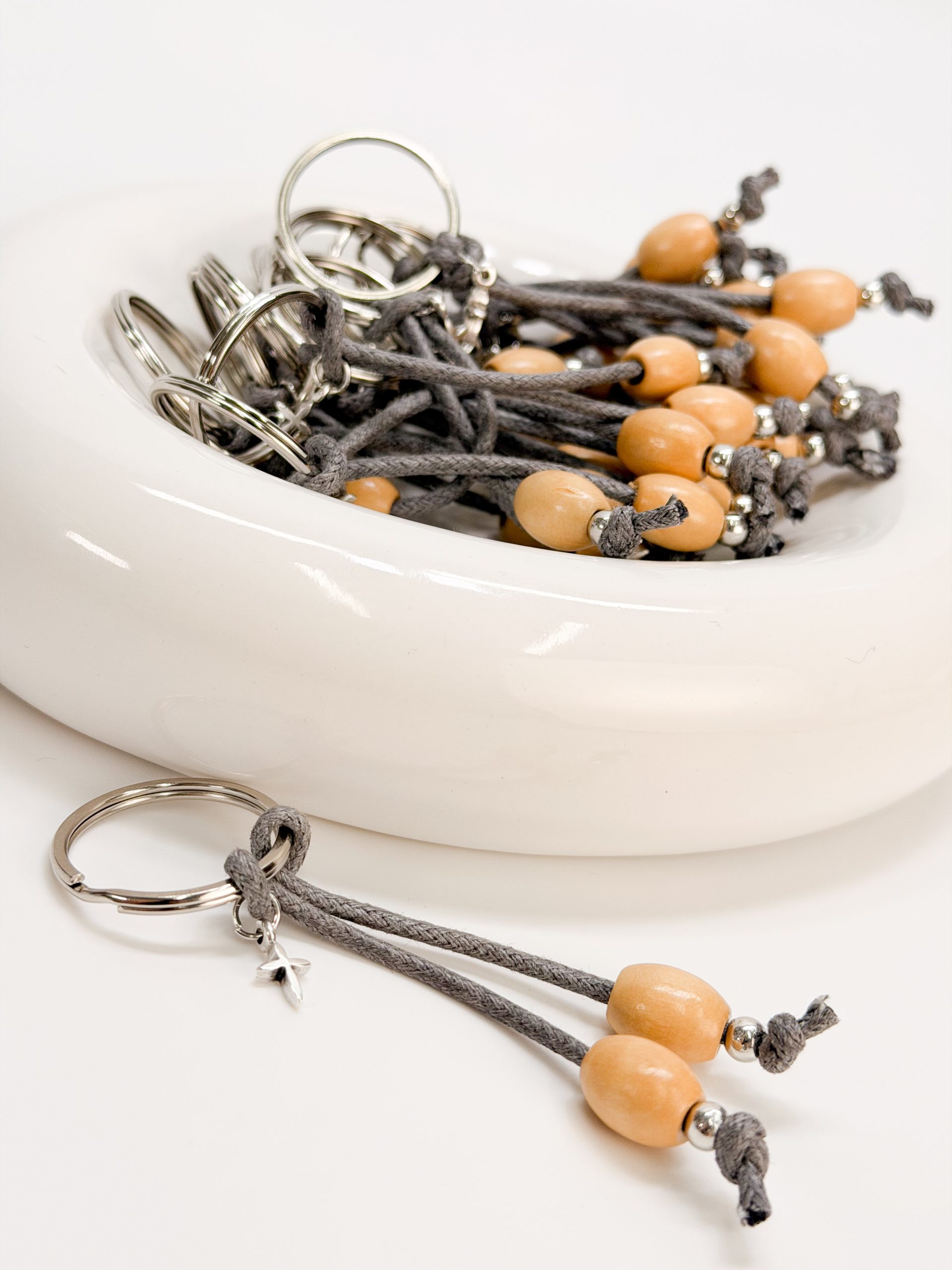 Μαρτυρικό μπρελοκ CELFIE AND CO N-80 με στοιχεία σε ασημί απόχρωση,ξύλινες χάντρες,γκρι κορδόνι και σταυρό.