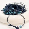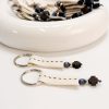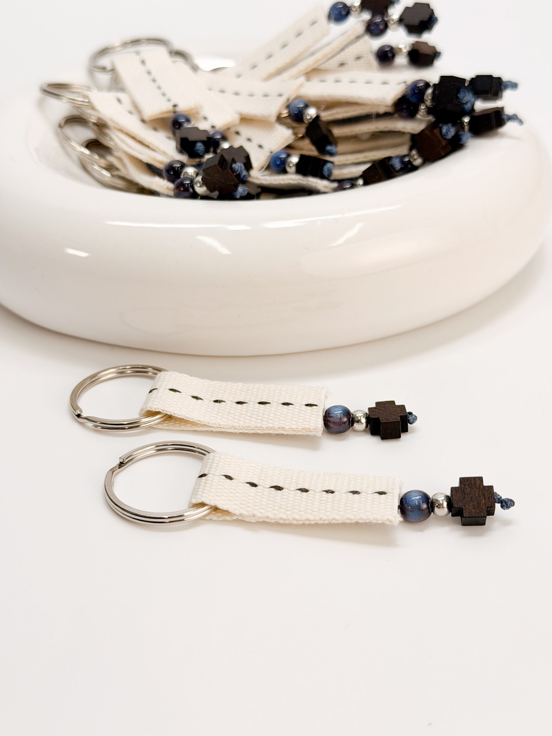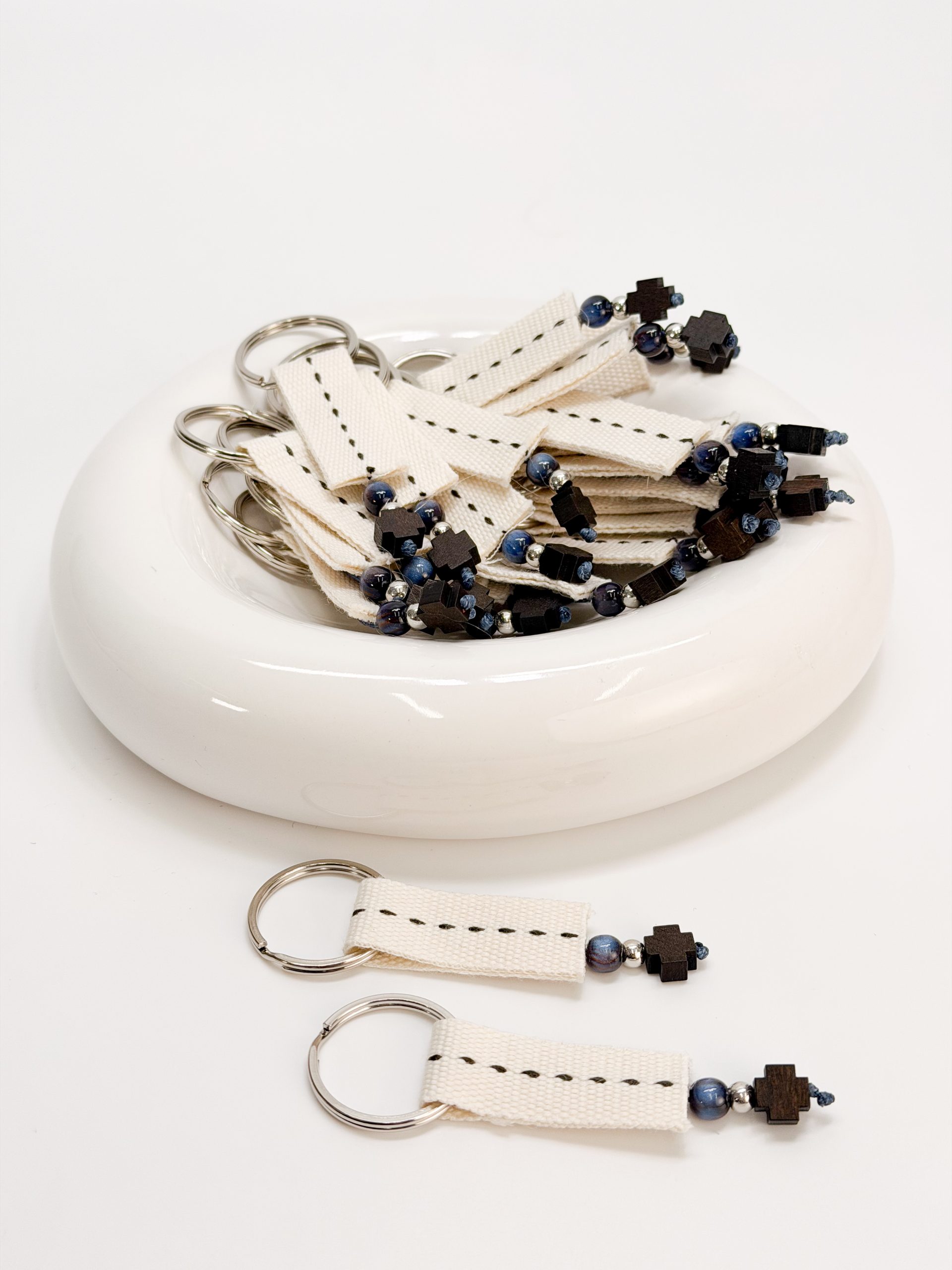 Μαρτυρικό μπρελόκ CELFIE AND CO A-65 με εκρού τρέσα,ξύλινο σταυρό,μπλε χάντρα και ασημί στοιχεία.