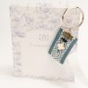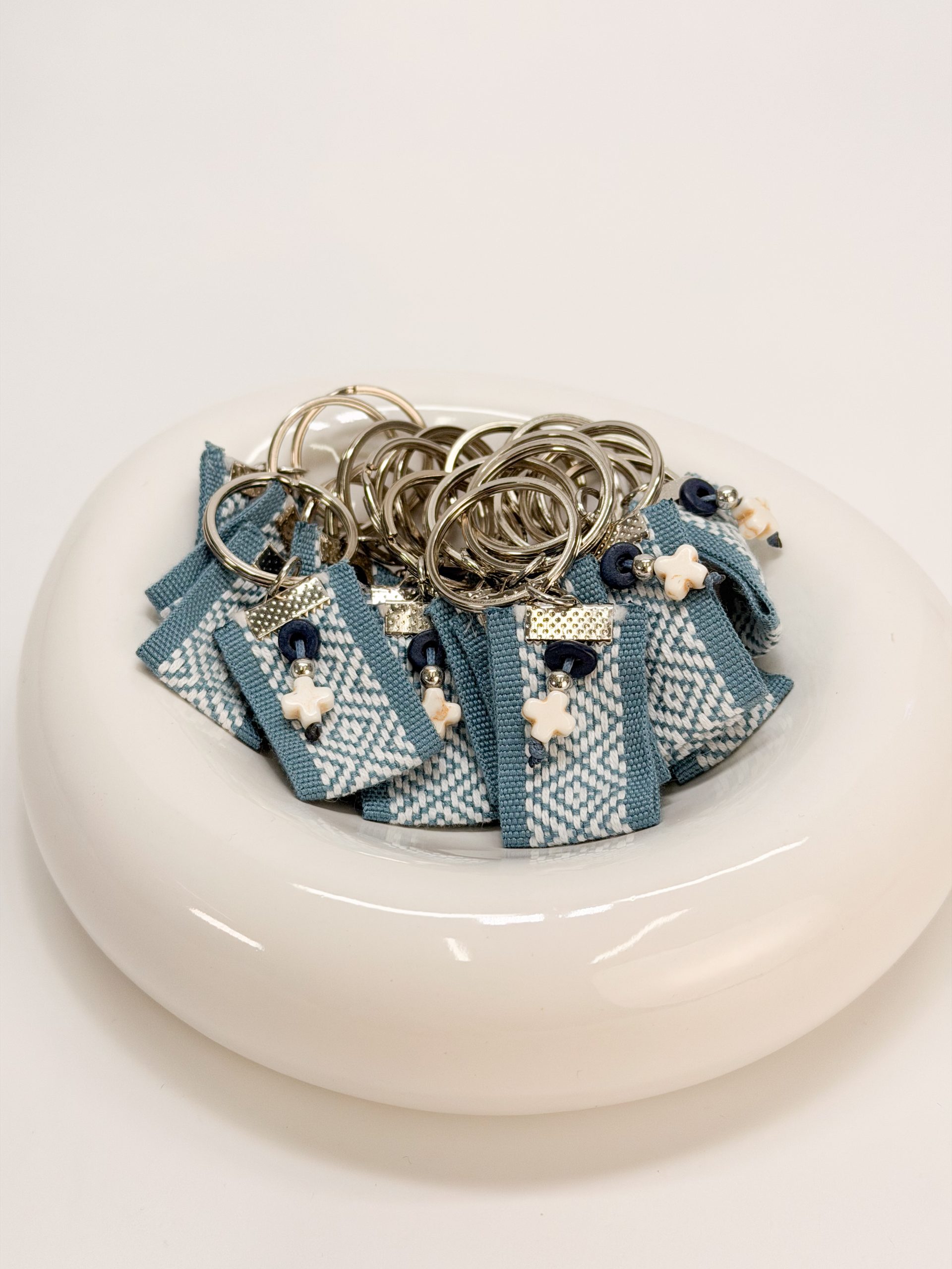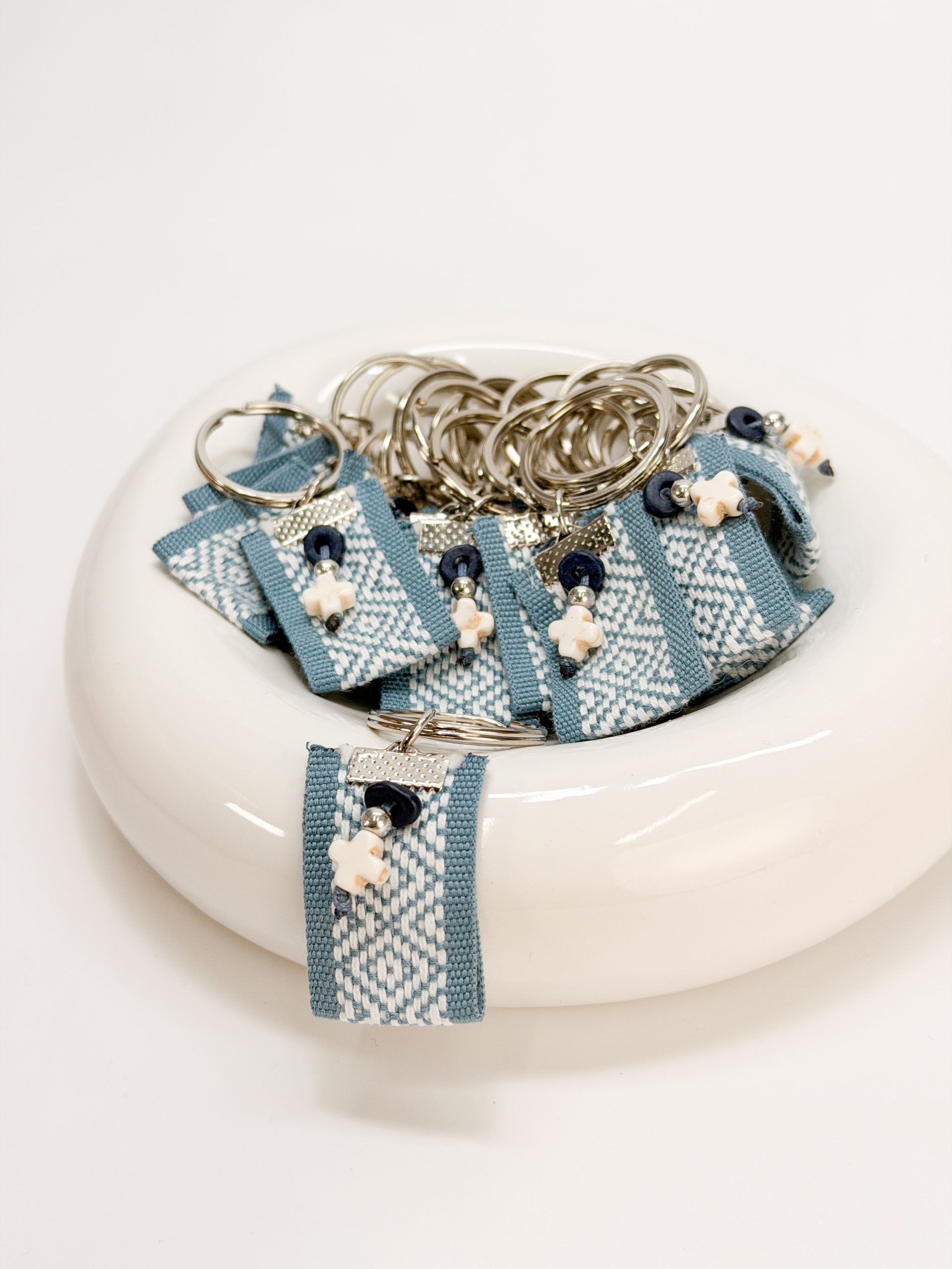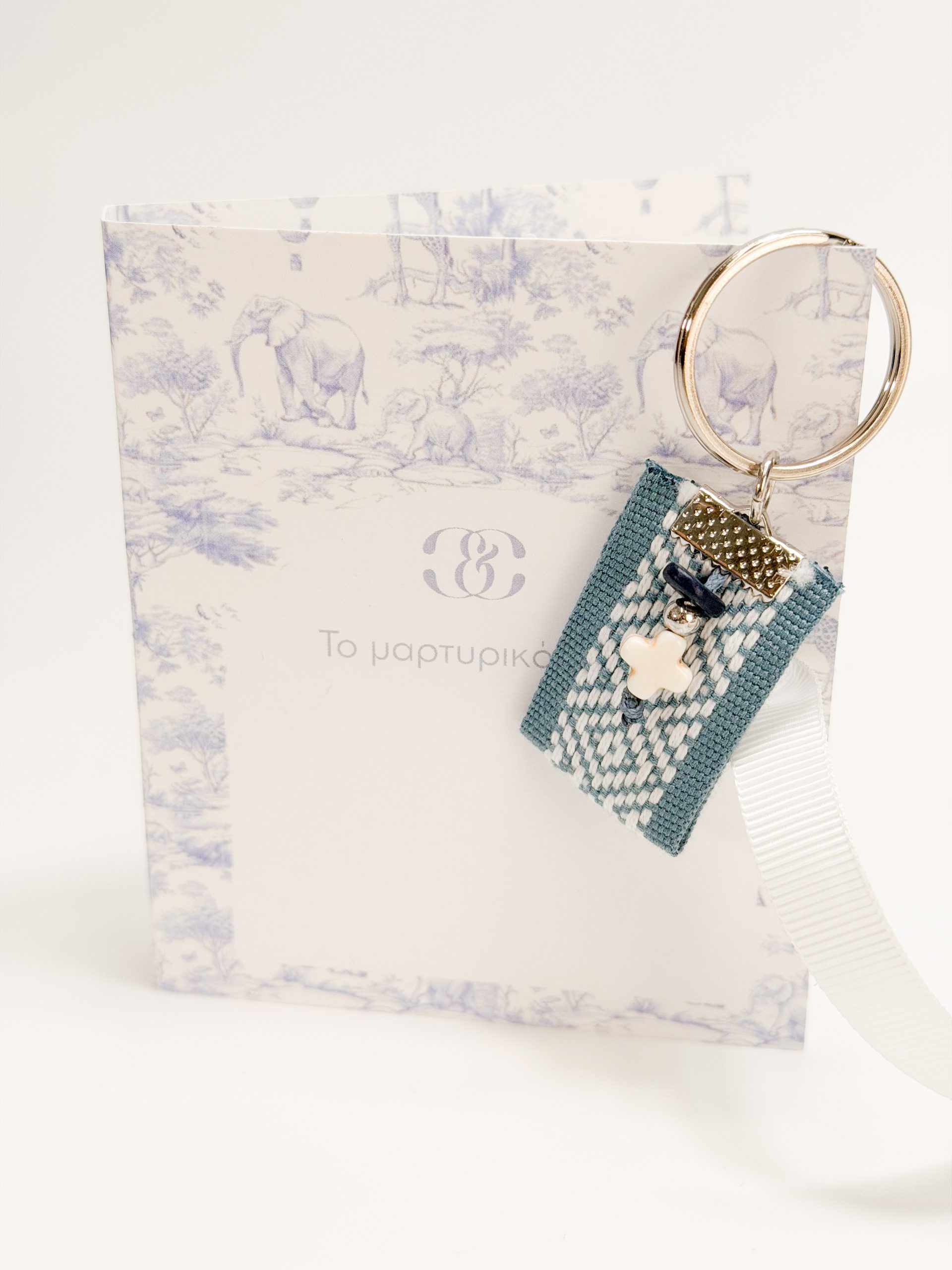 Μαρτυρικό μπρελοκ CELFIE AND CO G-13 σε ασημί απόχρωση,με δίχρωμη τρέσα,μπλε ροδέλα και σταυρό χαολίτη.
