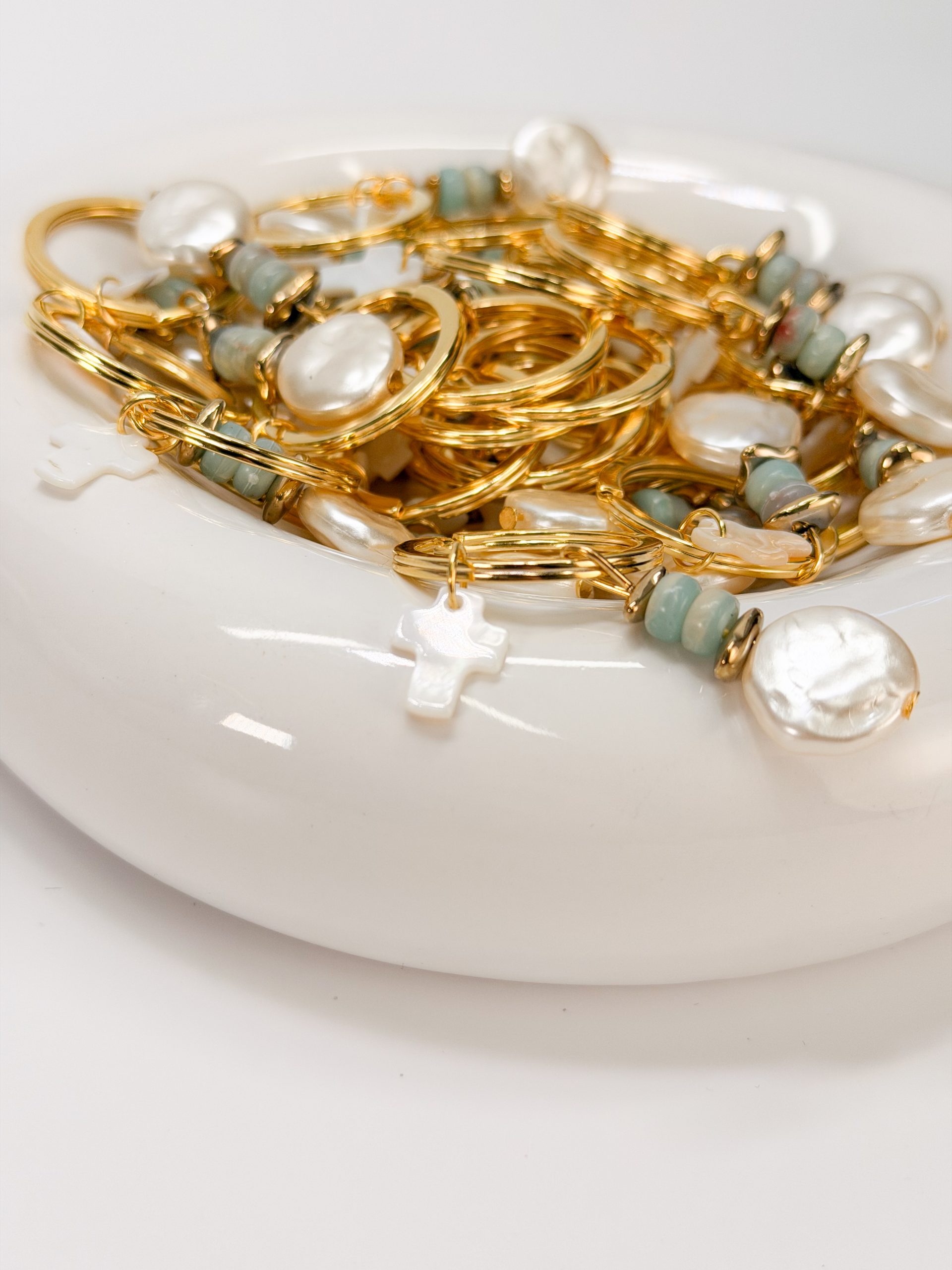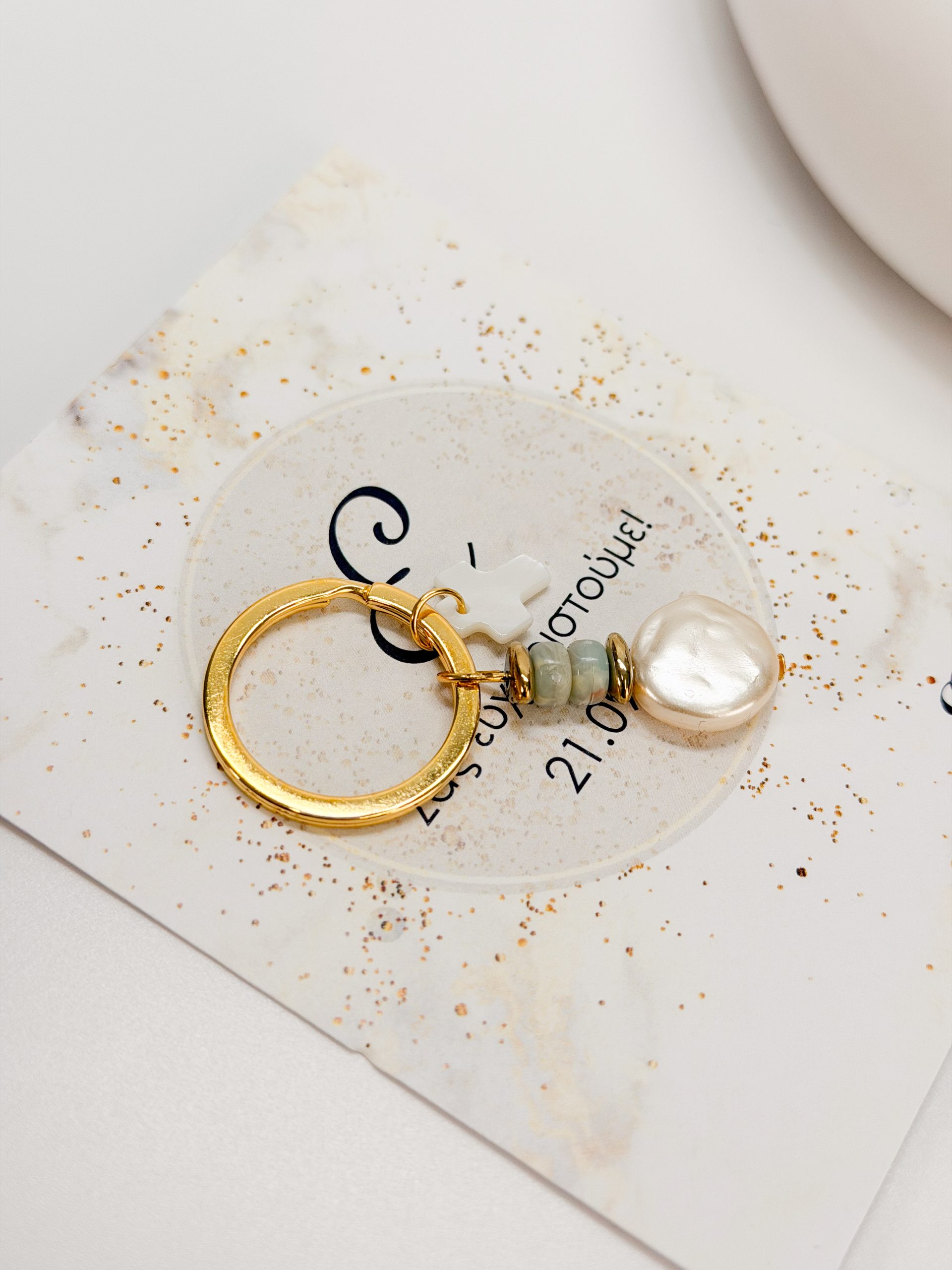 Μαρτυρικό μπρελόκ CELFIE AND CO M-48 με φίλντισι σταυρό,χάντρες αιματίτης,βεραμαν δίχρωμες χάντρες και στρογγυλή πέρλα πλακέ.