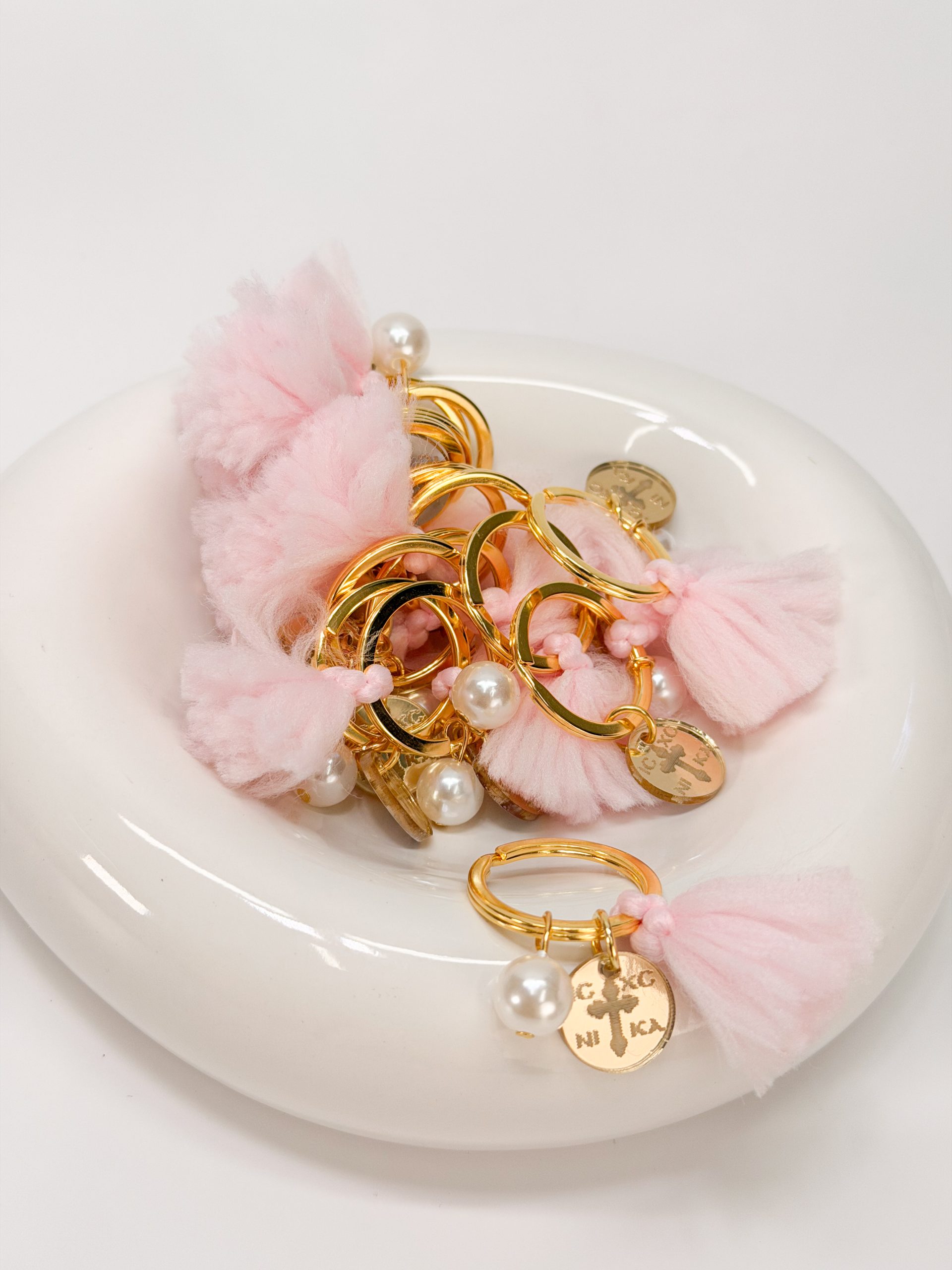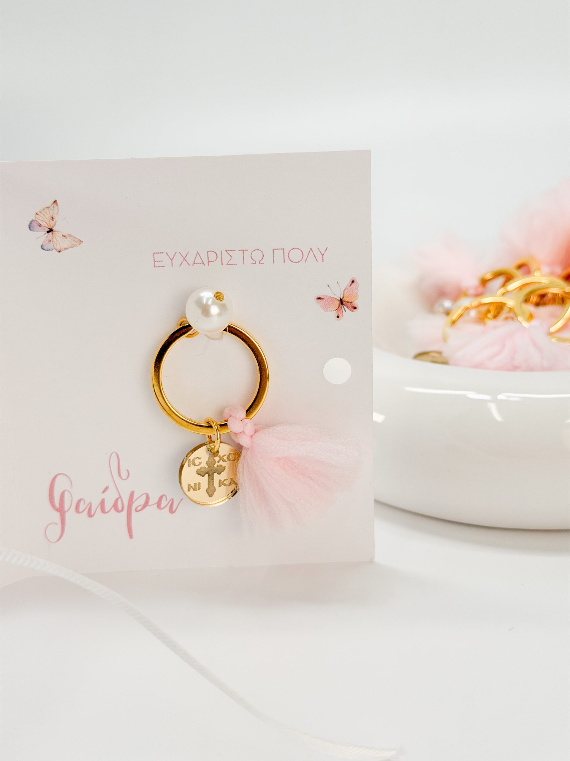Μαρτυρικό μπρελόκ CELFIE AND CO R-28 με ροζ φούντα,πέρλα και σταυρό κωνσταντινάτο plexiglass.
