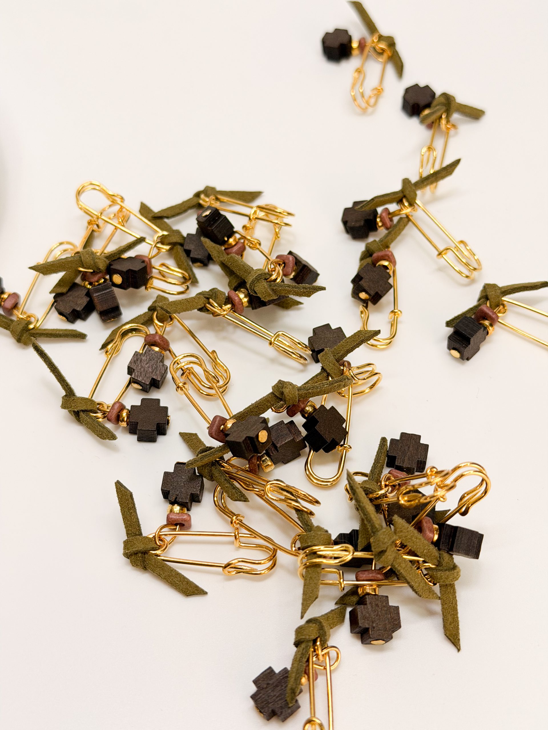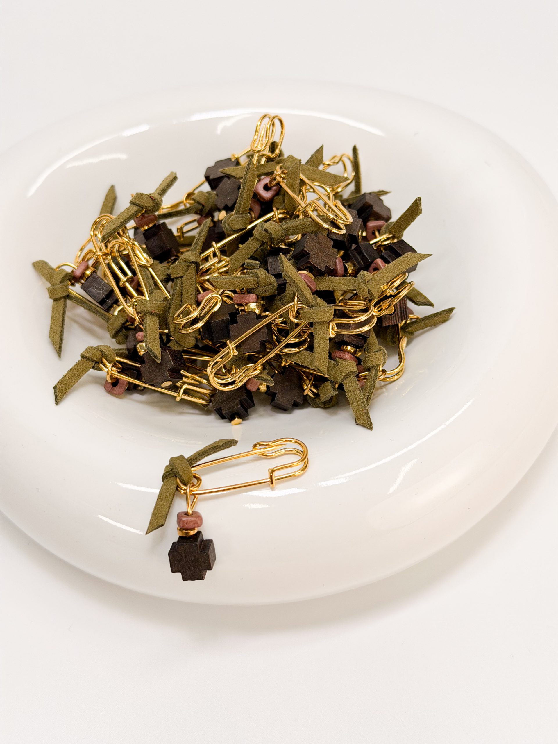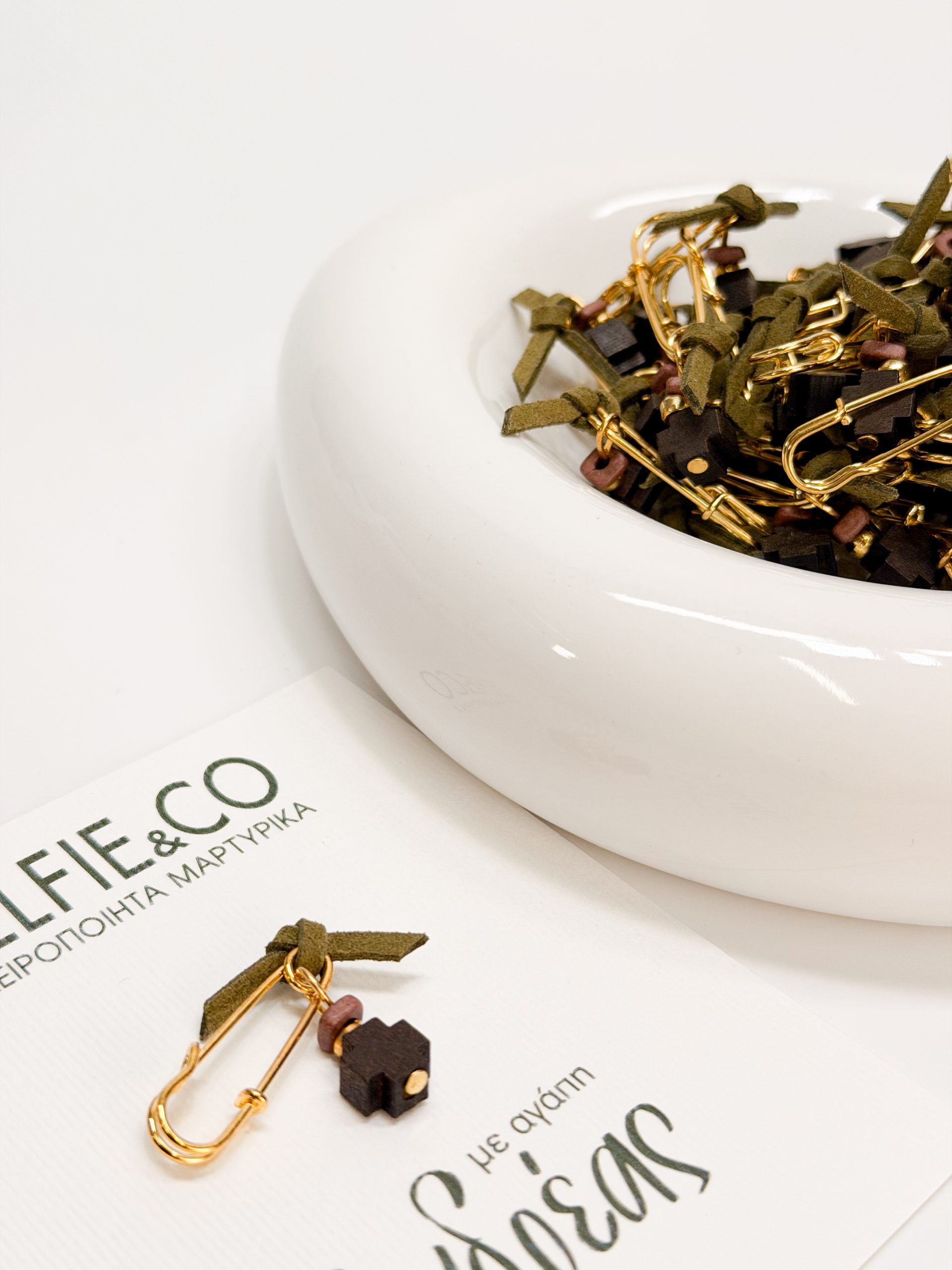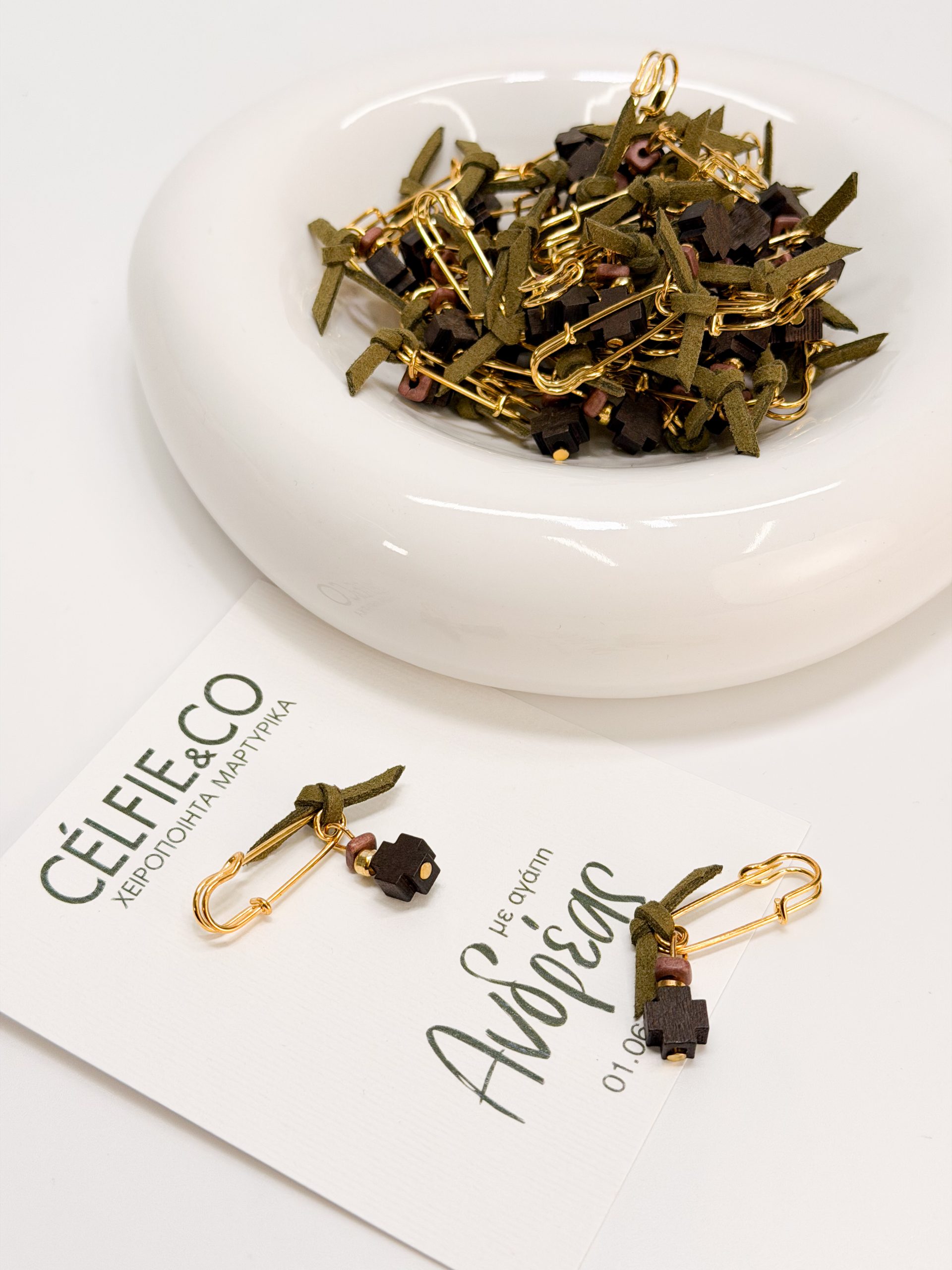 Μαρτυρικό πέτου CELFIE AND CO E-58 με χακί σουετ,καφέ ξύλινο σταυρό και κεραμική ροδέλα.