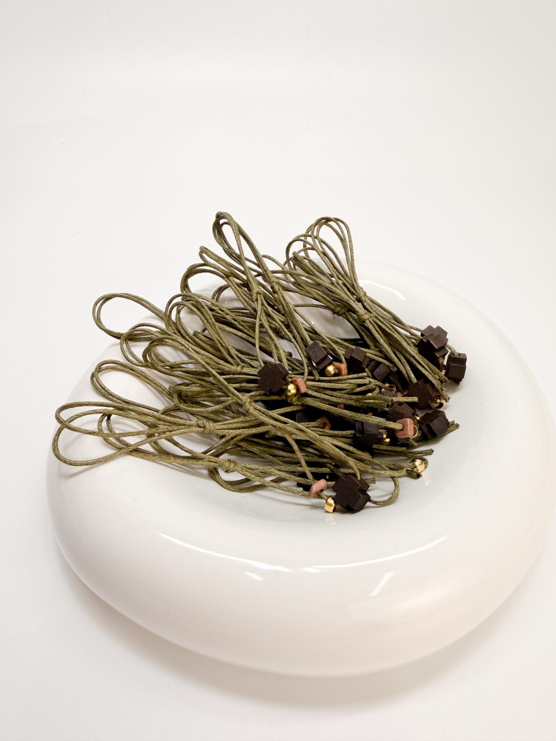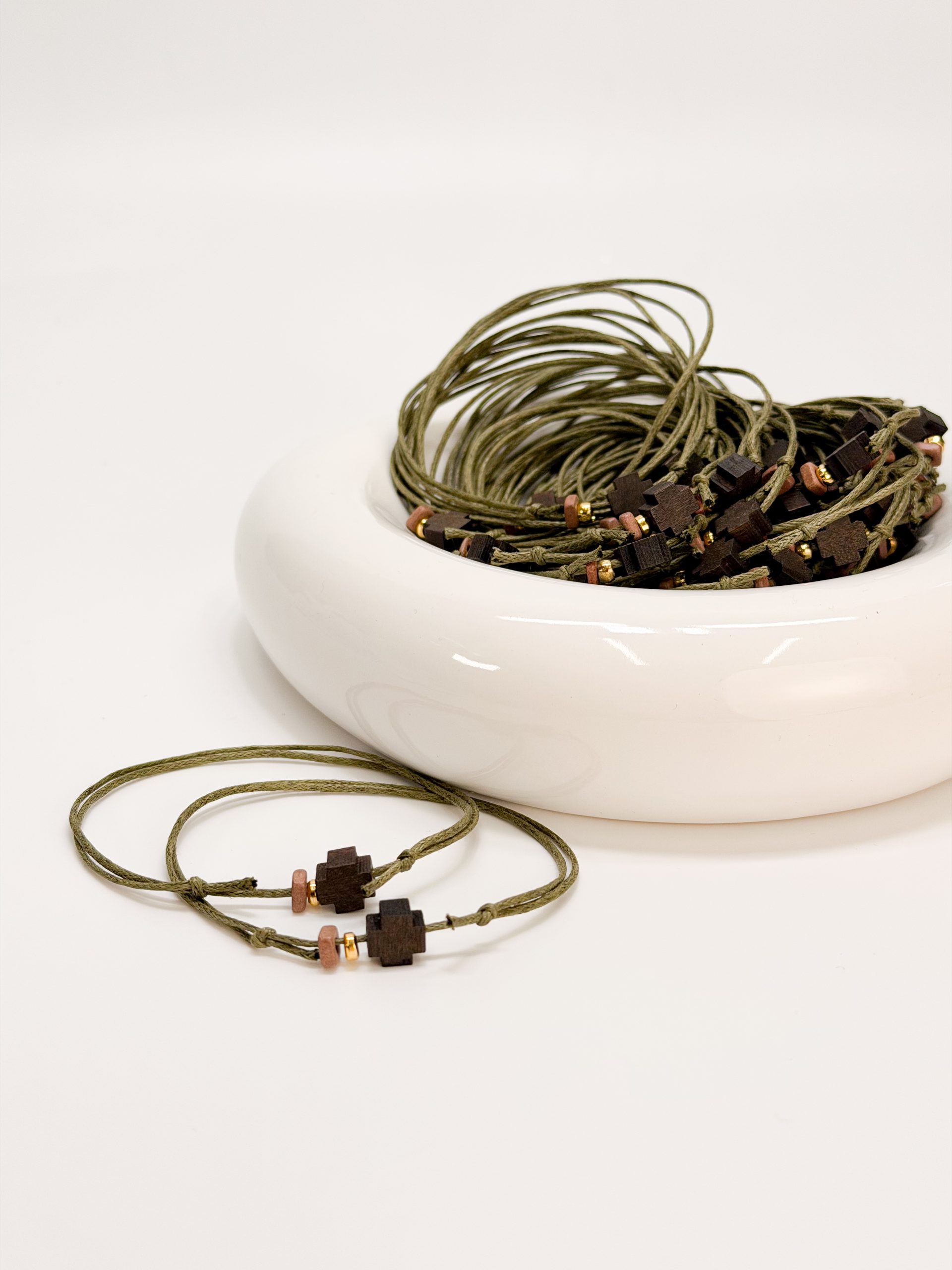 Μαρτυρικό πέτου CELFIE AND CO E-60 με λαδί κορδόνι,καφέ ξύλινο σταυρό και ροδέλα κεραμική.