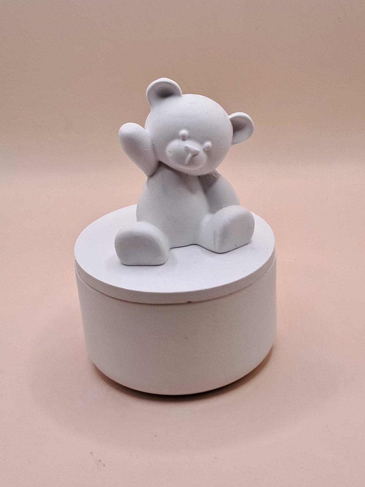 Μπομπονιέρα Βάπτισης Γύψινη στρογγυλή μπιζουτιέρα με αρκουδάκι.